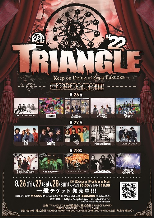 2022年8月26日(金)・27日(土)・28日(日)にZepp Fukuokaにて3日間開催される屋内音楽フェス『TRIANGLE’22 Keep on Doing in Zepp Fukuoka』の最終出演者&日割りが発表された。