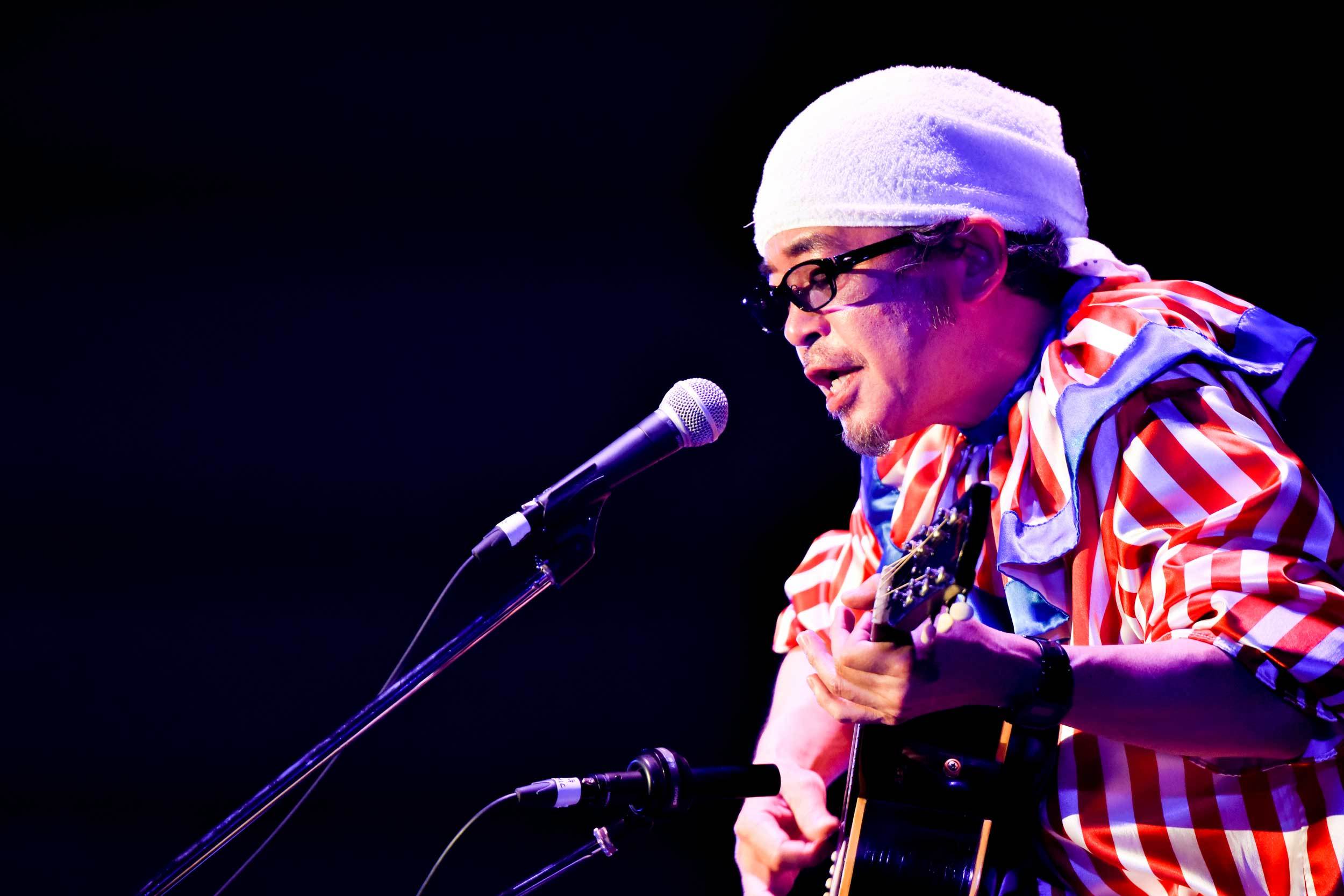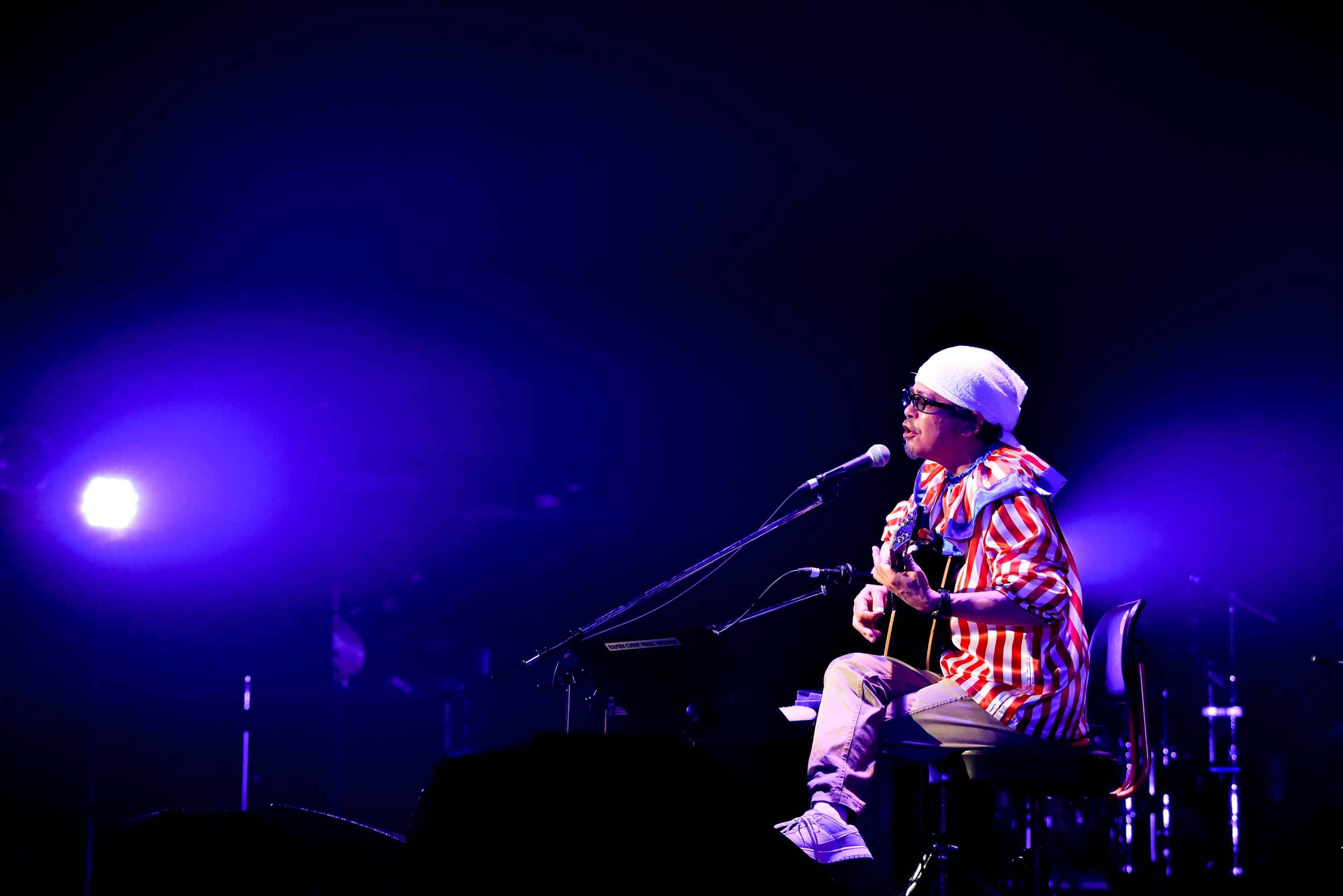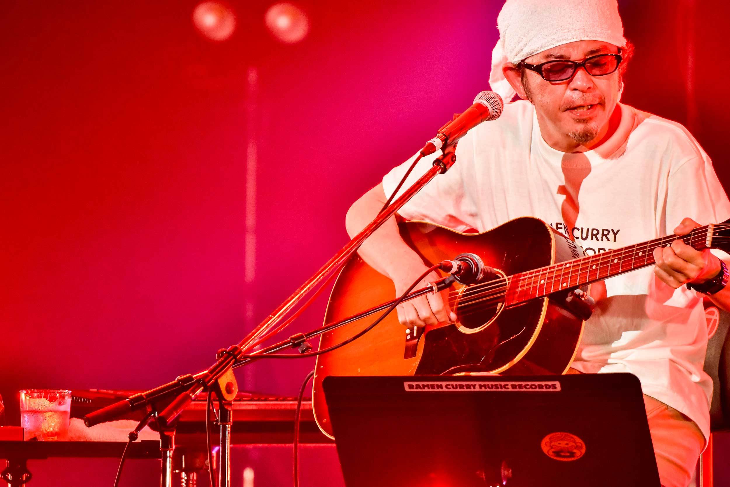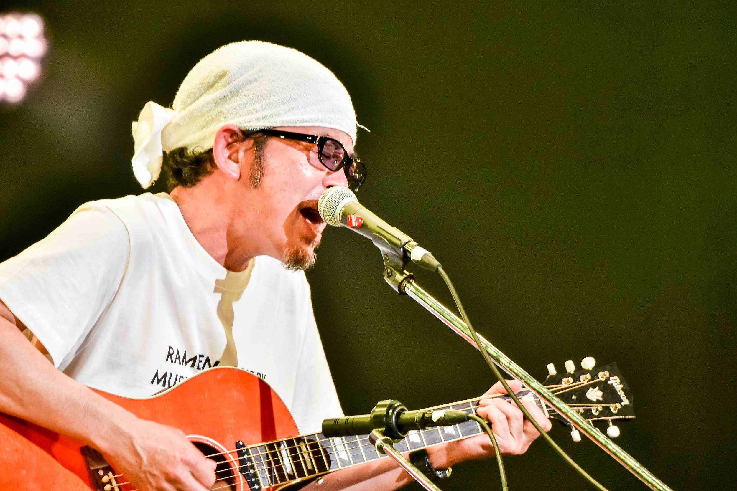 2番手は奥田民生。頭にタオルを巻いたお馴染みの姿で、椅子や楽譜やギターが用意されたお馴染みのステージへと向かう。何故か上着は道頓堀のマスコット人形風の衣装! これまたお馴染みのBGM「ブルームーンギャラクティカ」が鳴る中、手を上げて頭を下げる。弾き語りを始める前の何気ない彼の一挙手一投足を見逃すまいと凝視する観客たち。くいだおれ太郎の衣装にも「もう何かワークシャツとか作務衣とか飽きたと言ったら用意されていて。たぶん、途中で脱ぎます!」と触れ、1曲目はまさかのUNICORN「米米米」。それもメンバーのEBIが歌う楽曲というのもニクい……。そして、当たり前だがひとり弾き語りであるにも関わらず、「はい! テッシ―カモーン!」というメンバー・テッシー(手島いさむ)への呼びかけもたまらない。民生ひとりしかいないのに、UNICORNライブを観ている気になるのが不思議だ。楽曲終わり、そのままEBIとしてMCをしてUNICORNツアー告知もちゃっかりして、「民生に変わります!」と奥田民生としてMCをする。これ何を書いているんだろうと思われるかもだが、こういう細かいユーモア芸にいちいちくすぐられる。この流れで2曲目もUNICORNで「レディオ体操」へ。民生ソロとUNICORNのスタッフが違うため、本番前に「レディオ体操」をスタッフが聴いてから作業確認していたことも明かされる。