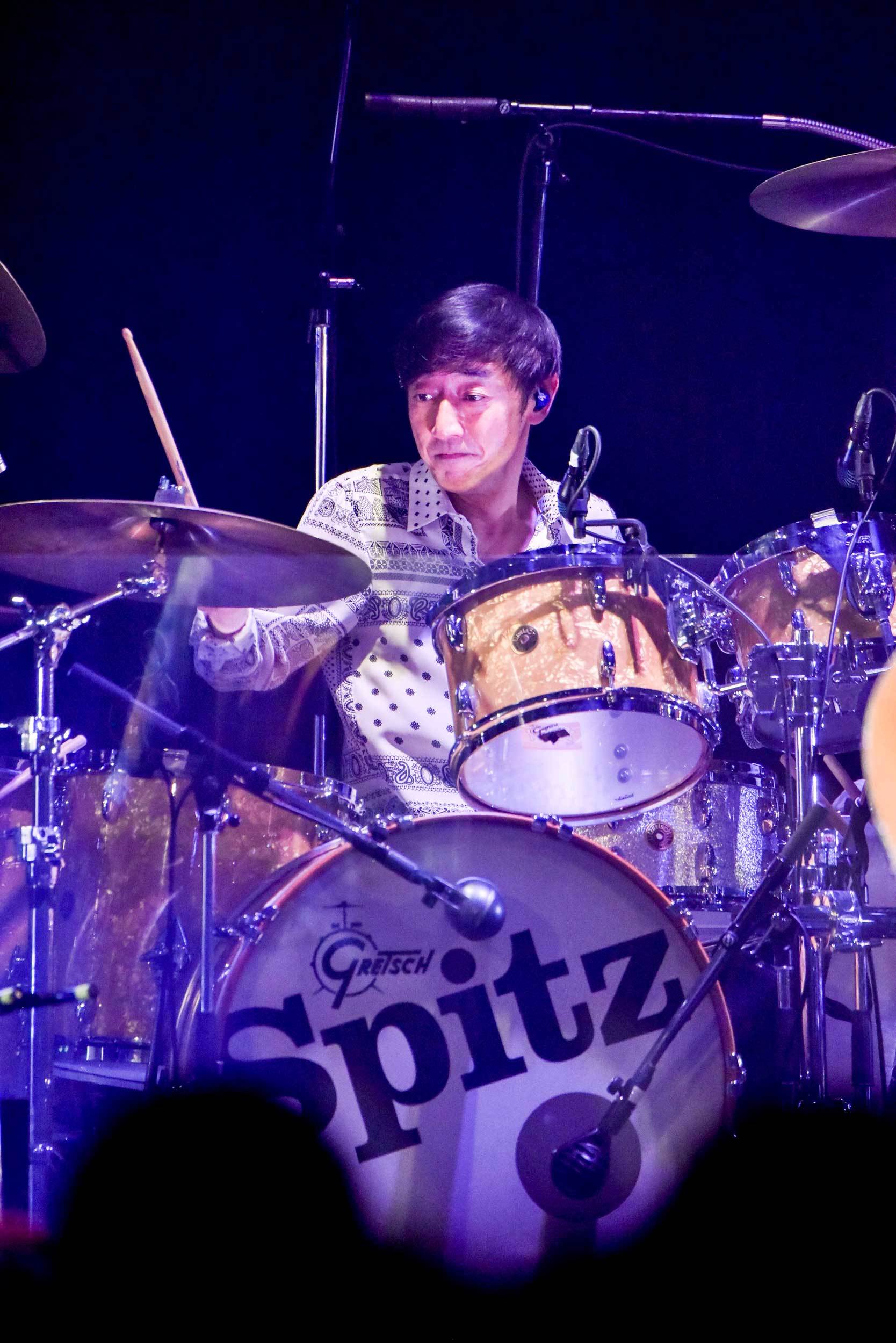 いつも通り、独特のペースで始まり、ようやく3曲目で民生ソロの楽曲として「ロボッチ」が歌われた。ブルージーな歌声に虜になって大満足するが、すぐ、またMCタイムが始まる。予告通り、道頓堀のマスコット人形風衣装の上着を脱ぎ、久々のプラムチャウダー主催のイベント出演だということと、楽屋で観たスピッツメンバーが老人の様だったという小ネタも入れていく。スピッツの草野マサムネが、同じく道頓堀のマスコット人形風衣装のズボンを履いて登場すると勝手な情報を流しつつ、「そういうイベントでしょ?」と言い切る。過去にはプラムチャウダー主催の『ロックロックこんにちは!』に司会だけで出演したことなどを振り返っていく。個人的には、民生やスピッツにより90年代から、音楽の音だけで無く、音楽の楽の部分、つまりは楽しさを教えてもらったんだなと感慨深くなる。僕らは学生時代から、この人たちに大人のユーモアも教えてもらったんだなと誇らしくなった。そして、彼らの音楽が今更言うことでも無いのだが、決して懐かしのものでは無くて、今もかっこいいというのが何とも言えない。それを証明するかの様な新曲「太陽が見ている」へ。