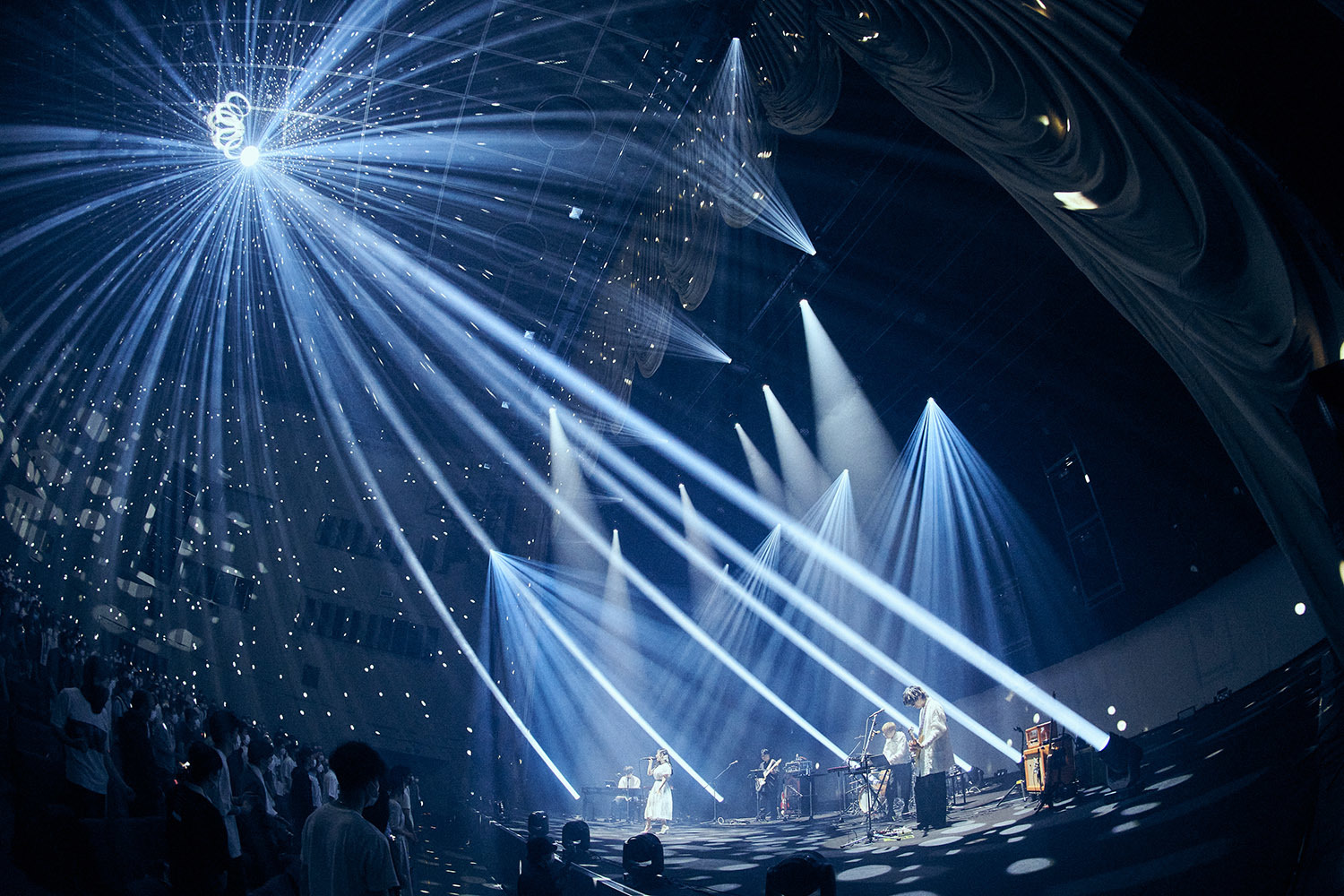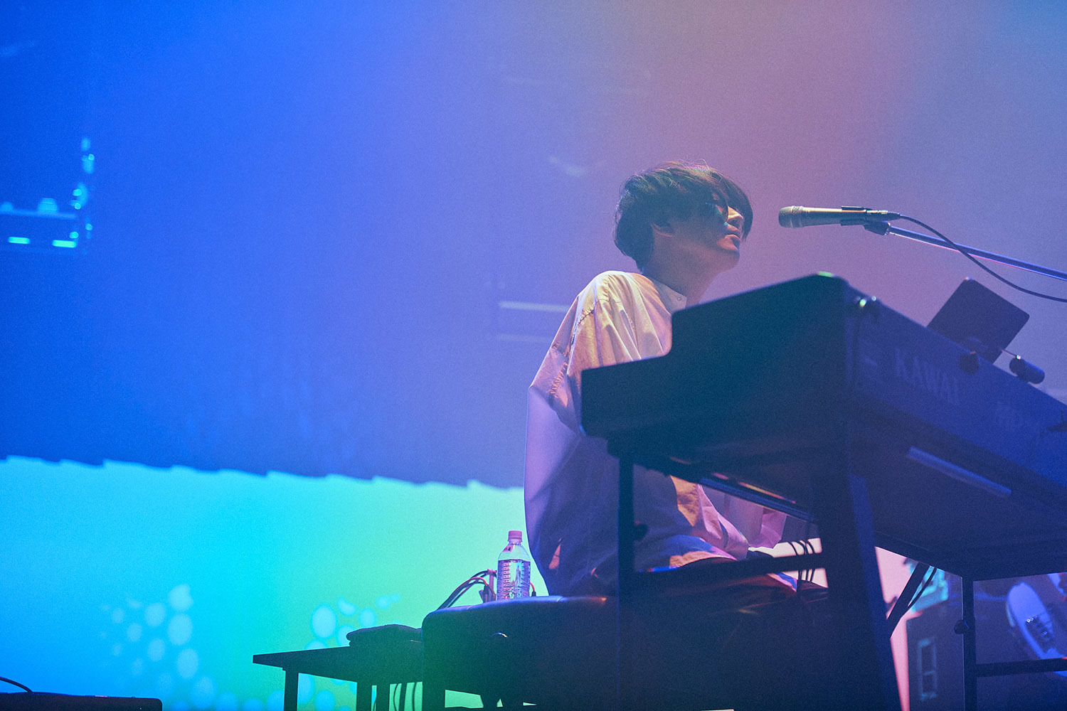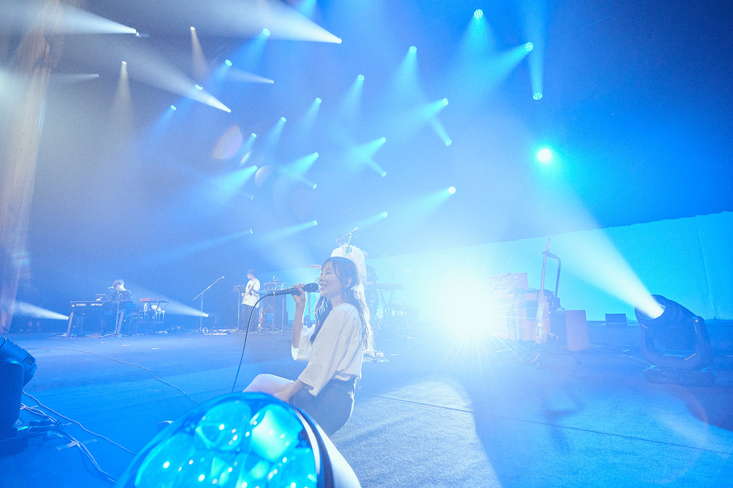 舞台上には照明と楽器のみ。プロンプターはおろか、返しのスピーカーさえも置かれていない殺風景なステージは、これからfhánaによって展開されるであろう空間が、およそ一般的なライブとは違った様相であることを物語っており、中野サンプラザは静かにその時を待っていた。暗転から幻想的な青に包まれ、メンバーたちが姿を現すと場内からは拍手が湧く。yuxuki wagaがギターの弦をはじき、そしてかき鳴らす。あまりにも荘厳で堂々とした登場に、思わず着座で1曲丸々と聴きこんでしまった場内だったが、「Hello!My World!!」のtowanaの軽快な歌い出しが聞こえてくるとスタンディングで応じる。3曲続けて「nameless color」を披露すると、まるで曲の展開のようにドラマチックに、そしてカラフルにステージはライトアップされ、染め上げられていく。