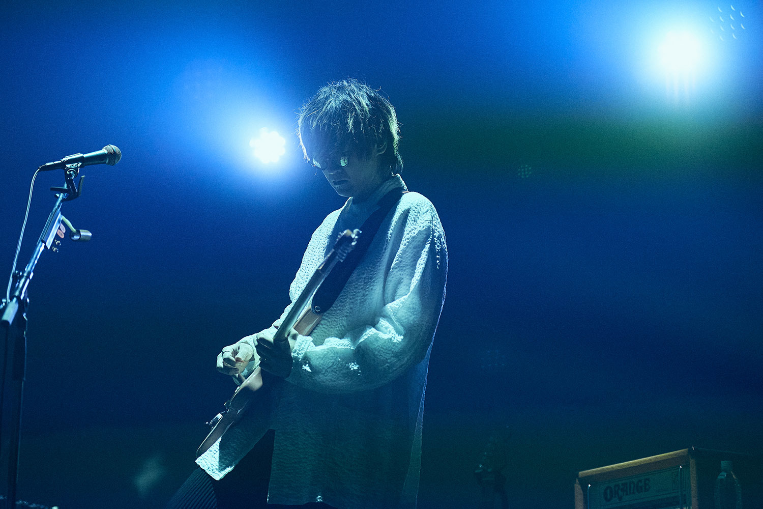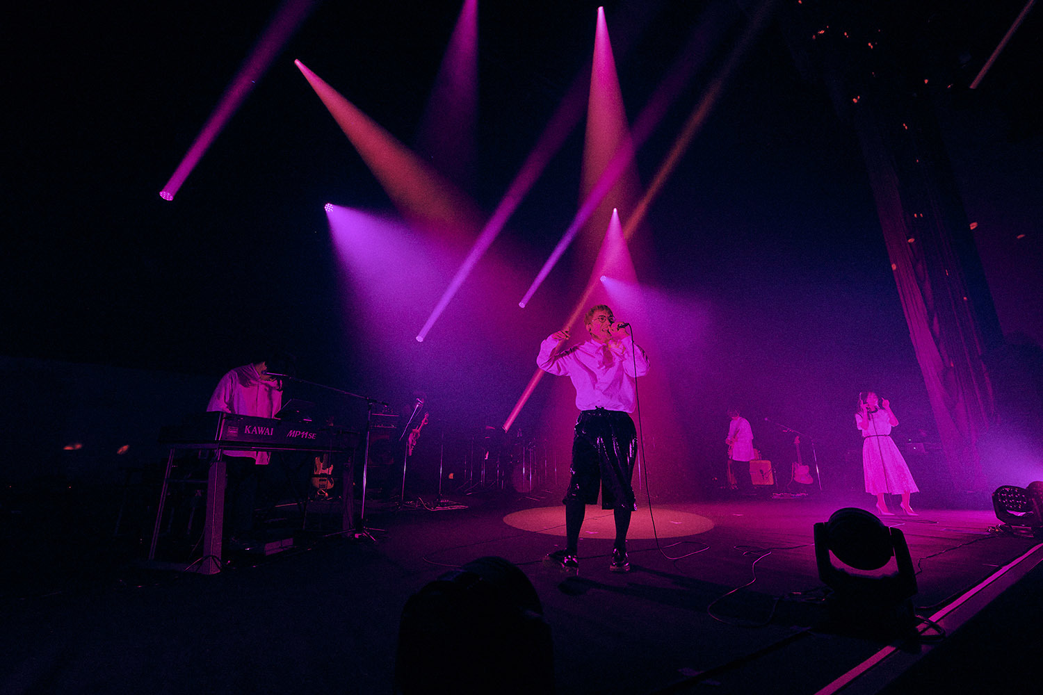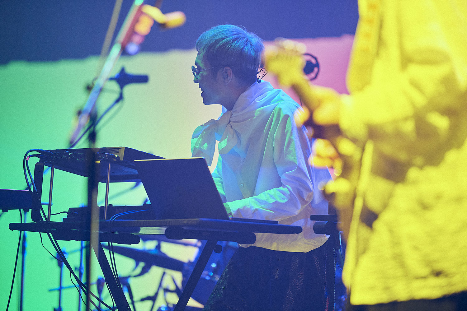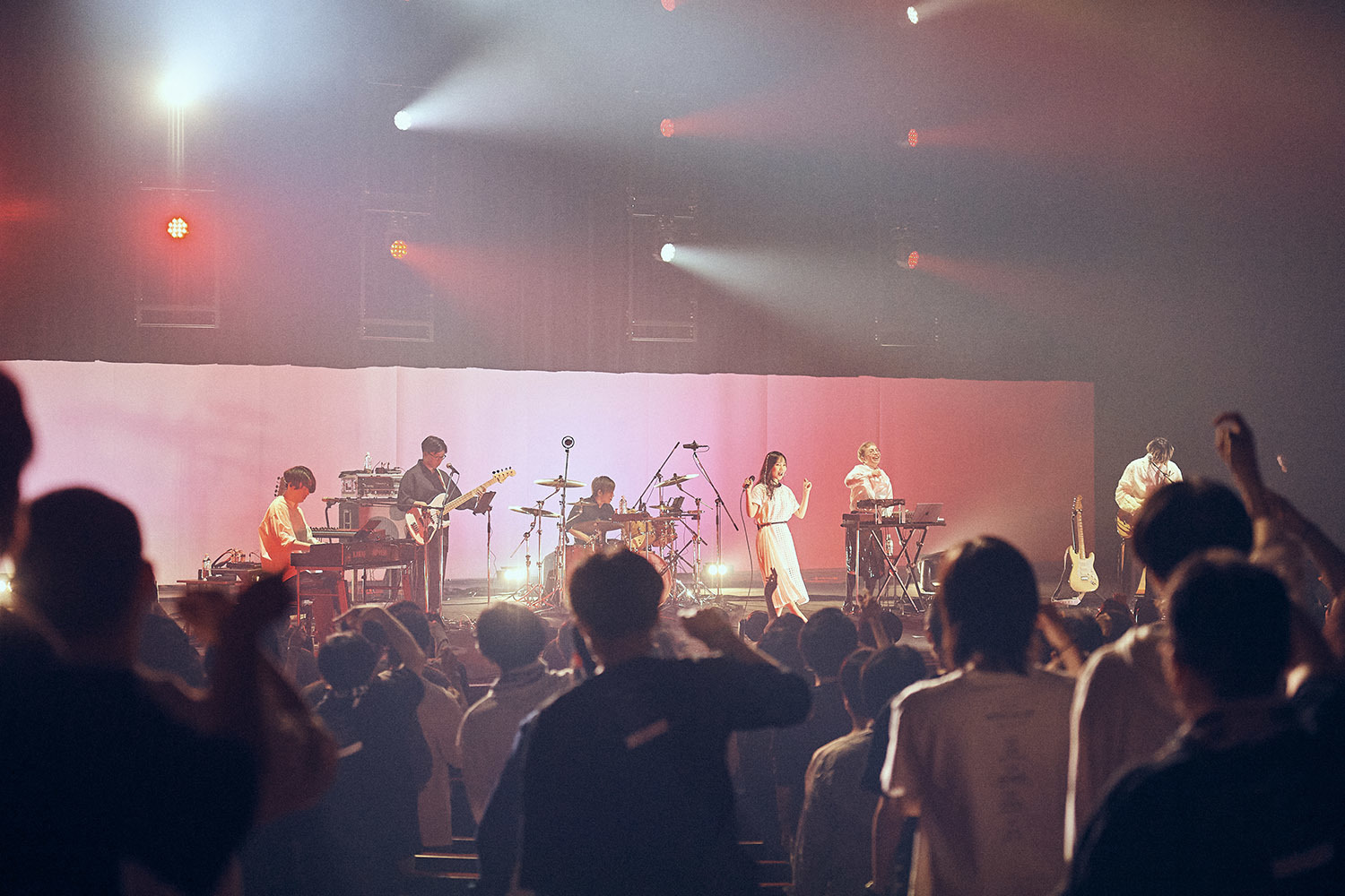 舞台上には照明と楽器のみ。プロンプターはおろか、返しのスピーカーさえも置かれていない殺風景なステージは、これからfhánaによって展開されるであろう空間が、およそ一般的なライブとは違った様相であることを物語っており、中野サンプラザは静かにその時を待っていた。暗転から幻想的な青に包まれ、メンバーたちが姿を現すと場内からは拍手が湧く。yuxuki wagaがギターの弦をはじき、そしてかき鳴らす。あまりにも荘厳で堂々とした登場に、思わず着座で1曲丸々と聴きこんでしまった場内だったが、「Hello!My World!!」のtowanaの軽快な歌い出しが聞こえてくるとスタンディングで応じる。3曲続けて「nameless color」を披露すると、まるで曲の展開のようにドラマチックに、そしてカラフルにステージはライトアップされ、染め上げられていく。