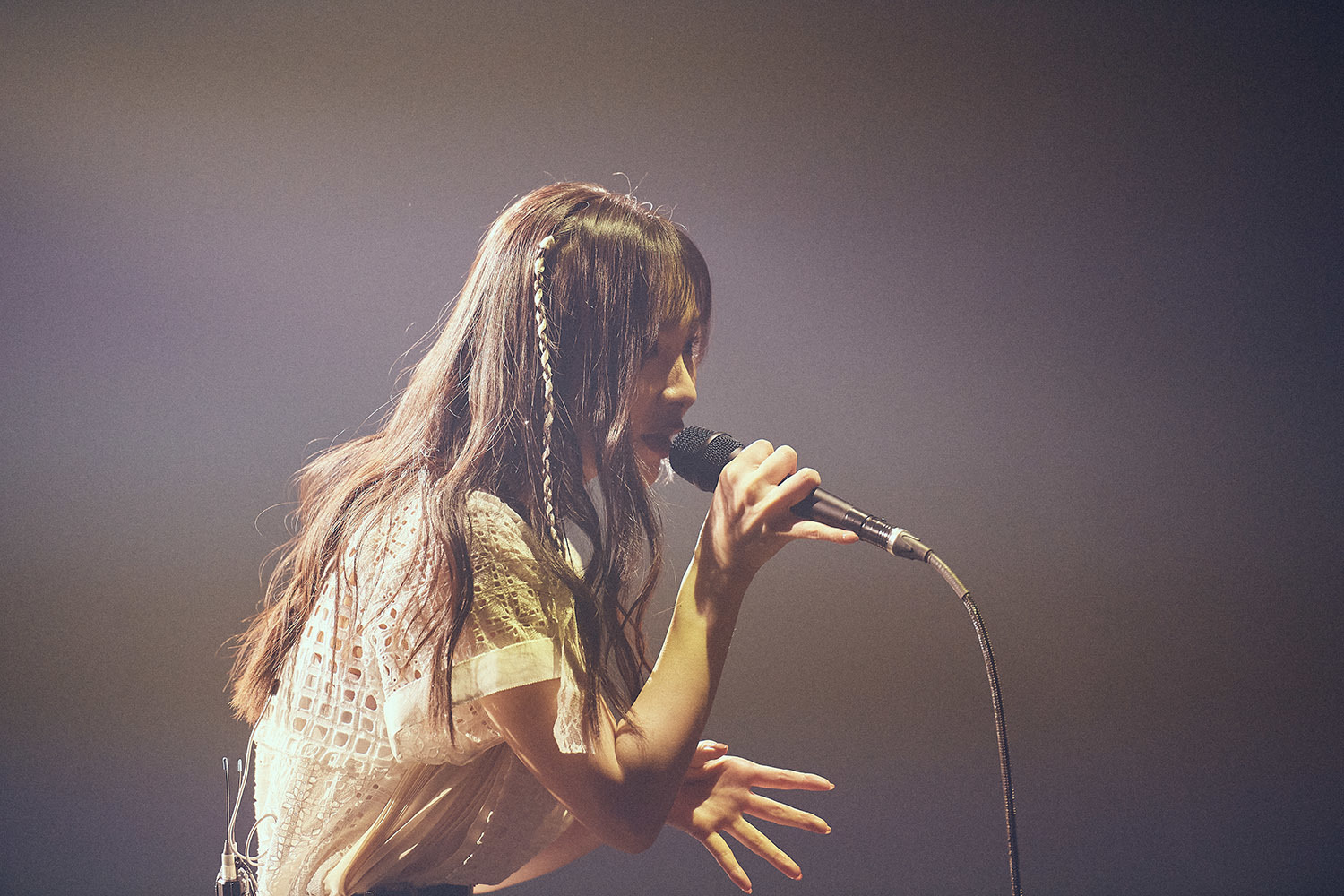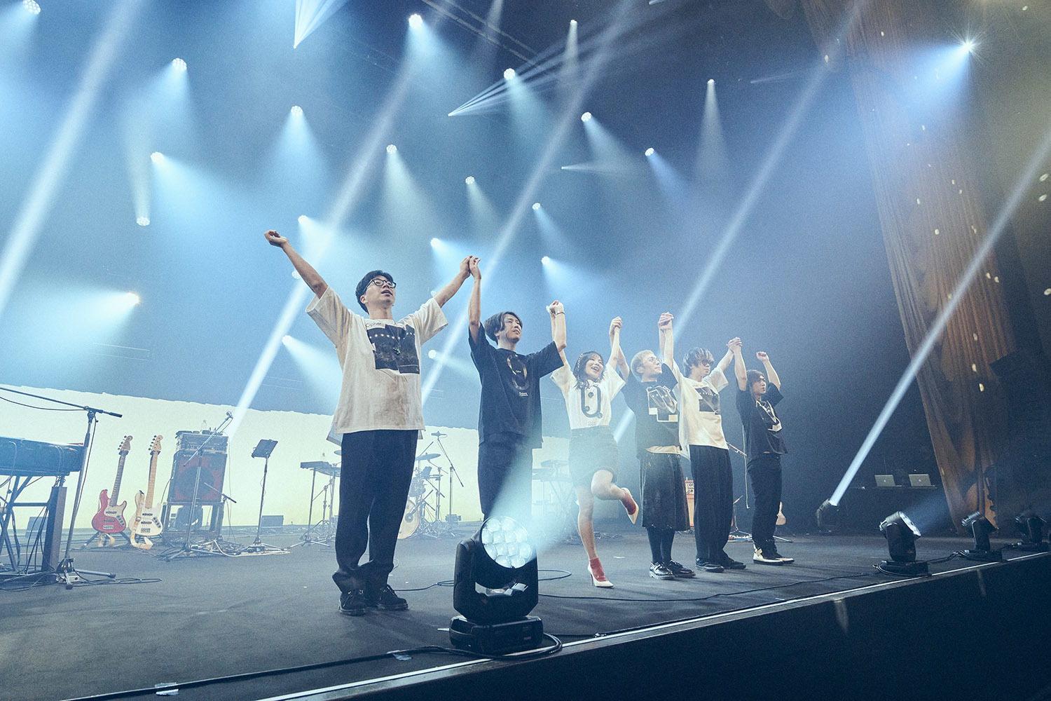 音と光で作り上げていくステージであるからして、特に今回はfhánaをサポートする面々においても特筆すべきであろう。サポートメンバーはベースの前田恭介氏、ドラムに北村望氏が参加した他、「バッキバキの照明」と紹介された小池氏、「舞台袖で見えませんが」とマニュピレーターの沢田氏がMCで呼ばれると、ひょっこり腕だけが袖から姿を見せたが、それだけfhánaにとっても重要な仲間であることが改めて強調され、改めてそんな裏方のスタッフに向かっても大きな拍手が送られる。この時、ステージ上手/下手に向かってきちんとお辞儀をするメンバーの姿にスタッフとの絆を感じずにはいられなかった。そんな真面目なトークの後にはいつもの(?)ゆる〜いトーク(主にリーダーによる)も待ち構えており、雑な「12年目どうすか?」というフリにも「え!?……いや、その振り方はヤバいでしょ」とyuxukiが応じたり、これまたゆる〜い”三戦の構え”のフリに対して完璧な構えで応じるtowanaだったりと語れば長くなるが、ステージは後半戦へと進んでいく。