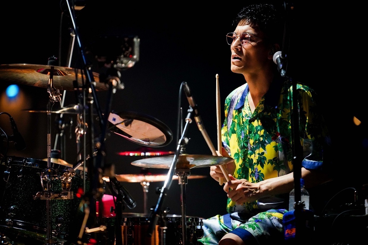 和んだところで、Hayatoが「Lovers soca」の入りのタイミングを間違え、「ライブ楽しいね」という弁解までがMCのセットのようでもあった。ムーディなサマーチューンで大声で発生するHayatoの心境たるや……。ムードは一変、生音ブレイクスばりの変則的なリズムのイントロから「Moralist」。良く動くTaroのベースライン、夏の夜に似合いそうな大人なギターソロも存分に聴かせ、ドーパン流のヒップホップを聴かせる「Stairs」まで、粋なコード感を持った3曲を続けて聴かせた。ブロックごとに趣きを変えつつも、改めてナイスメロディを認識させる選曲だ。