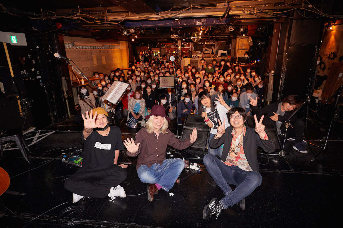 アンコールに応えてまず登場した西村と長澤は、「(直枝のライブの)後でやれること何があるかな」とボヤきつつ、シュノーケルのデビュー曲で長澤が出会った当時から好きだという「大きな水たまり」と、長澤の「マンドラゴラの花」を2人で歌う。いずれも、持ち曲ではない方が1番をフルで歌うという、付き合いの深さが窺える仕上がりであった。そして直枝を呼び込んで最後に演奏したのは、カーネーションの「60wはぼくの頭の上で光ってる」だった。長澤と直枝のギター演奏でゴキゲンにドライブするファンキーなロックナンバーを、西村が「60w」と書かれたフライパンをドラムスティックで叩くことでカウベルのような音を出してコミカルに彩る。最近では珍しくなってしまった対バン形式ならではの特別感を味わえる光景だ。演奏を終えると、「楽しい!!」と叫びながら登場した貴ちゃんを、収容人員からするとビックリするくらい大音量の拍手が出迎え、記念撮影をしてから出演者の送り出し。こうして『貴ちゃんナイト vol.14』は締めくくられたのだった。