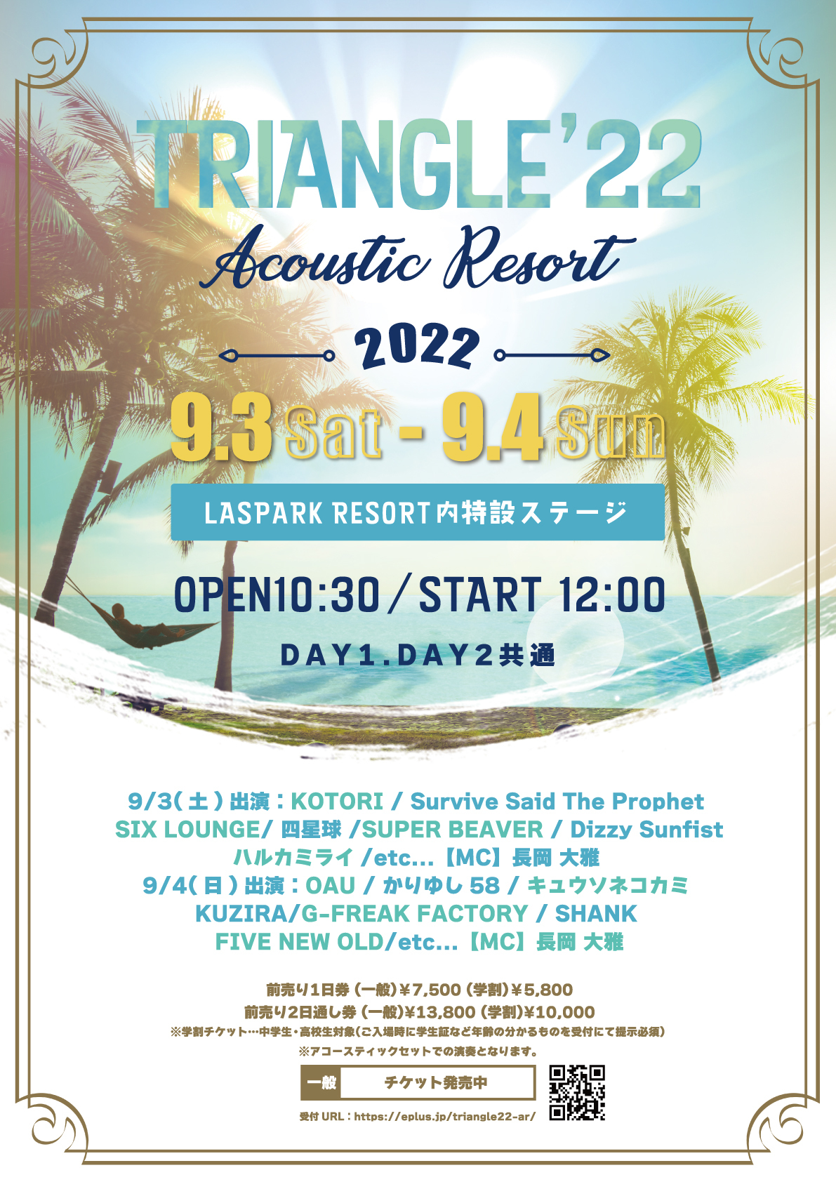 2001年に九州各地を回るイベントとして始まった『TRIANGLE』。2016年からは野外イベントに形を変え、今年で17回目の開催になるが、今年は福岡県糸島市で新しい『TRIANGLE』を開催。「Acoustic Resort」という冠がつき、その名の通り、今年はアコースティックバージョンで行われる。