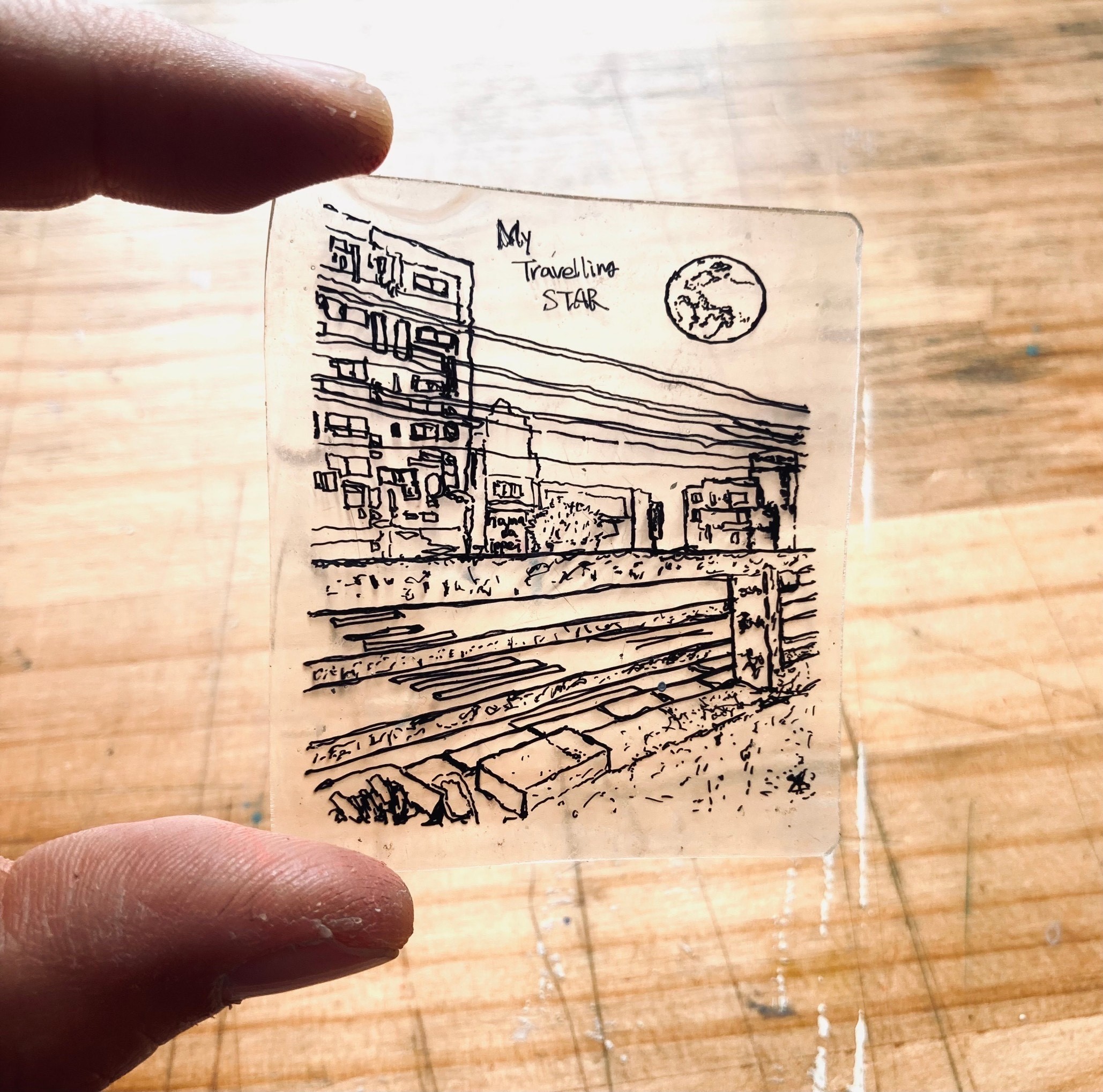 それのMAX状態(笑)。それから親父が家に来て、僕の顔を見て「もう辞めるか?」って……。そこで、半年間ずーっと張り詰めてたものが一気に砕けて、おいおい泣いて。結局、会社を辞めることになったものの、まだ病んでるのでひたすら体が重い。そのときにふと、子どもの頃にプラ板に絵を描いて、トースターでチンしてキュッとなる遊びを思い出したんですよ。なぜか急にやりたくなって、引きこもってちょっとぷよぷよしたヒゲまみれの男が奥さんにプラ板を買ってきてもらい(笑)、当時、住んでたマンションのベランダから見た風景を描いたんです。それは今でも家に置いてますけど、「僕にもこんな絵が描けるんや……」と思った。別に今まで絵を描いてきたわけじゃなかったのにどハマりしてしまって、プラ板に絵を描いてはInstagramに上げるのが生きがいになって。