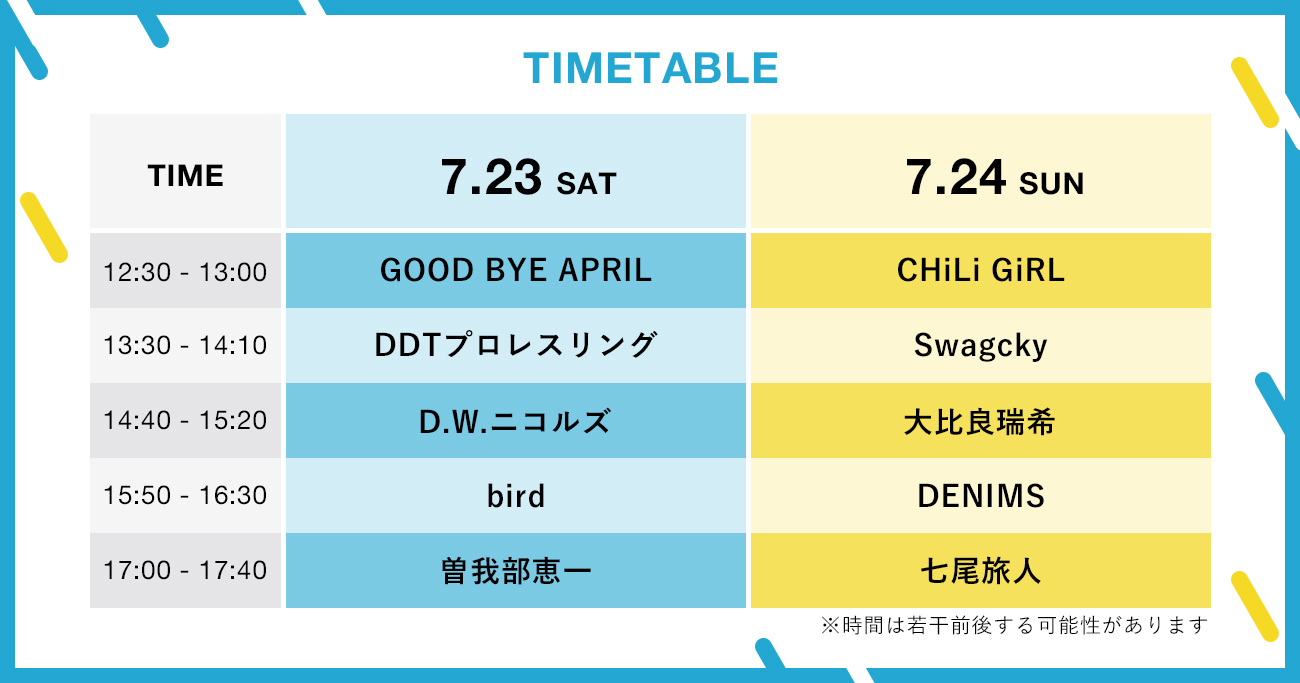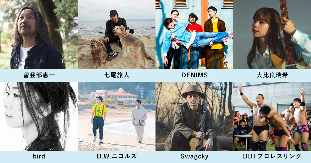この度、HMJの理念に賛同し「ミュージック&プレイエリア」に参加するアーティストとして、曽我部恵一、七尾旅人、DENIMS、大比良瑞希、bird、D.W.ニコルズ、Swagcky、GOOD BYE APRIL、CHiLi GiRLが決定。また、初開催以来、毎回夏のHMJを盛り上げてきた文化系プロレス団体DDTプロレスリングの参戦も決定している。