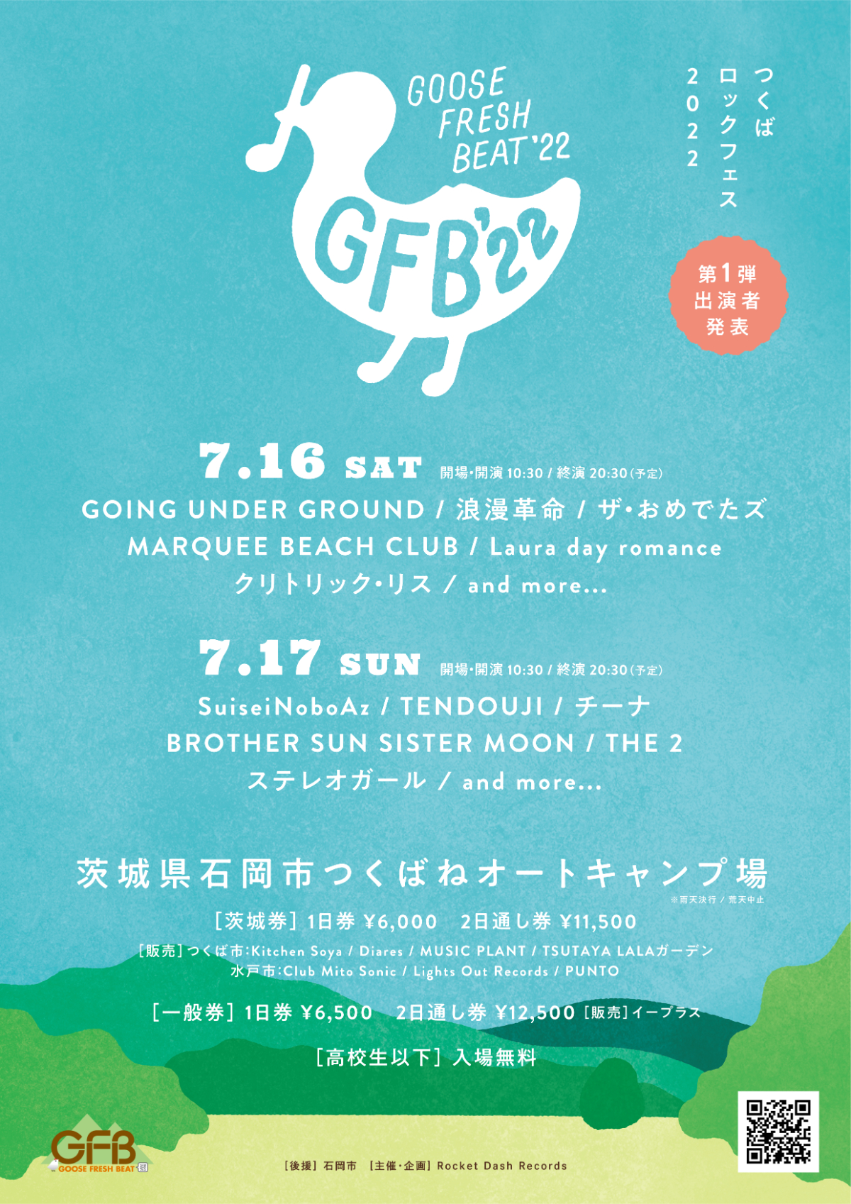 『GFB'22(つくばロックフェス)』は、茨城県の筑波山で行われる野外フェスで、今年で14回目を迎える。出演者は主催者が自らライブハウスに通いオファーし、個性的なバンドからこれから期待のバンドまで揃っている。またこのフェスは茨城音楽の活性化のため、「茨城券」という県内で買えるお得なチケットを販売している。