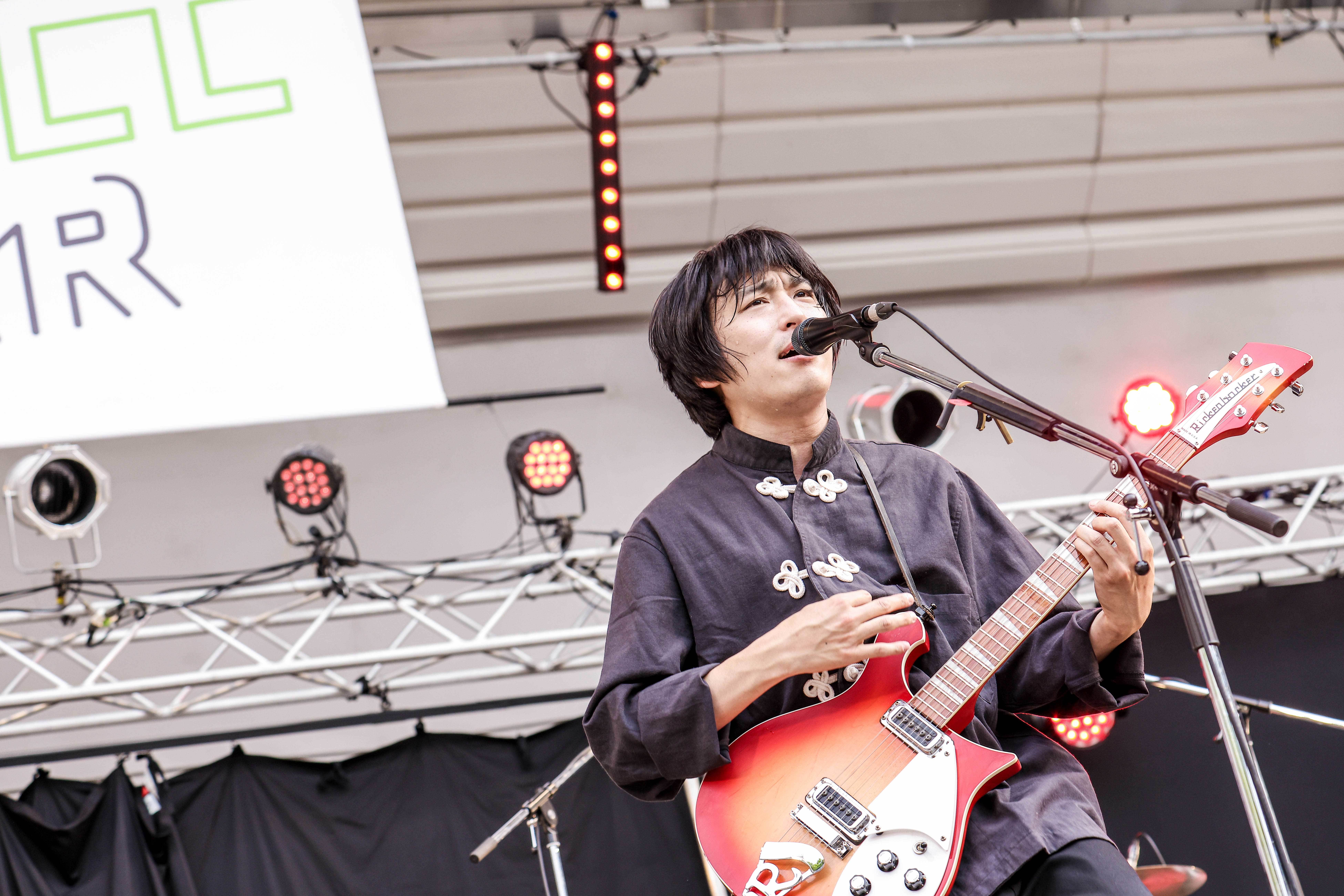 サウンドチェックを終えると、ステージから捌けずそのままライブを始めたのはNEE。彼らもこの日が初野外。1曲目の「アウトバーン」からくぅ(Gt.Vo)の独特の歌声と、ハッキリわかる演奏力の高さでNEEワールドに引き込まれてゆく。「手挙げて!」とのくぅの言葉に全力で応える客席。かほ(Ba)のコーラスが楽曲に彩りを加える。大樹(Dr)のドラムソロが最高にカッコ良い「九鬼」、くぅがシンセを操った「月曜日の歌」では、夕日(Gt)のギターソロも青空に美しく吸い込まれていった。