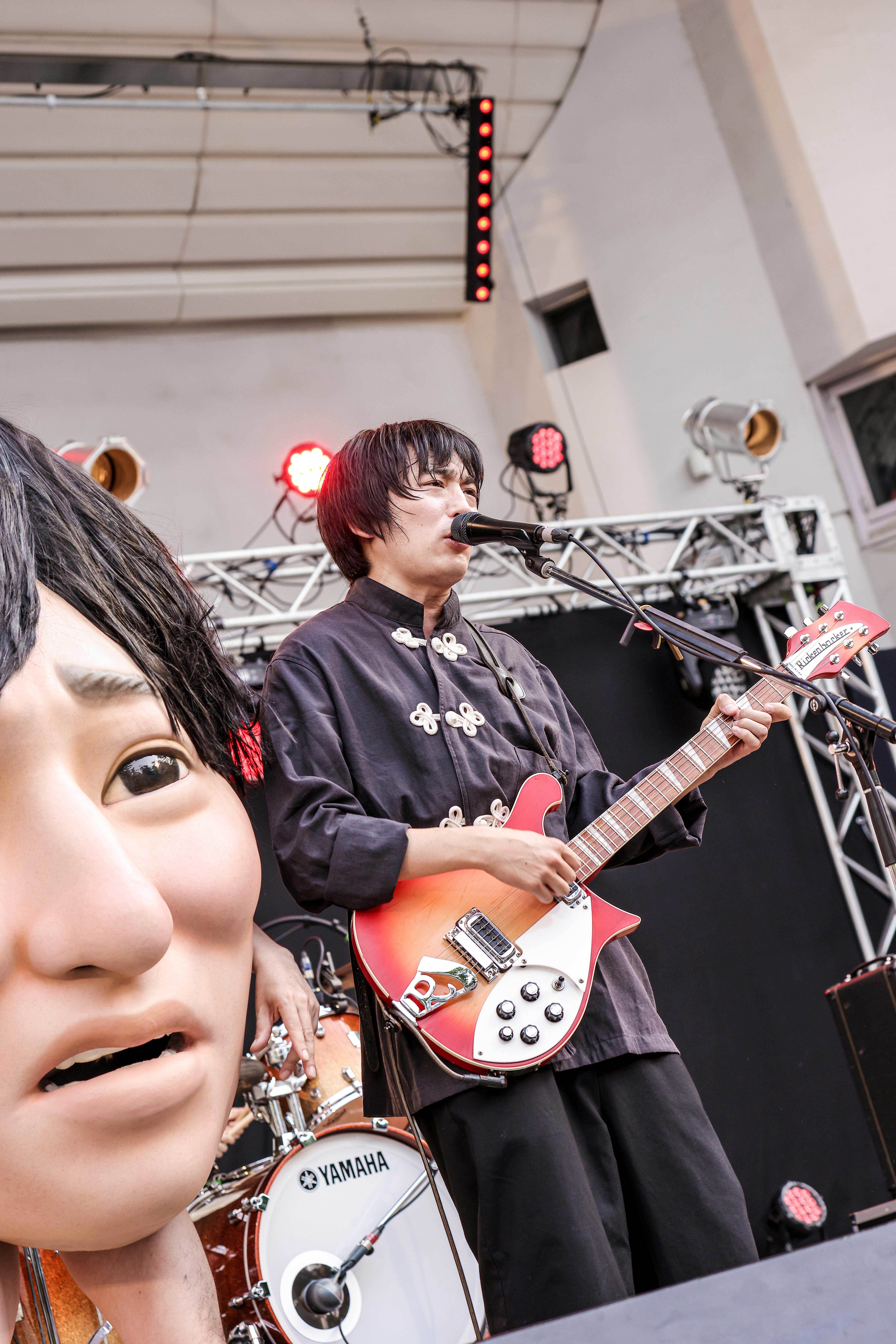 「Family」「ケプラー」「急行電車」と、キャッチーで耳に残る楽曲たちをどんどん披露して会場を魅了する。軽快な加藤綾太(Gt)のギターさばきと、歌川のパワフルなドラムに惚れ惚れしているとあっという間にラストの「恋のジャーナル」へ。「皆さん心の準備はいいですか。どんな野郎が現れようとも微動だにしない心で」と古舘。演奏が始まると、突如ジャケットにも登場している「メガフルタチ」が現れ、会場がどよめく。