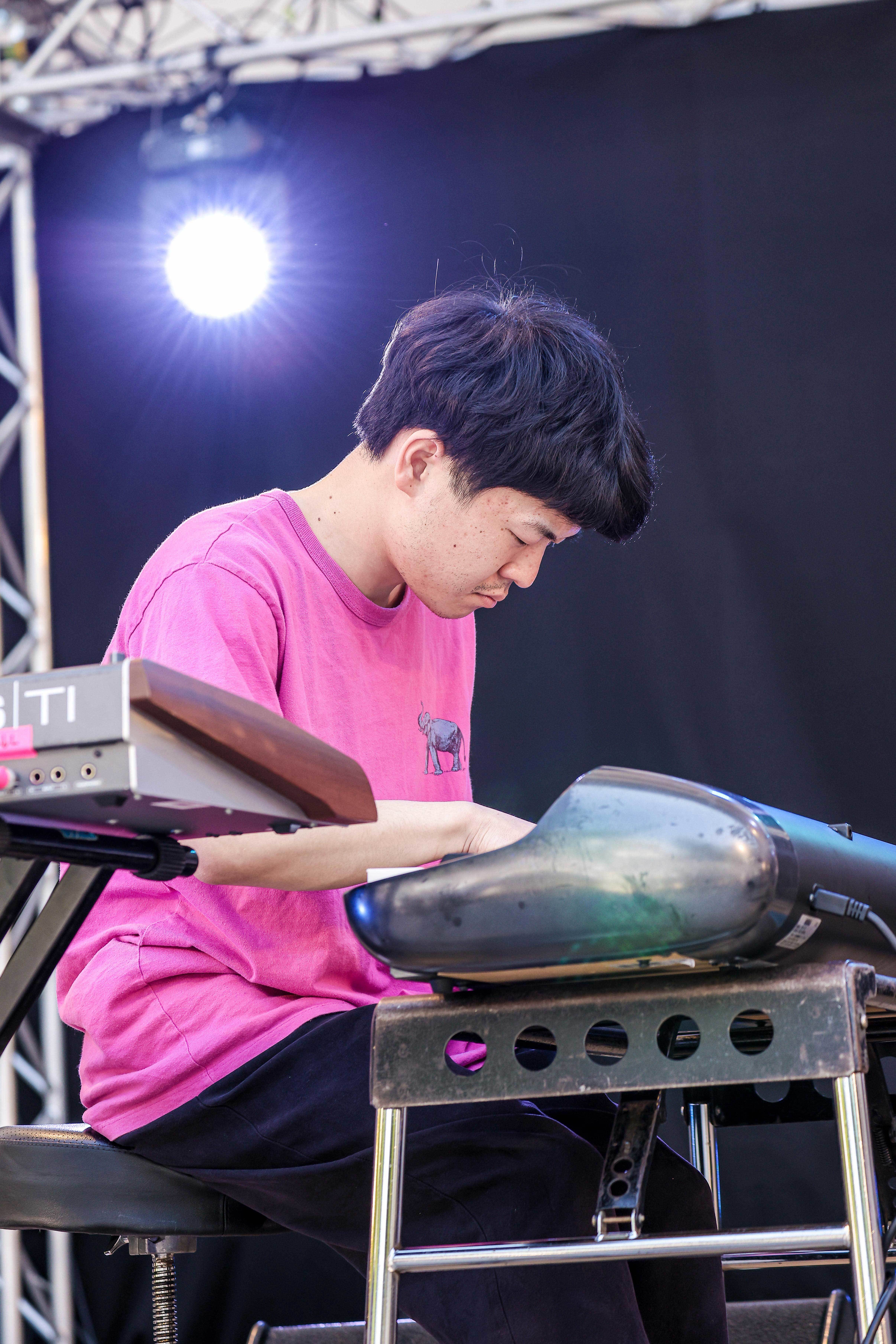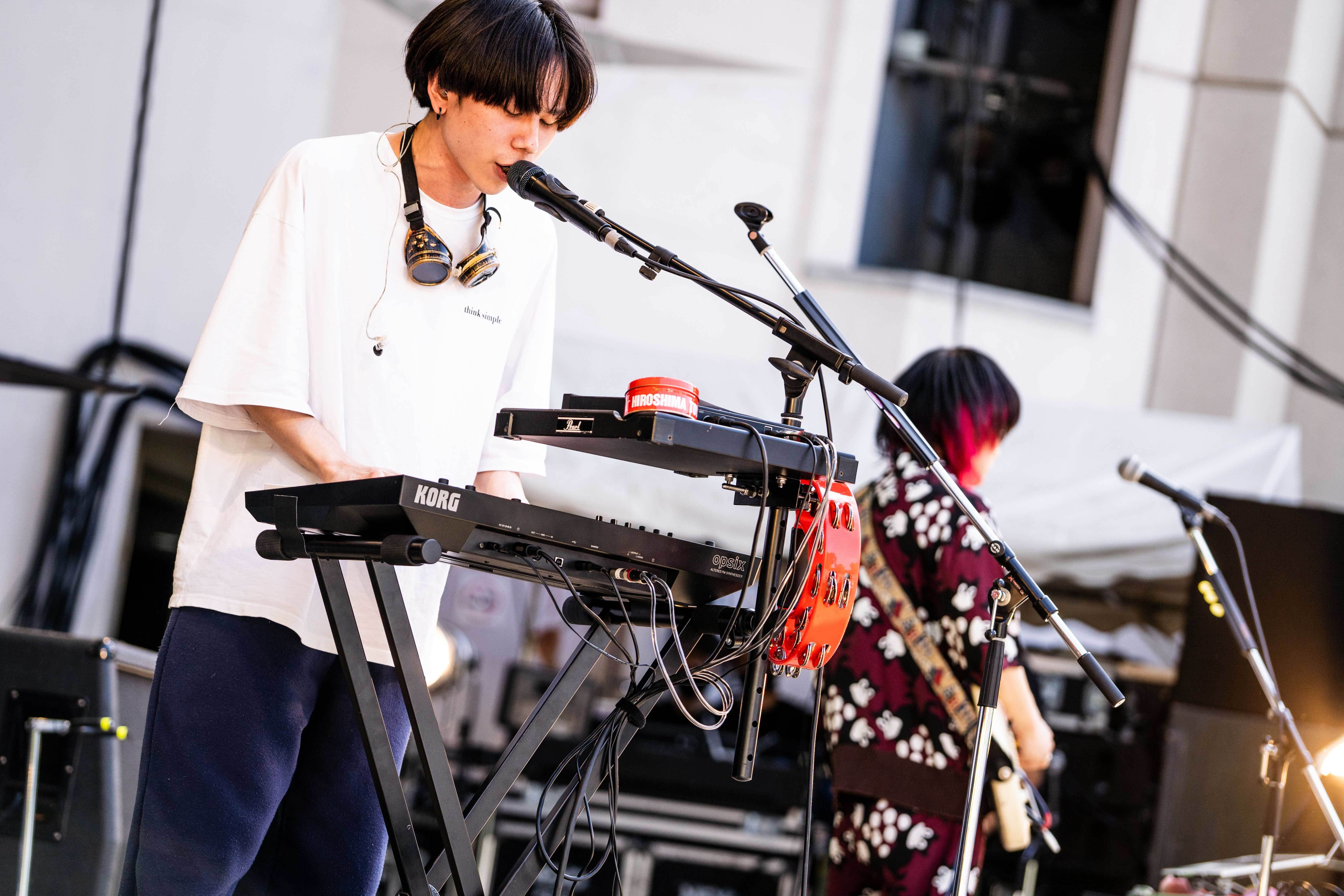 メンバーはステージにいる時間を思いきり楽しむように、大きく動きながら「HOPE」「溢れる、溢れる」をプレイ。MCではこの日が初の野外ライブで、結成3周年の記念日だと明かす。加えて「20歳のうちにこんなライブができて良かった」とえい。サポートの三浦光生(Ba)のベースとかじ(Gt)のギターが印象的に響いた「足りない二人」では、何と2羽のアゲハ蝶がステージの前に現れた。一緒に音楽で遊ぶようにヒラヒラと飛び回る様子は、野外ならではの演出。