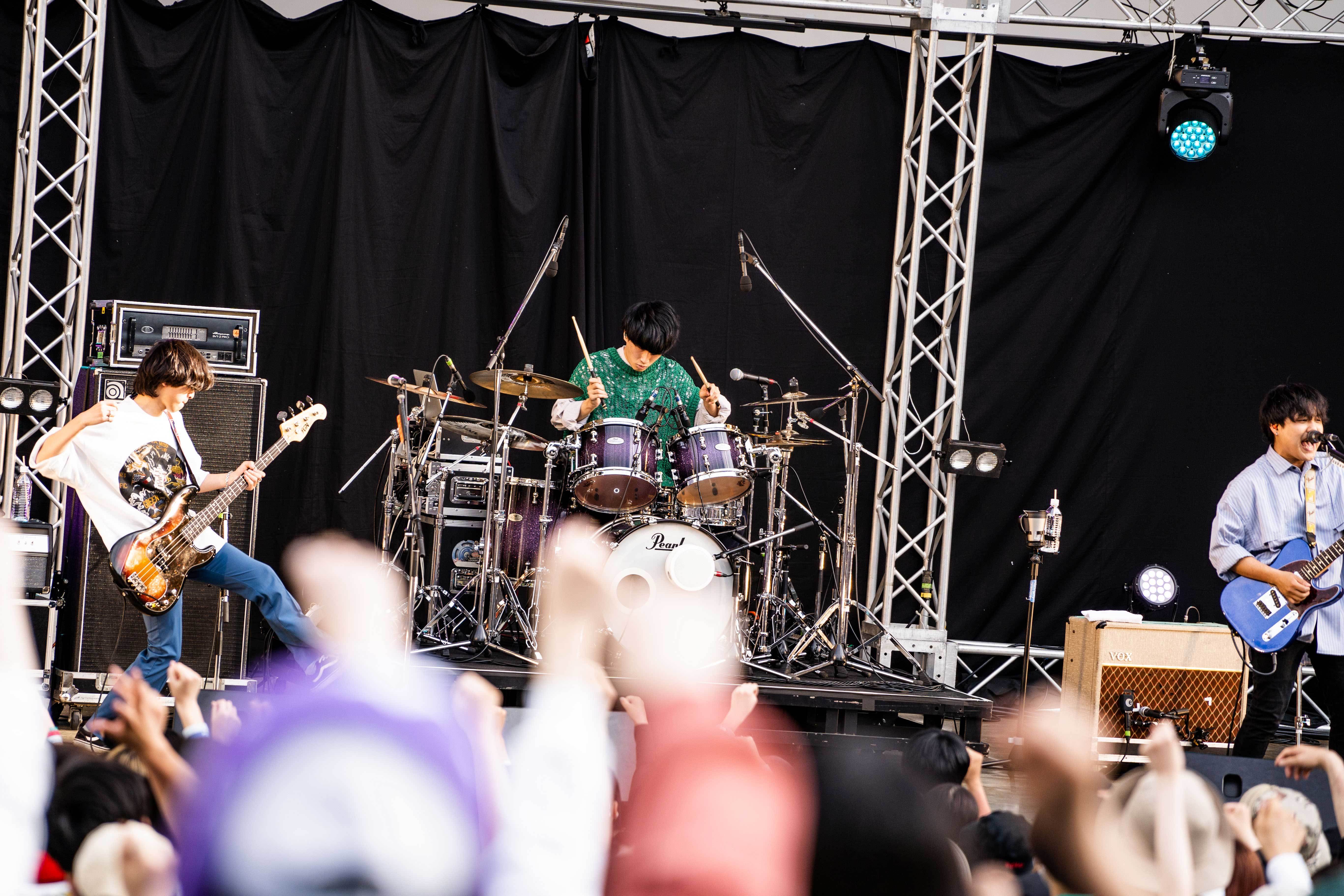 「パンクのライブなんで自分が楽しいように自由に動いてください!」と末武。「Clown」「Muggy」「The Weak」「Sad (Regrets)」を立て続けにぶち込み、パワフルサウンドで駆け抜ける。末武と熊野和也(Ba.Vo)のツインボーカルで魅せる曲もあり、客席はテンションアップ。あどけなさが残る中にも確かな実力が感じられる。メロディアスなギターリフとよく伸びる高い声がとにかく気持ち良く、初見でも一緒に楽しめる力がある。「最高の景色の中で最高の曲たちを演奏できたことを誇りに思います! 『RUSH BALL』の本編当日はもっと気持ち良いのかなあ、出たいなあ(笑)」との末武の言葉にメンバーも笑顔。最後は「Spin」を高くまっすぐ、豪速球で初夏の空に響かせライブを終えた。