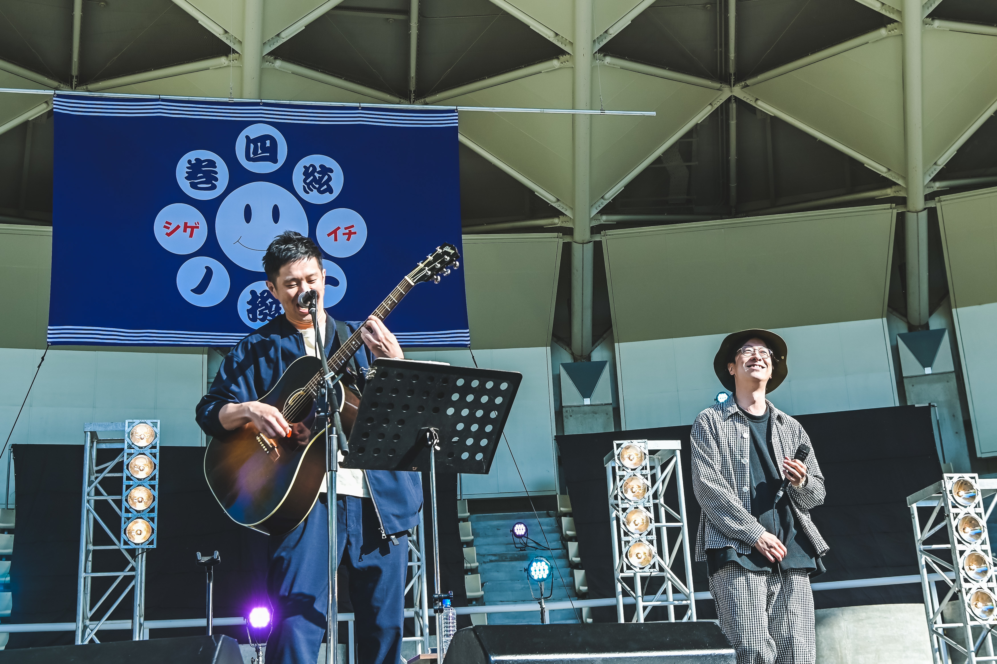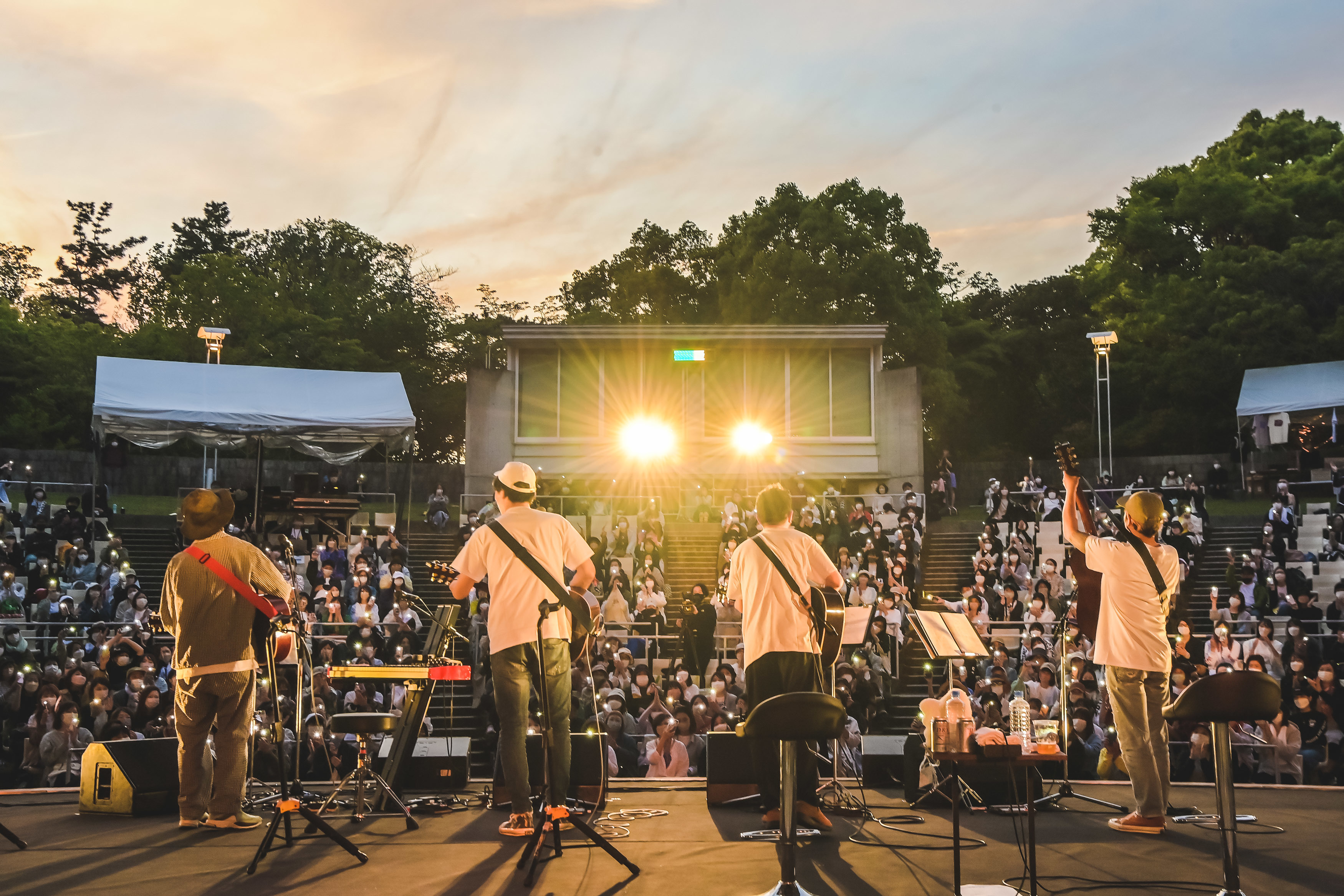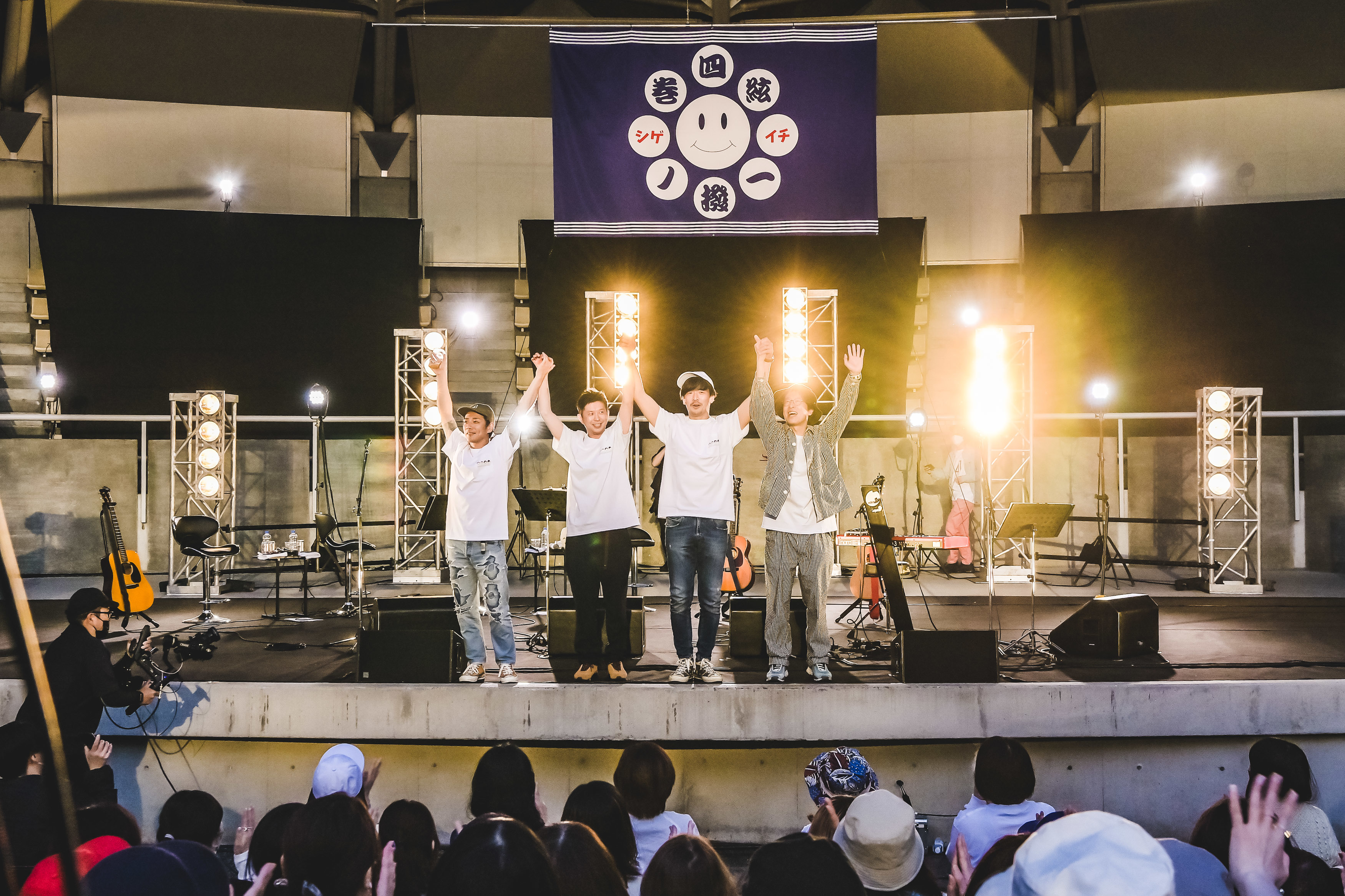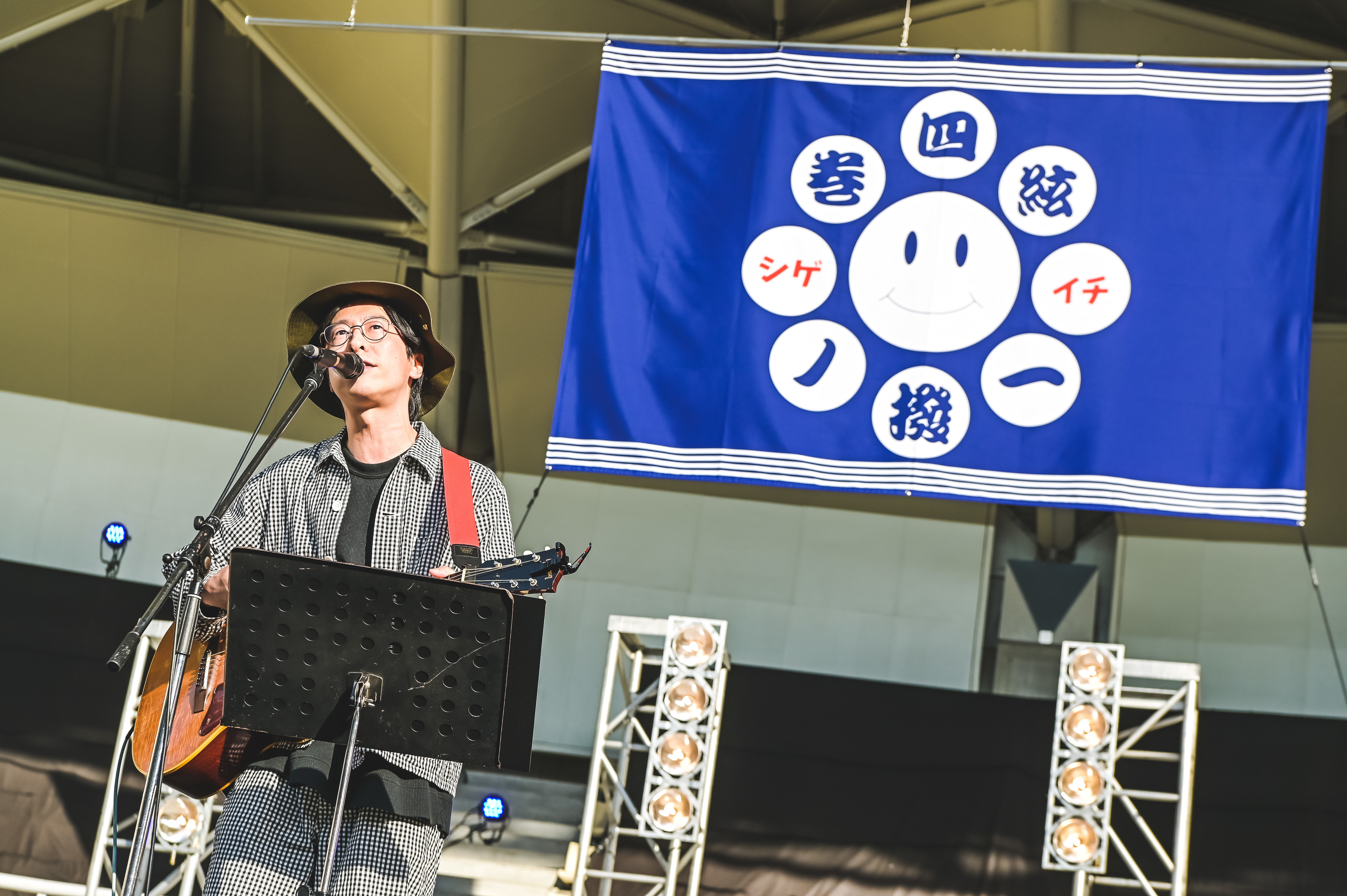 『四絃一撥ノ巻』(通称:シゲイチ)は、2017年に東京・TSUTAYA O-EASTで開催されたアコースティックライブ『虎渓三笑ノ巻』を発端に、2018年から毎年開催されてきた人気イベント。ギターとともに全国各地を気ままに行脚してきた4人がついに大阪へ初上陸した。関西公演は、2019年の神戸以来となり、さらにシゲイチ初の野外開催とあって、眩い新緑に包まれた服部緑地野外音楽堂はお祭りムードに。