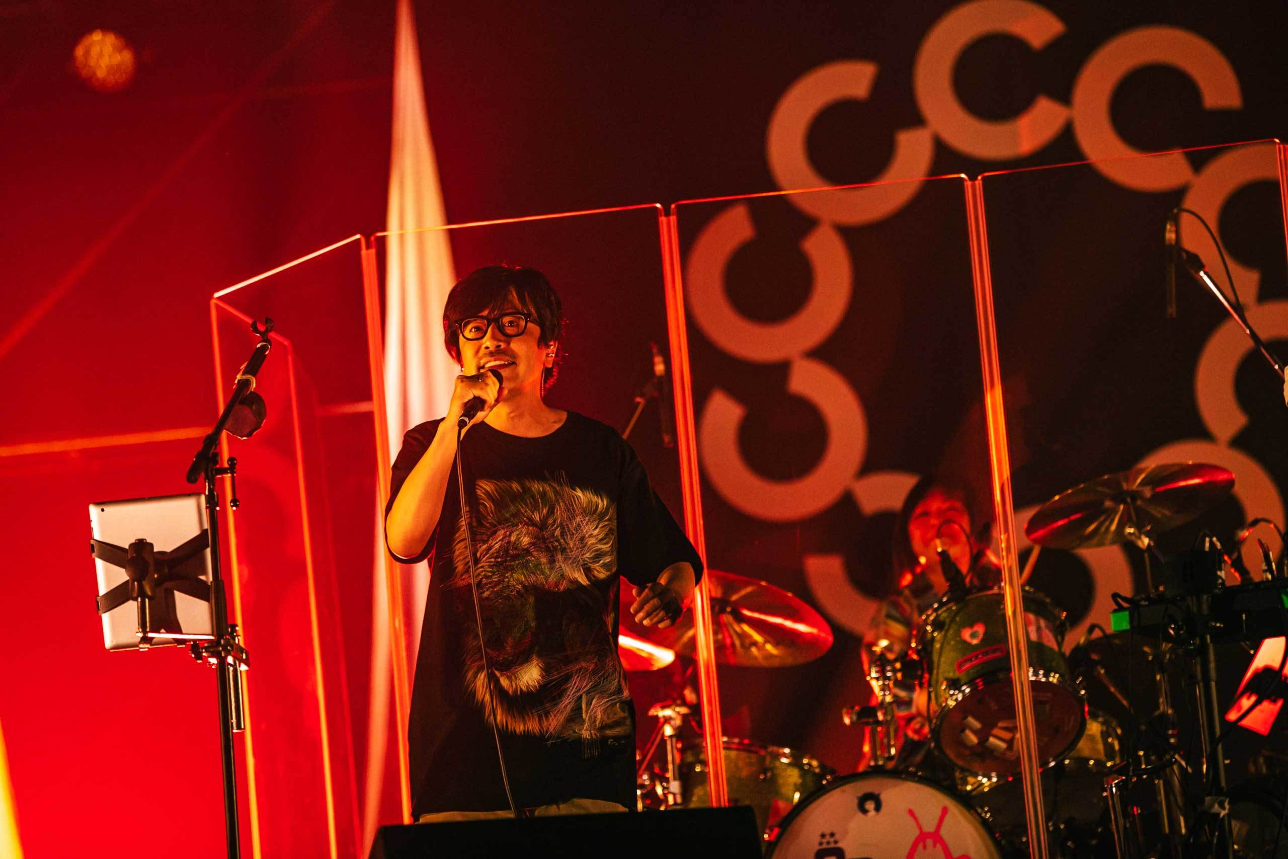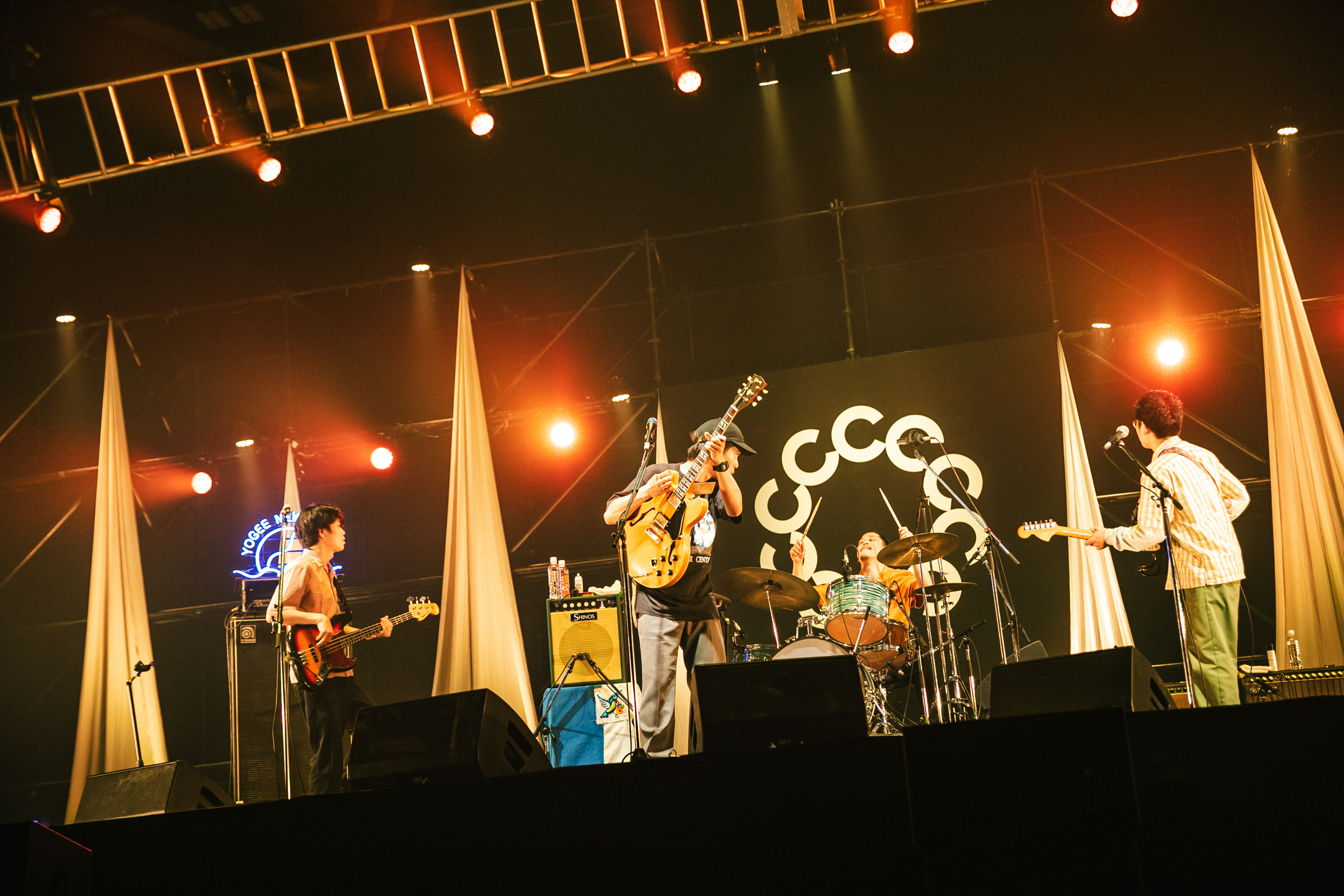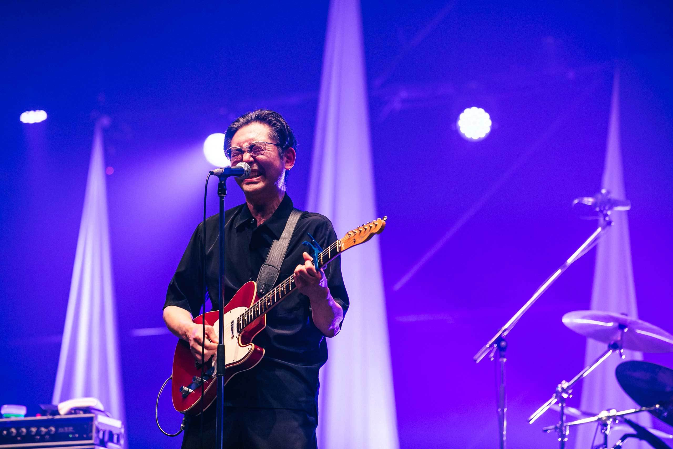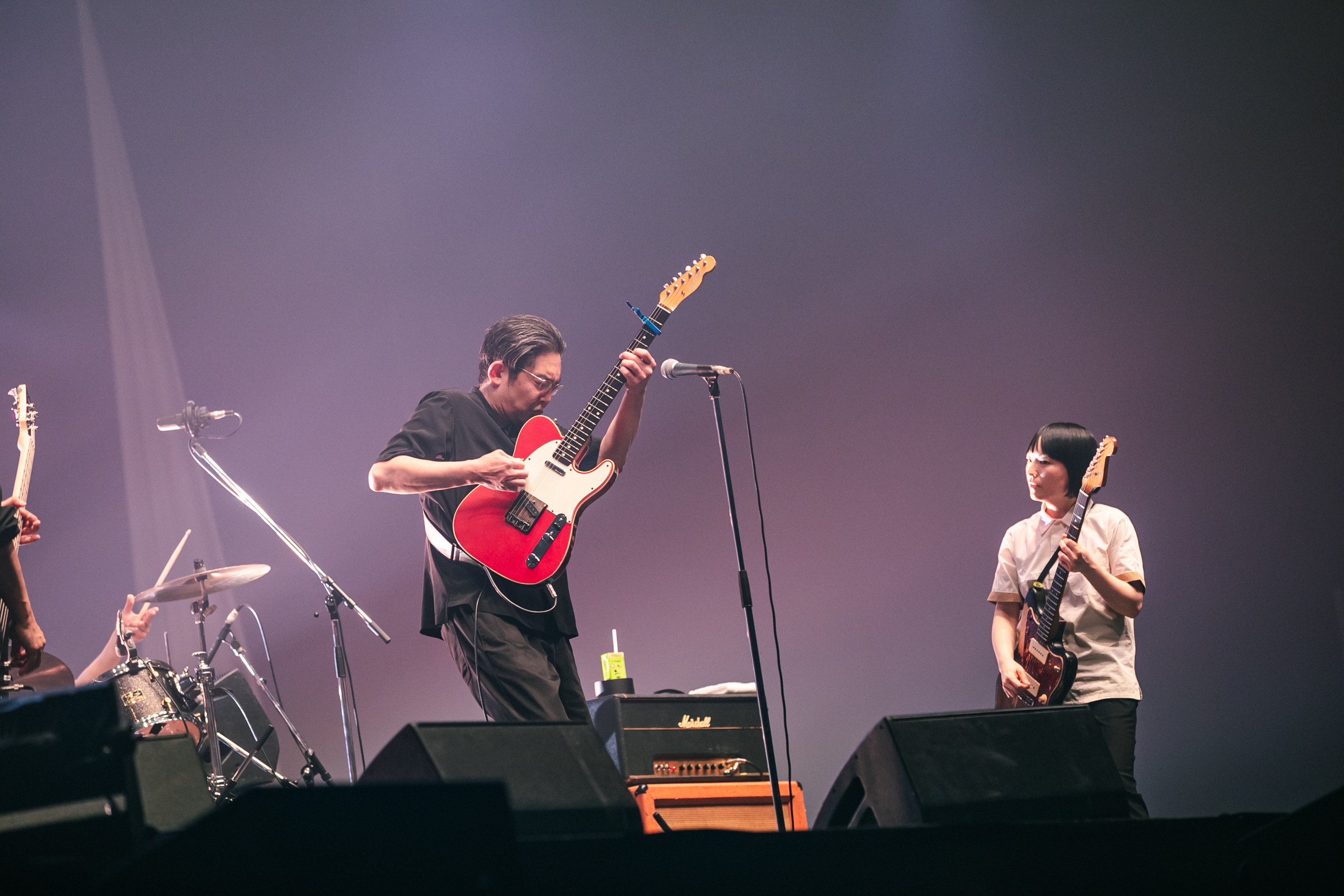 フェスは、往年の人気曲や代表曲を中心にセットリストは構成されることが多い。にも関わらず、この日のサニーデイは「夜のメロディ」、「魔法」としょっぱな2曲のスタートダッシュを2000年リリース楽曲で攻めてきた。いわゆる90年代のフォーキーな、ポップでキャッチな楽曲ではなくて、当時のサニーデイとしては実験要素があった楽曲。このスタートダッシュからしてドキドキしたが、この後の7曲中5曲を2016年~2020年という近年の楽曲で攻めてきたのも凄まじかった。間違いなく今の自分たちに自信があるからこそできる構成。ラストの「サマー・ソルジャー」も96年リリースのシングル楽曲といえ、6分を超える壮大なミドルナンバーで、当時も話題を呼んだ攻めたナンバー。とにかく自分たちのやりたいことを全力でぶつけてきた。ほぼMCもなく、曽我部が声にならない様な声でシャウトしたり、「『CIRCLE』~! 良かったね! 来たかったよ!」と極力シンプルな言葉で、逆に強い想いが際立って感じた。