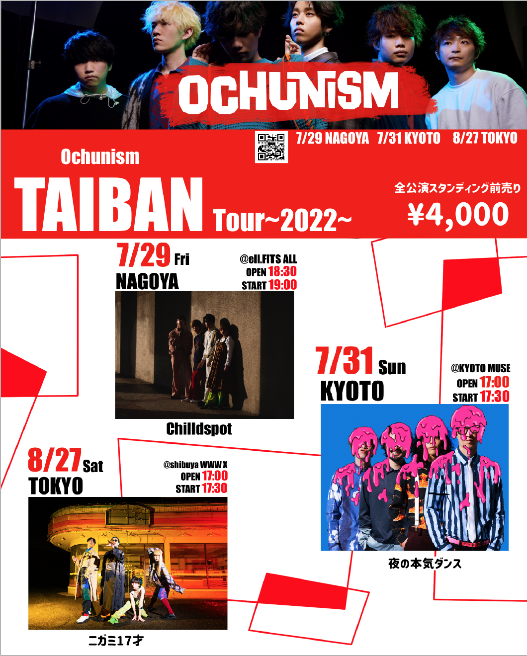 対バンツアー企画はOchunismにとって結成以来初の試みで、今回は名古屋、京都、東京の3都市での開催が決定。ゲストアーティストは、ツアー初日・7月29日(金)名古屋ell.FITS ALLにchilldspot、7月31日(日)京都MUSEに夜の本気ダンス、そしてファイナルとなる8月27日(土)渋谷WWW Xにはニガミ17才が出演する。