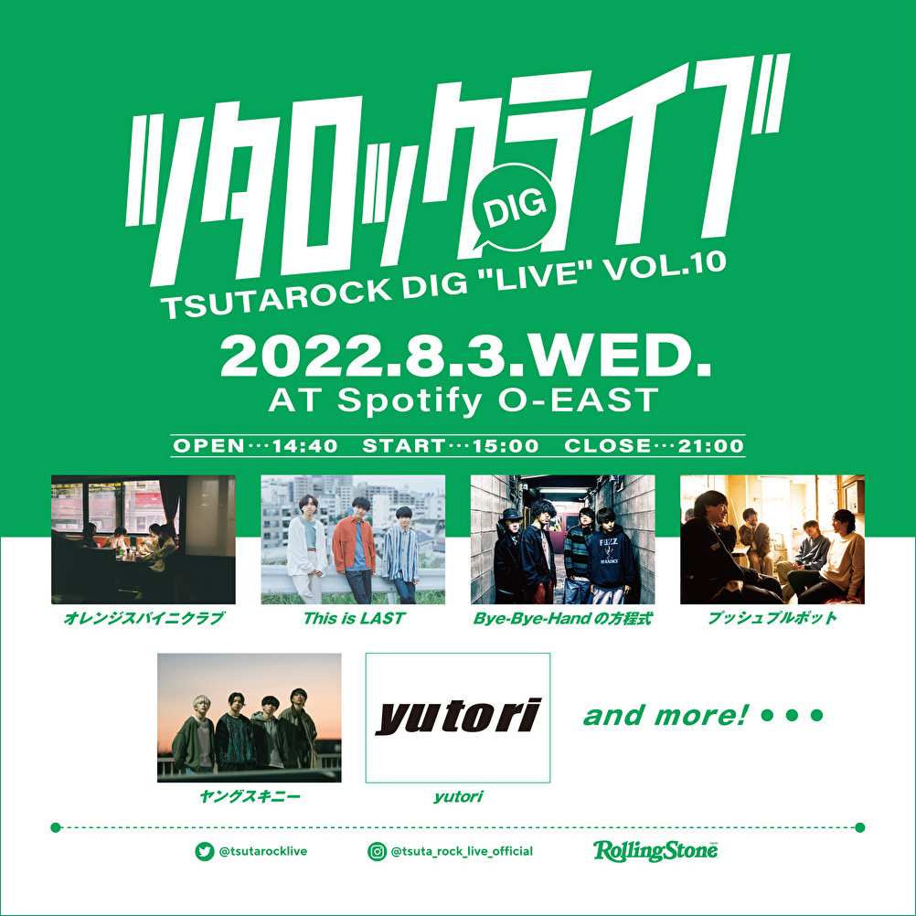 8月3日(水)にSpotify O-EASTにて『ツタロックDIG LIVE Vol.10』が開催。出演者に、オレンジスパイニクラブ、This is LAST、Bye-Bye-Handの方程式、プッシュプルポット、ヤングスキニー、yutoriの6組が決定した。