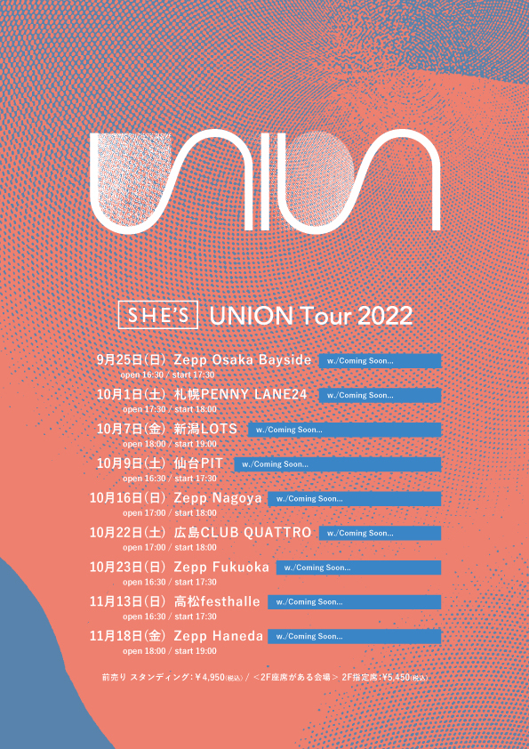 SHE’Sが9月より全国対バンツアー『SHE’S UNION Tour 2022』を開催する。