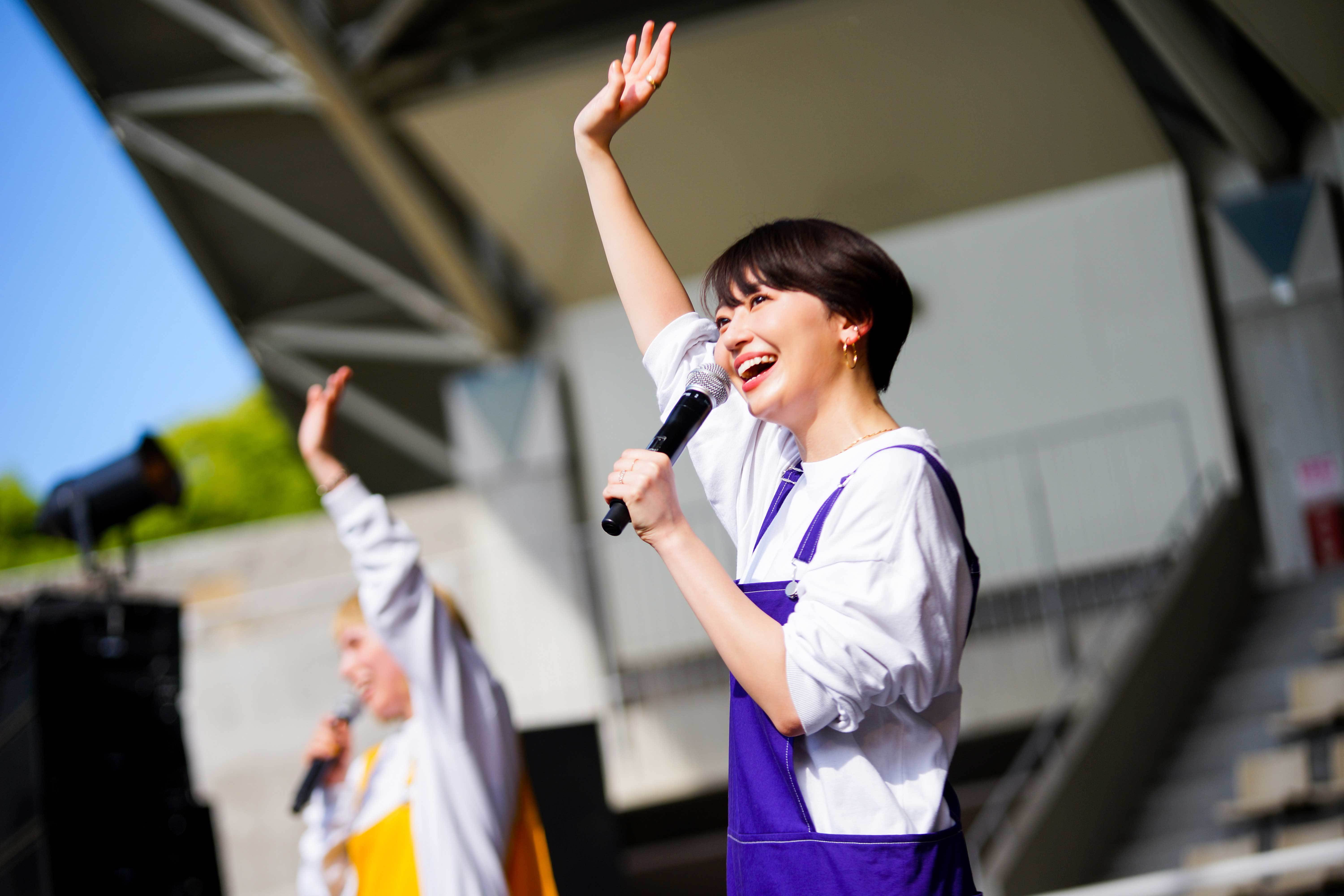 リハーサルからひときわ盛り上がっていたのは、chelmico。暑い野外にピッタリな「Player」ではタオル振り回して一体感を生み出し、さっそく6月1日(水)にリリースされたニューアルバムから「O・La」も披露。初めましての人でも楽しめるように丁寧に振り付けを説明して、一緒にステージを作りあげていく。