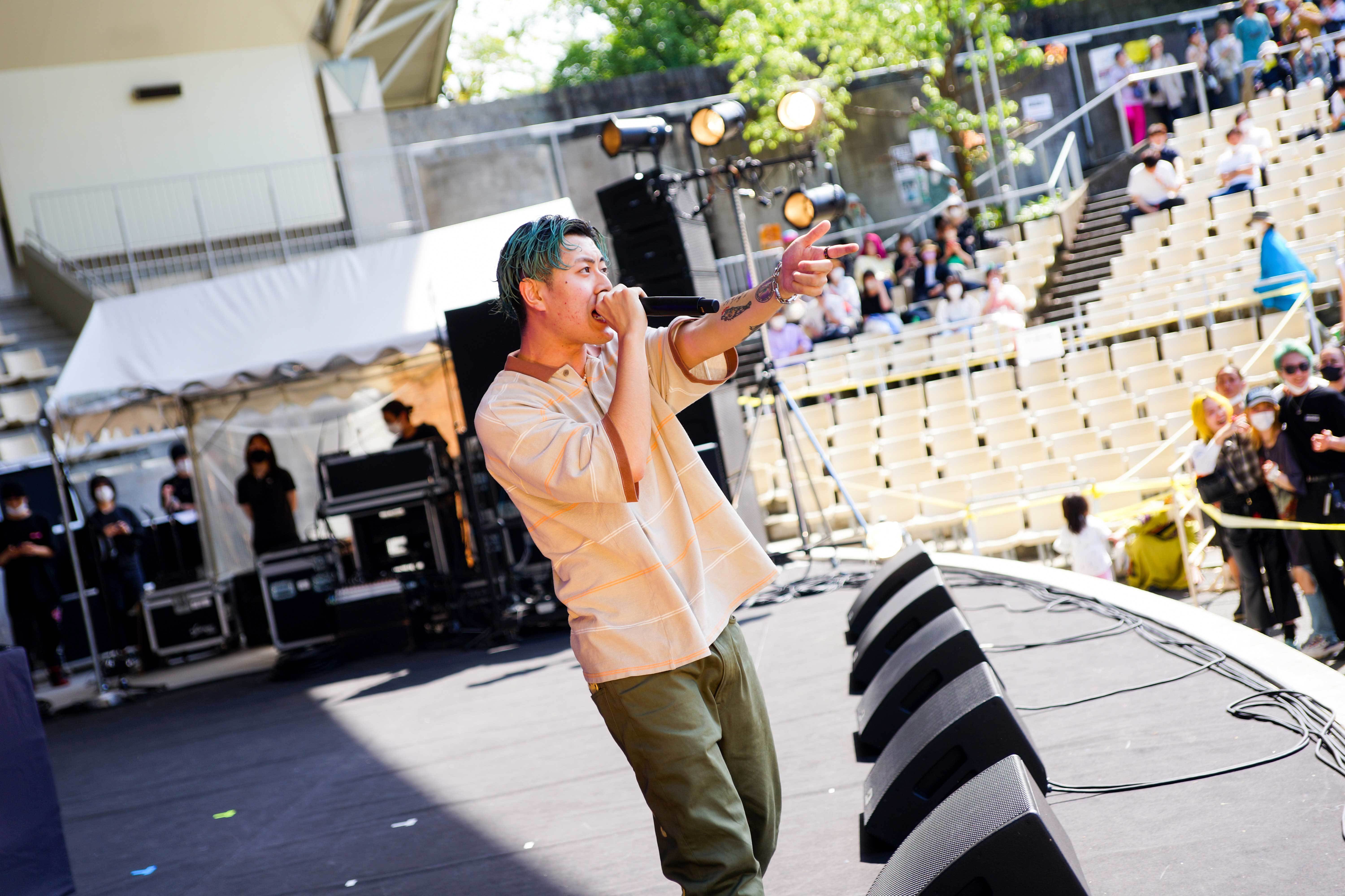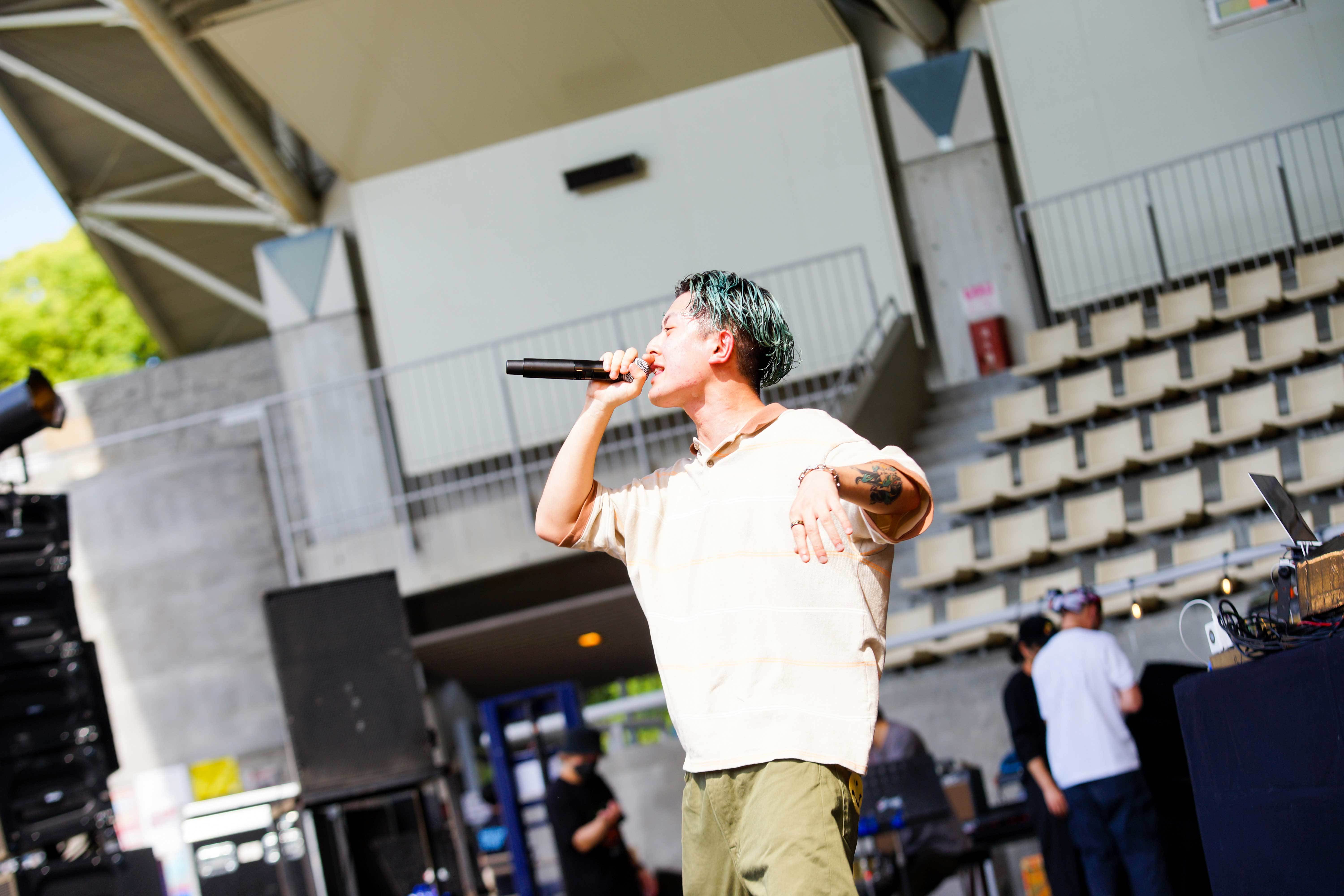 大ヒット曲「Hug」で会場のテンションが更に高まり、MCでは月曜がお休みの美容師さんたちに向けたイベントで、多くのひとが集まったことに触れ、「みんなカルチャーに愛を持ってるんやろなと、パワーをもらってます。生きがいとして、天職として音楽を選んでライフワークとしてやっている。俺はこんな感じやけど、みんなはどんな感じ?という曲を作りました」と、「Life Work」を披露。「相棒」「拝啓」へと続き、より曲に込められたメッセージ性に胸を打たれたラスト。体ひとつで聴く人の心を突き動かし、フロアにハンズアップの波を起こし堂々たる存在感を見せつけステージを後にした。