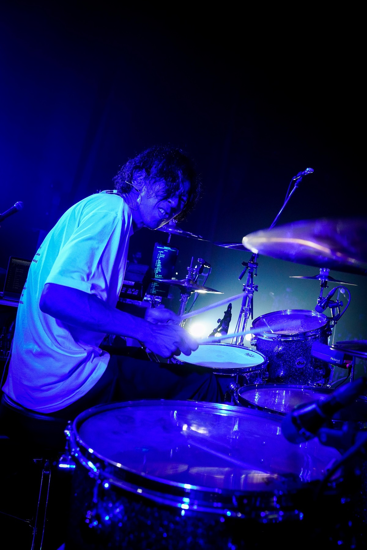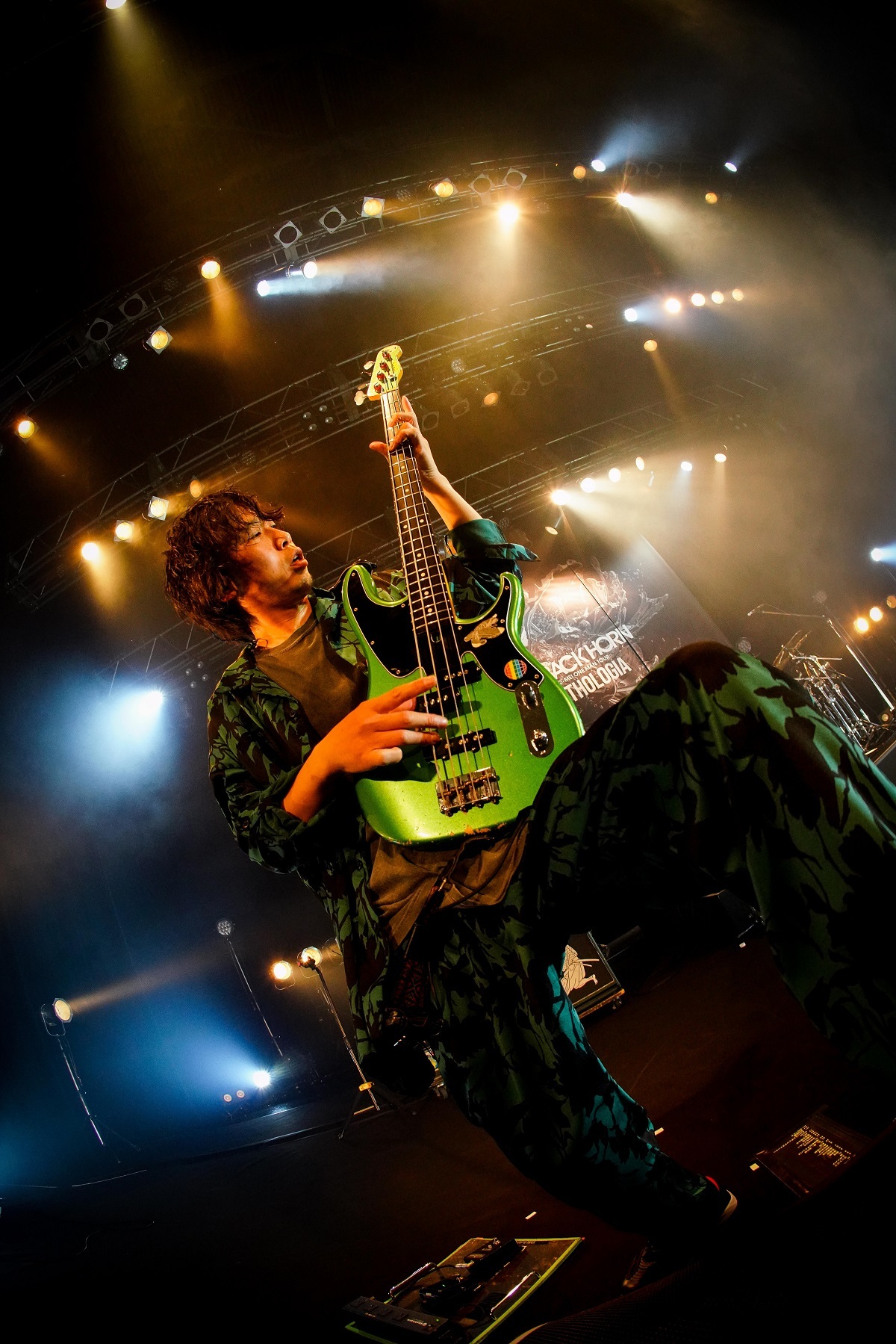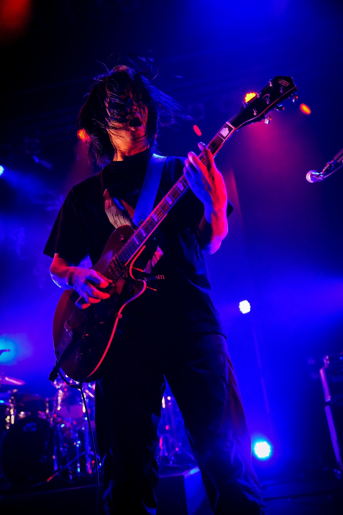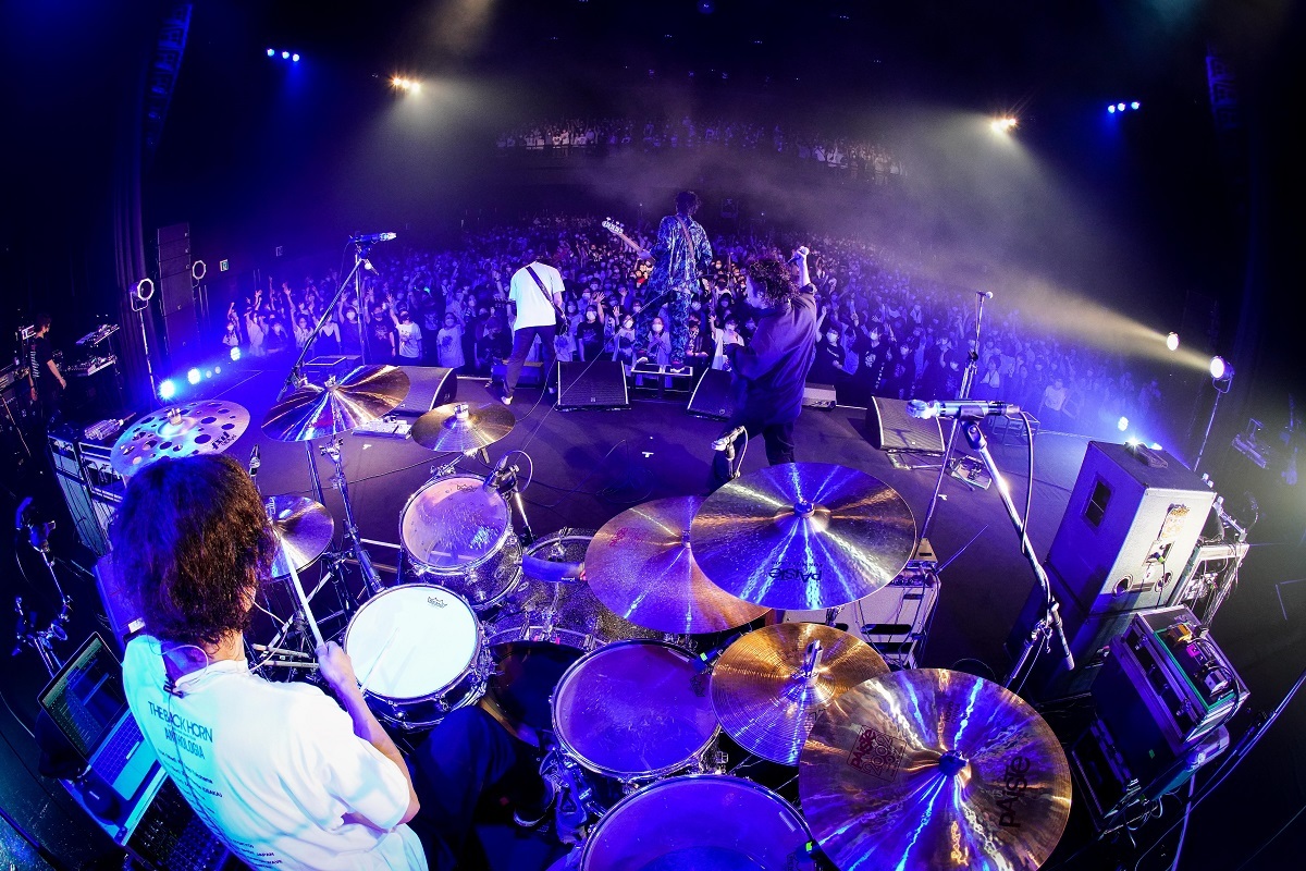 いつものように真摯な松田のMCを境に、曲調はさらにバラエティ豊かさを増してゆく。『アントロギア』収録曲は、ハードコア、ダンスミュージック、ジャズ、ロカビリー、カントリーなど実に多彩なものだったが、ライブではシーケンスを駆使してそれを再現しつつ、あくまでバンドサウンドとして熱を持って聴かせてくれる。黒づくめの山田は格闘家のように切れ味鋭く動き、岡峰は腰を落としてメロディックなフレーズを繊細な指先で紡ぎ出す。いつものように裸足の菅波栄純は誰よりも表情豊かに、笑ったり叫んだりしながら猛烈なカッティングを繰り出し、松田のドラムはリズムキープの域を超えて曲の感情を直接的に表現する。アルバム収録曲「疾風怒濤」の、岡峰の強烈な高速スラップをはじめ、3人の楽器バトルに震える。久々のアルバムツアー、4人の気力充実ぶりは明らかだ。