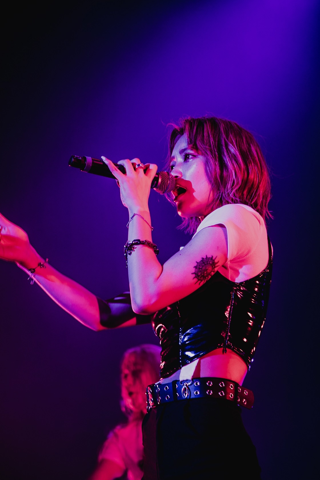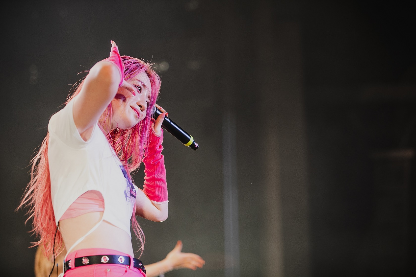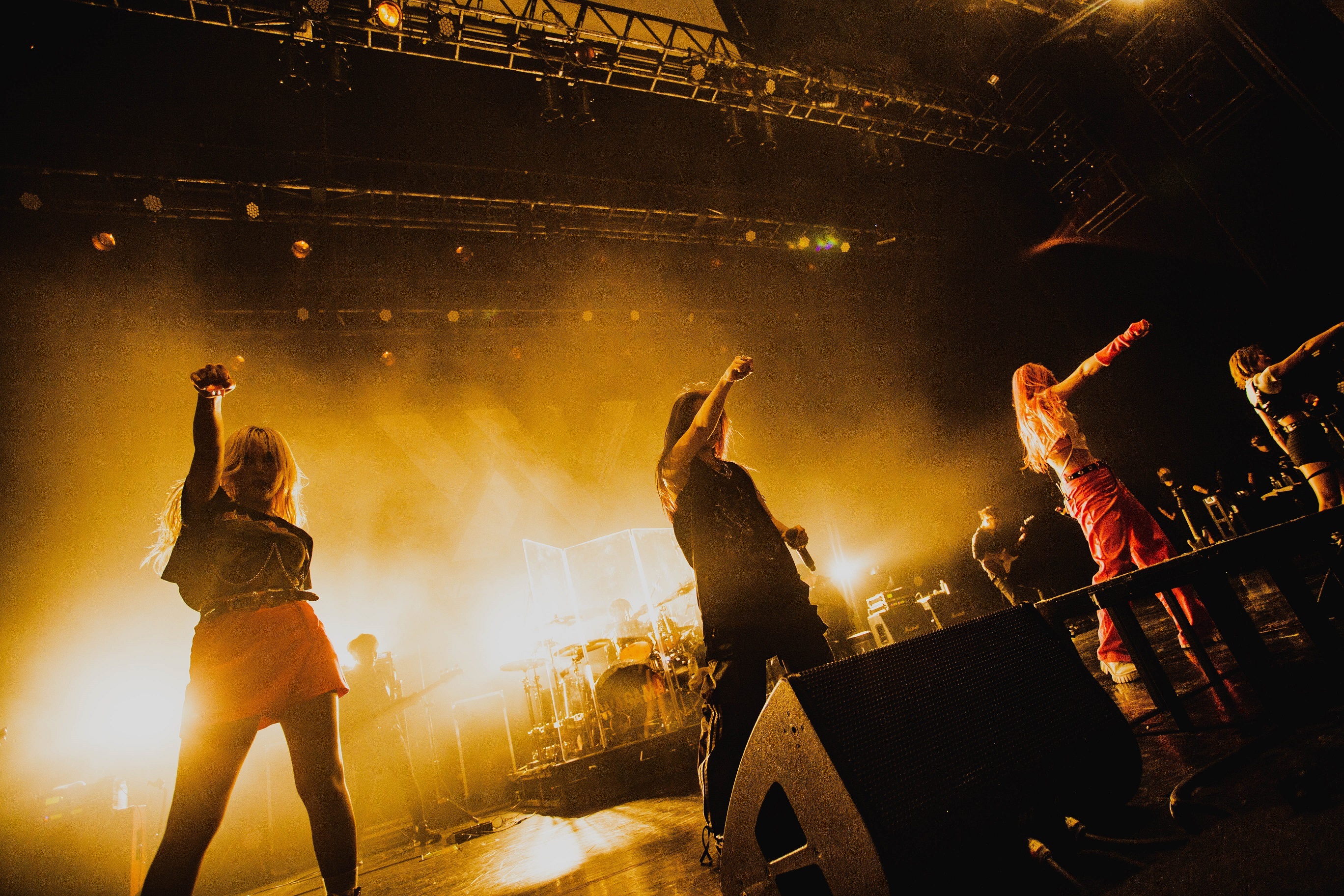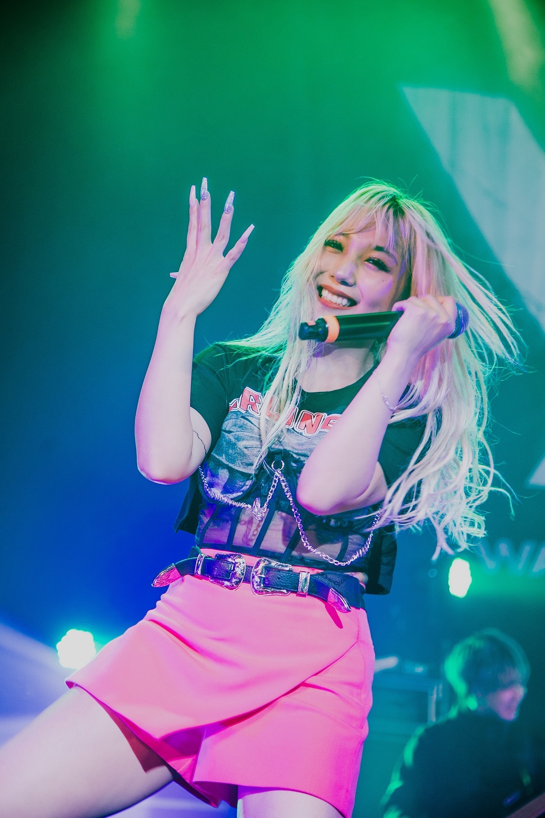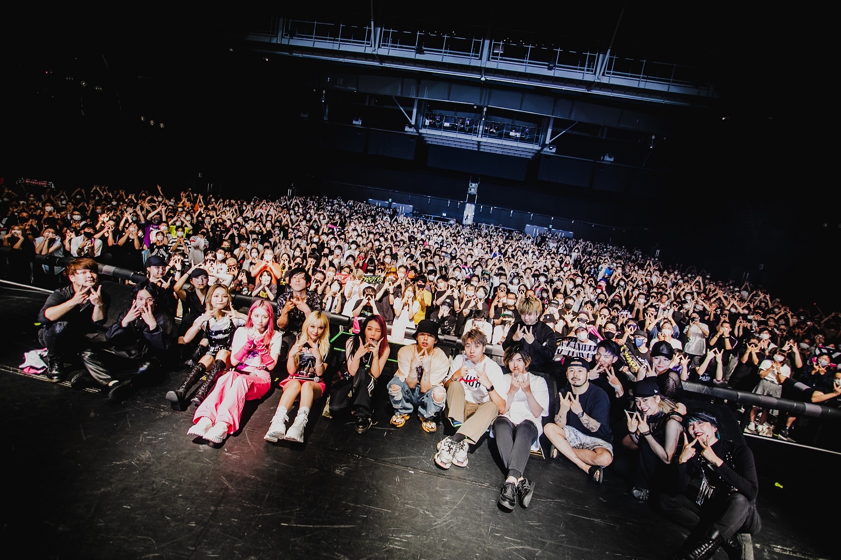 MCでは、「自分たちは色んな人たちに、アイドルでもない、バンドでもないと言われ続けてきたけど、好きなことをやりたくて。もしかしたら何にもなれないかも知れないけど、自分たちを信じて、いつか憧れのあの人たちとライブが出来るかも知れないという夢を抱きながら、ここまでやってきました」と、このツアーに懸けた想いと、挑戦状を受けてくれたマイファスへの感謝を告げた星熊。「日本一攻めてるアイドル、我儘ラキアです!」と力強く宣言して、披露した曲は「GIRLS」。ダンサーも加わり、歌とダンスで賑やかで華やかなステージを魅せられるのは、ロックバンドにはない彼女らの強み。パワフルな星熊のリードにダンスが華を添えた「New World」、スケール感のある楽曲世界を星熊の歌唱力と全身を使ったダンスで表現した「Ambivalent」と続いて観客を魅了すると、ダンサーがステージを降りて、ステージ上は再び4人に。「Reboot with…「」」で強烈な熱量を放ち、フロアに拳が上がると、その様子を見て星熊が笑顔を見せる。「みんな、こっから盛り上がっていけますか? 一緒に踊ろうぜ!」と川﨑が煽り、「Leaving」が始まる。初見であろう人も懸命に手振りを真似て、明るく楽しい雰囲気が会場を包む。