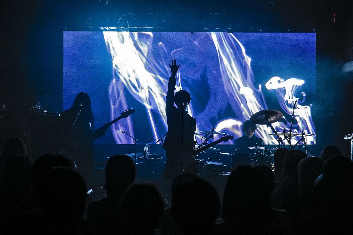 結論からいうと、これが予想を遥かに上回る衝撃だった。ツアーは今後も続いていくので、詳しいセットリストは書けないのだが、この日はオープニングのステージアクトから驚かされた。最新のインストアルバム『utopia.』のある曲に大胆なアレンジを施した同期音源にトキめいていると、3人が次々とオンステージ。映像をバックに、同期音をKENZOの生ドラムが引き継ぎ、バンドサウンドへと切り替わっていったときのスリルは迫力満点。そこからアッパーな歌ものへと展開していったときの歌、ギターフレーズ、スピーディーに畳み掛けるビートが一体となったときの破壊力は、小さなライブハウス、編成もシンプルだからこその温度感でフロアを煽っていく。