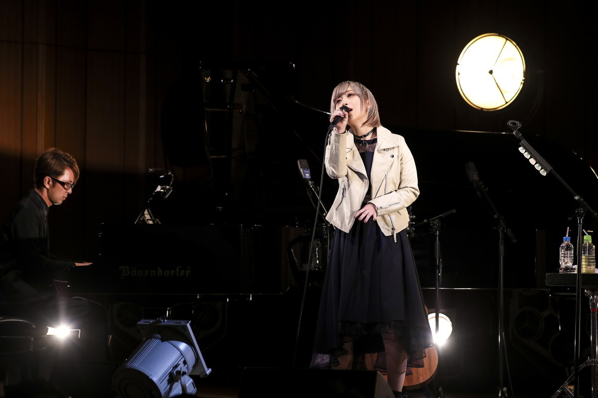 ステージ上手にアコースティック・ギター、下手にピアノ、丸いラグを敷いたセンター・ポジションにマイク。その他には何もないシンプルな舞台に、二人のミュージシャンと共にReoNaが現れる。白のライダース・ジャケット、濃紺のワンピース、銀のラバー・ソウル、銀髪によく似合う赤いリップと濃いブラウンのアイメイクで、ドールメイク風に仕上げたビューティー・フェイス。ピンと張り詰める緊張感の中、オープニングを飾ったのは最新のセカンド・シングル「forget-me not」だ。『ソードアート・オンライン アリシゼーション』エンディング・テーマになった、オリジナル・アレンジの原曲のロッキッシュなスピード感を残しつつ、アコースティックならではの柔らかさと軽みを加えた爽やかなアレンジ。エアリーなのに迫力あるローの効いた、個性的なReoNaボイスとアコースティックとの相性はとてもいい。