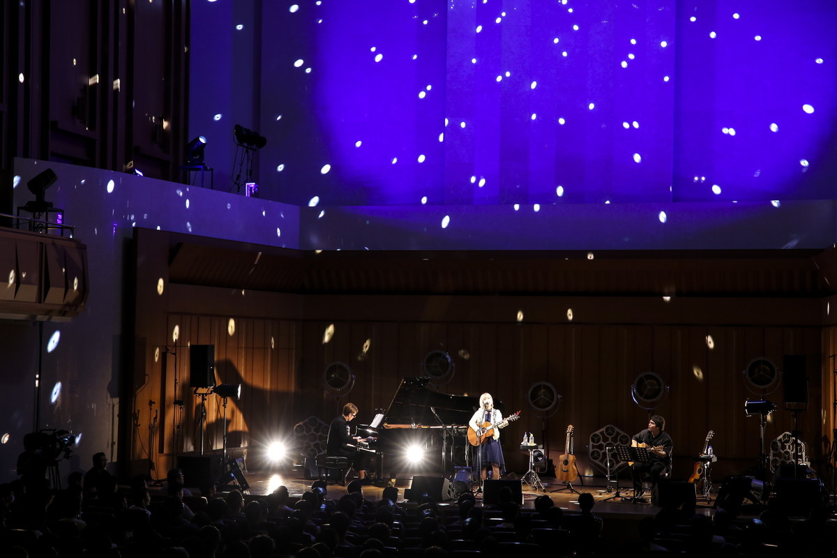 再びハンド・マイクに戻り、『ELZA』から「レプリカ」「ヒカリ」「step, step」と続くスペシャル・メドレーへ。快活なテンポとメジャー・コードの明るいメロディであっても、陰りあるエアリー・ボイスがどこか儚さと切なさを連れてくる、それがReoNaのカラー。『展覧会の絵』のメロディを引用した「step, step」が特に美しく響いた気がしたのは、このホールに住むクラシック音楽の神様がほほ笑んだからかもしれない。ReoNaのアンプラグドにはオリジナルのバンド・アレンジだけでは見えなかった、新しい発見がいくつもある。