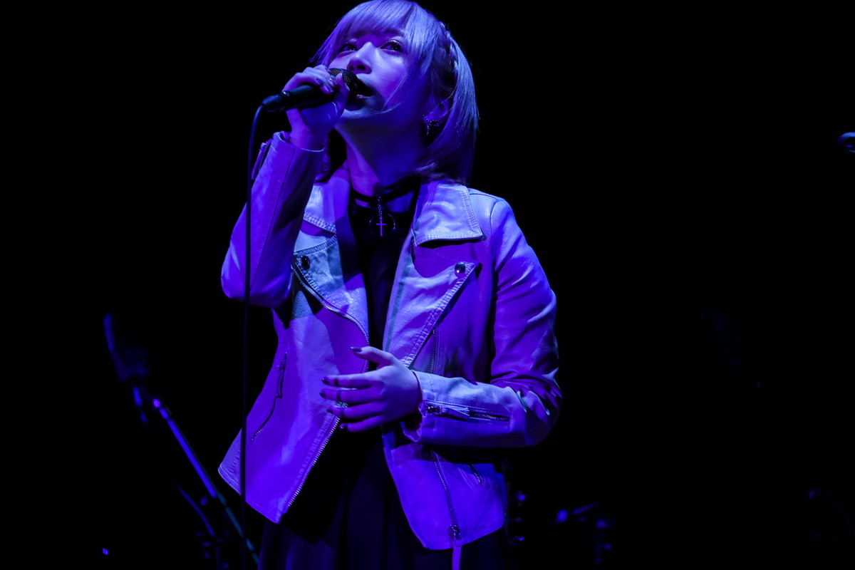 続いては「Disorder」。「神崎エルザ starring ReoNa」名義のミニ・アルバム『ELZA』からのファスト・チューンを、右手にしっかりとマイクを握り、左手で空を掴み、体を折り曲げてアクティブに歌うReoNa。妖しく揺れる赤と青の照明が効果的で、音圧は薄くとも伝わる感情は十分にエモい。「トウシンダイ」は明快なアコースティック・ギターのストロークに乗せたポップな曲調だが、ダブル・ミーニングを使ったリリックは衝撃的なほどに重い。それは少女が大人になるためのイニシエーション。“飛べるだろう”という印象的なリフレインを繰り返す、薄く笑みを浮かべたような表情が怖いほど綺麗だ。