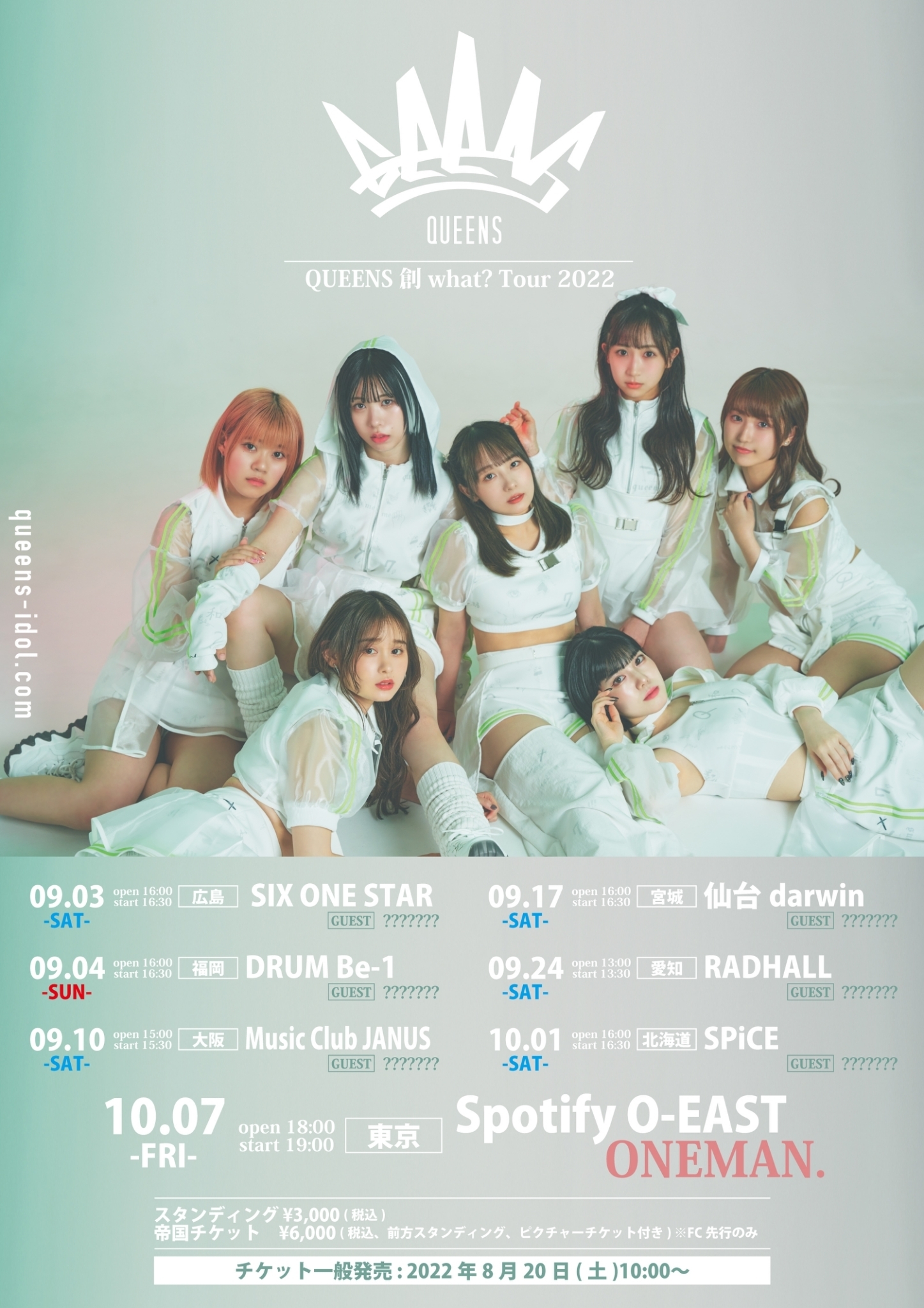 発表となったツアーは『創 what? Tour 2022』と名付けられ、これから QUEENS として独自の「何か」を創り上げていくという意味が込められ、全国6箇所を対バン形式で回り、そのツアーのファイナルを東京・Spotify O-EAST にて開催する。チケットの先行受付は自身のファンクラブ「QUEENS 帝国」にて7月3日(日)23:59まで行われる。対バンゲストは後日発表される。