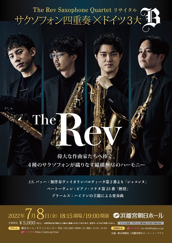 宮越:4人ともが20代での演奏会は最後となる、ちょっとした節目のタイミングで、過去の偉大な作曲家の作品をサクソフォン・クァルテットで吹けるのは幸せです。そういうプレミアムな演奏会。30代のRevをもっと楽しむには聴き逃せないコンサートです。