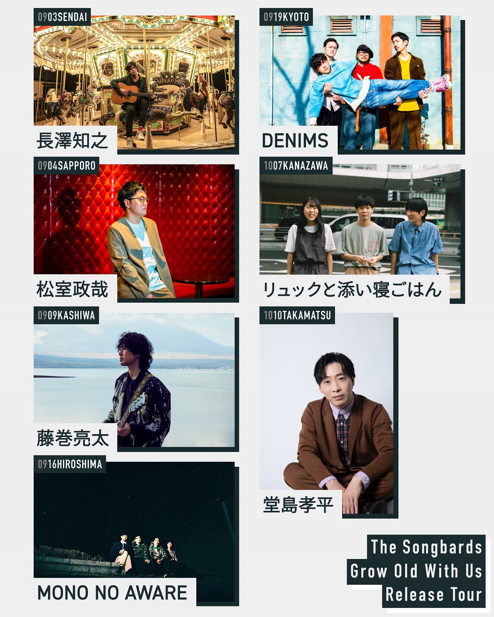 The Songbardsが、6月29日にリリースとなるフルアルバム『Grow Old With Us』を記念して全7公演のツアーを開催。長澤知之、松室政哉、藤巻亮太、MONO NO AWARE、DENIMS、リュックと添い寝ごはん、堂島孝平ら7組をゲストに迎えることが発表された。