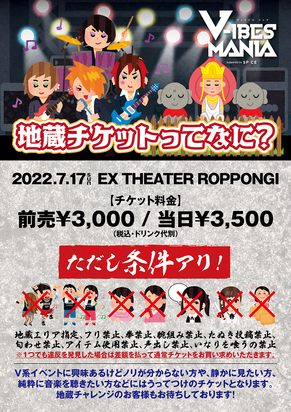 本公演は、前方エリア6列以内の「VIPチケット」、「1階一般チケット」、「2階一般チケット」のほかに、「1階後方地蔵チケット」なる条件付きチケットも販売。この「1階後方地蔵チケット」は、1階後方の「地蔵エリア」指定で、フリ禁止、拳禁止、腕組み禁止、たぬき投稿禁止、匂わせ禁止、アイテム使用禁止、声出し禁止、いなりを喰うの禁止となっている。禁止事項が多くて楽しめないようにも思えるが、ヴィジュアル系のノリや振り付けが分からない初心者にとっては、じっとしても目立たない、むしろ“地蔵”としてライブを楽しむことができる。初心者でなくとも静かにライブを楽しみたい人にもお勧めだ。ただし、この地蔵エリアは「一つでも違反を発見した場合は差額を払って通常チケットをお買い求めいただきます」という条件付きとなっている。