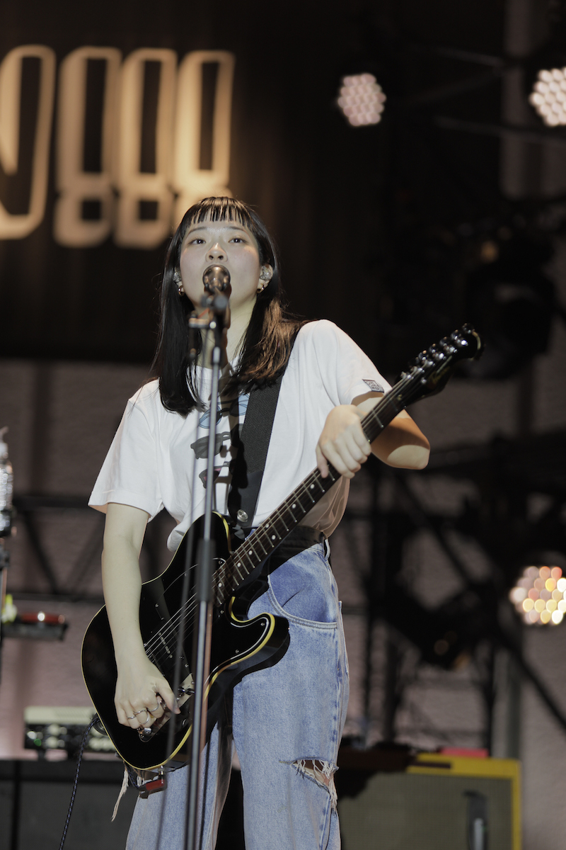 宮崎朝子(Gt/Vo)、松岡彩(Ba)、吉川美冴貴(Dr)の3人が向かい合って、息を整えての始まり。1曲目は「きっとあの漫画のせい」だった。バンドの奏でる音が客席はもちろん、あたりの木々や空にも流れこんでいくようだ。エネルギッシュであることとしなやかであることを両立したバンドのアンサンブルが気持ちいい。宮崎の歌とギターのせつなさも際立っていた。松岡のベースで始まった「妄想サマー」では歯切りのいい軽快なリズムと、メリハリの効いた吉川のドラムに体が揺れる。観客もハンドクラップで参加。松岡のコーラスが宮崎のボーカルにアクセントを加えている。SHISHAMOの楽曲の魅力を熟知しているメンバー3人が、その魅力を見事に引き出す演奏を展開しているという印象を受けた。SHISHAMOには野音が似合っている。そんな印象を受けたのは、彼女たちが野音で演奏することに対して喜びを感じていることが伝わってきたからだろう。