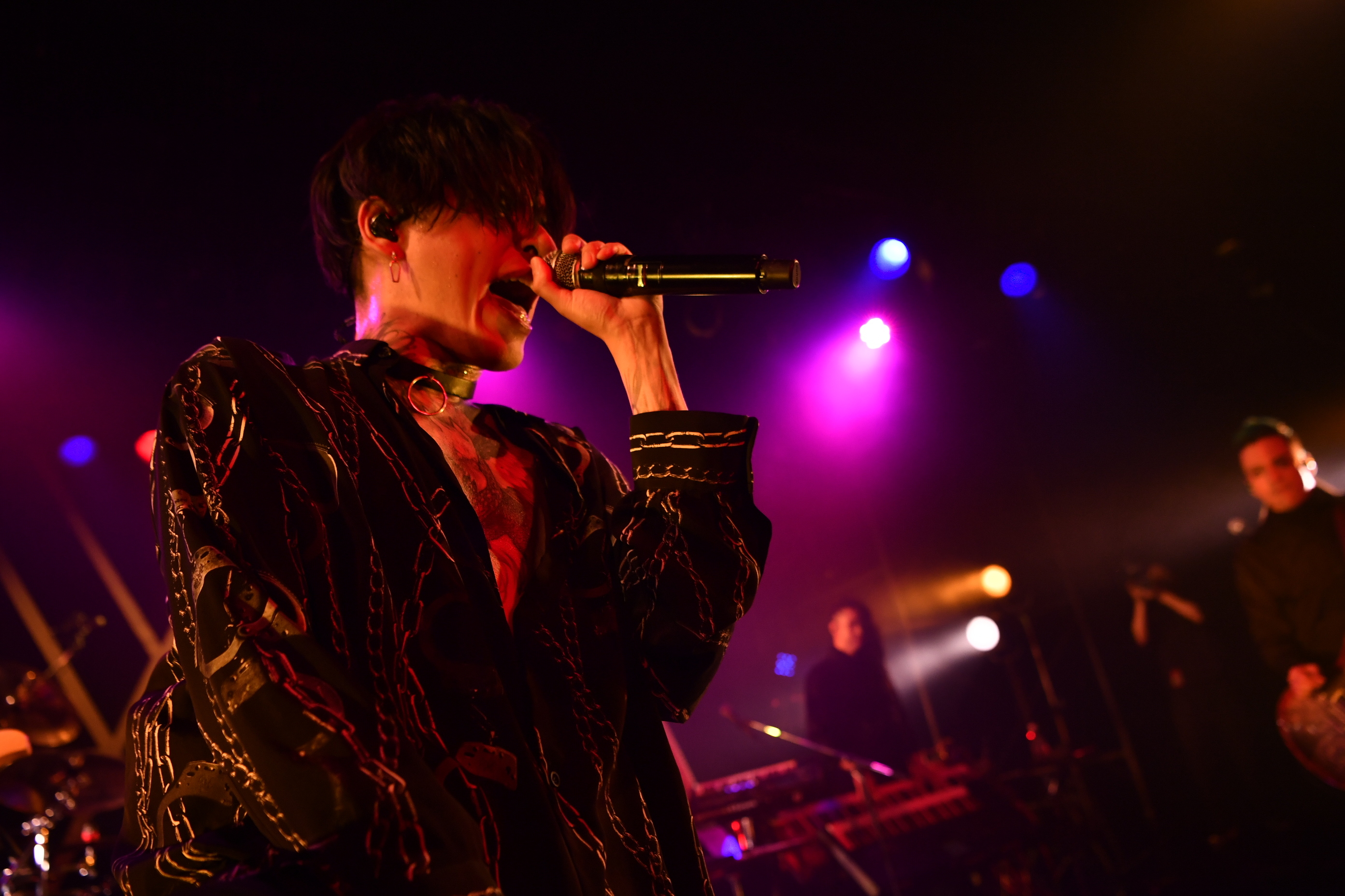 鳴り止まない拍手の中で始まったMCでは、たくさんのファンが集まってくれたことへの感謝を語り、PABLO(Gt/Pay money To my Pain他)、TSUYOSHI(Gt/Unveil Raze)、明徳(B/lynch.)、響(Dr/摩天楼オペラ)、hico(key)という最強の布陣で固めた、HAZUKIバンドのメンバーを紹介。ジャジーでスリリングなサウンドに鍵盤の音色と艶っぽい歌声が映えた「CALIGULA」、疾走感ある曲調と感情的で表現力豊かなボーカルで聴かせた「SAD SONG」と続き、強固なバンドサウンドに乗せて1stシングル収録の「目眩」を歌い上げたHAZUKI。曲調の異なる幅広い楽曲が並び、聴く者の感情を揺さぶる中盤戦は、メンバーそれぞれの技術の高さに加え、初ツアーとは思えない息の合った演奏とグルーヴを見せる楽器隊や、楽曲ごとに様々な表情を見せるHAZUKIのボーカリストとしてのスキルの高さと魅力に会場中が釘付け。「奈落迦 -Naraka- Feat.PABLO」ではPABLOとTSUYOSHIがアコギを背負い、空気をガラリと変えるネイチャーなサウンドに乗せてHAZUKIが熱唱。自身の人柄を表すような温かく人間味溢れる歌声とボーカリストとしての圧倒的存在感と求心力にバンドの結束の強さの理由や、未発表曲や未リリース曲だらけの初ツアーながら、大きな期待を抱いて集まるファンの気持ちがよく分かった気がした。