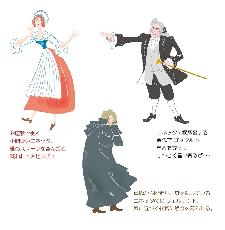 お屋敷で働く少女ニネッタは、その家の息子ジャンネットと恋人同士でした。或る日、兵隊に行っていたジャンネットが帰ってくるということで、村はお祝いムードに包まれます。喜びいっぱいのニネッタに対し、二人の関係を快く思わないのは、お屋敷の奥方にしてジャンネットの母親ルチーア。ジャンネットの父親ファブリツィオは、二人の関係を祝福しながらも奥さんに気を遣い、遠くから見守っています。ジャンネットの帰還祝いパーティを終え、一人になったニネッタの元へ、出征しているはずの父親フェルナンドが現れます。軍隊でトラブルを起こして逃げて来たのです。ニネッタは、逃走資金が必要な父親から、銀のスプーンを預かり、小間物商イザッコに売りますが、ちょうど同じタイミングでお屋敷から銀のスプーンが1本なくなったため、盗みの疑いをかけられてしまいます。代官のゴッタルドは、ニネッタに言い寄っても袖にされた腹いせに、彼女を犯人に仕立て上げ、牢屋に入れてしまいます。そして死刑宣告を受けたニネッタを助けようとしたフェルナンドも捕らえられてしまいます。ニネッタは刑場に引き立てられ、あわや死刑が行使される寸前、お屋敷で働く少年ピッポが、かささぎの巣から銀のスプーンを見つけ出し、ニネッタの無罪が確定。最後はどん底から一転、大団円へと向かうのです。