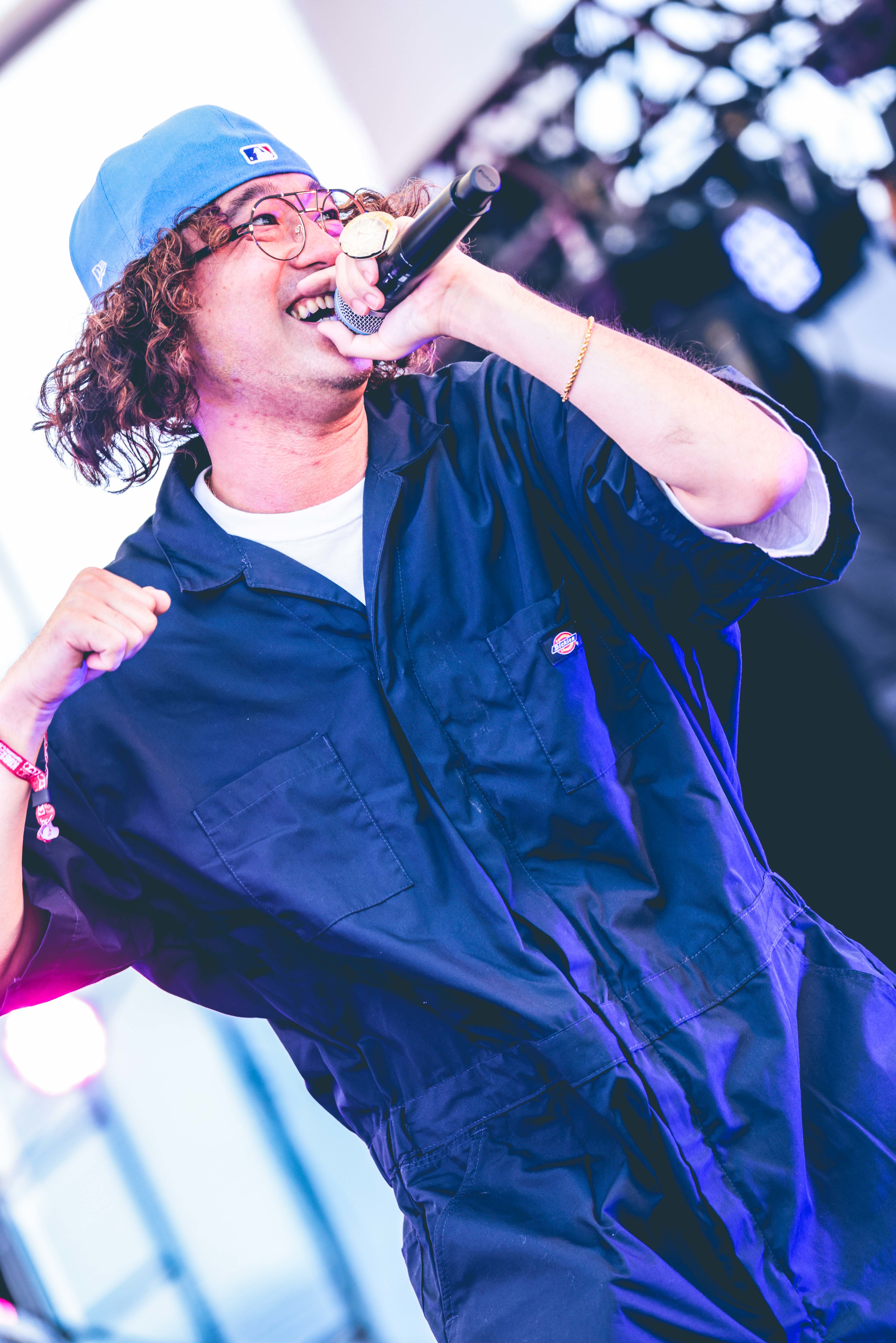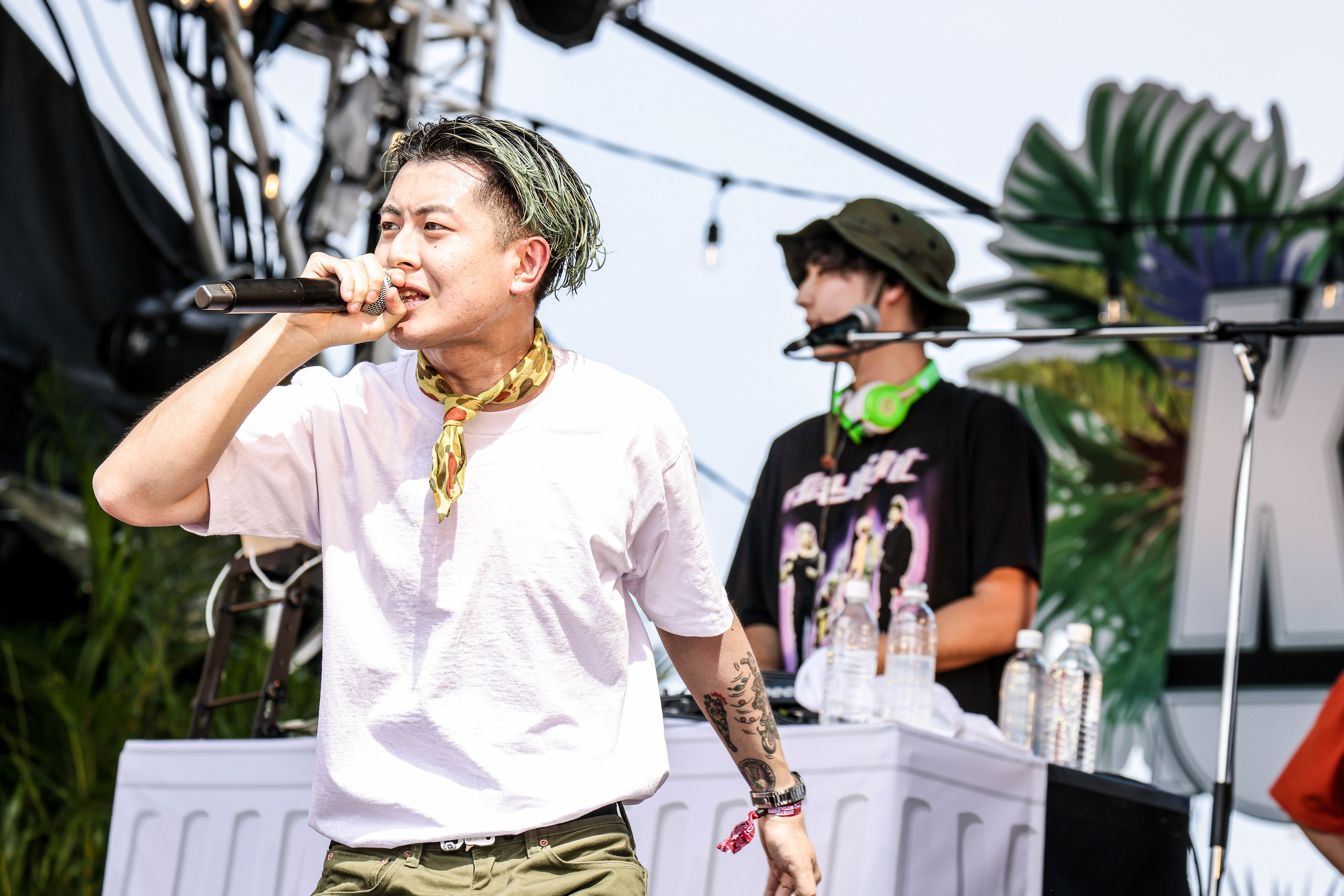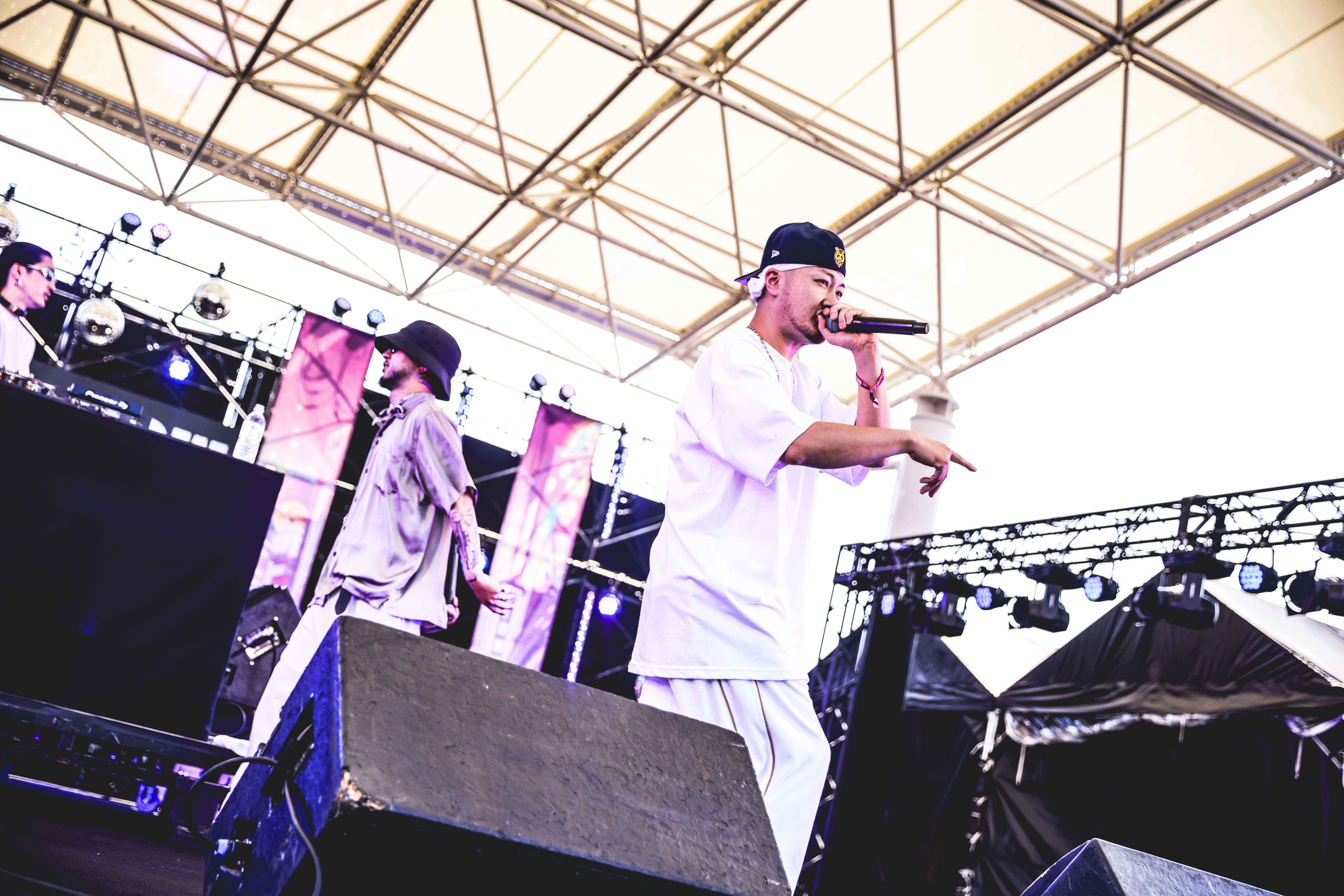 トップバッターは、ZEN-LA-ROCKとG.RINA、鎮座DOPENESSのユニット・FNCYで、これまた午前中になかなか見ることができない顔ぶれでしたね。夏をはじめたいというMCから1曲目「NEW DAYS」。のっけから手拍子とウェーブが起こって、煽る、踊る、しゃがんでジャンプという大盛り上がりのステージに。鎮座DOPENESSもすごい踊るから、お客さんもそれに合わせて踊っていて、「AOI夜」を青空の下で披露したことが特に印象的でした。