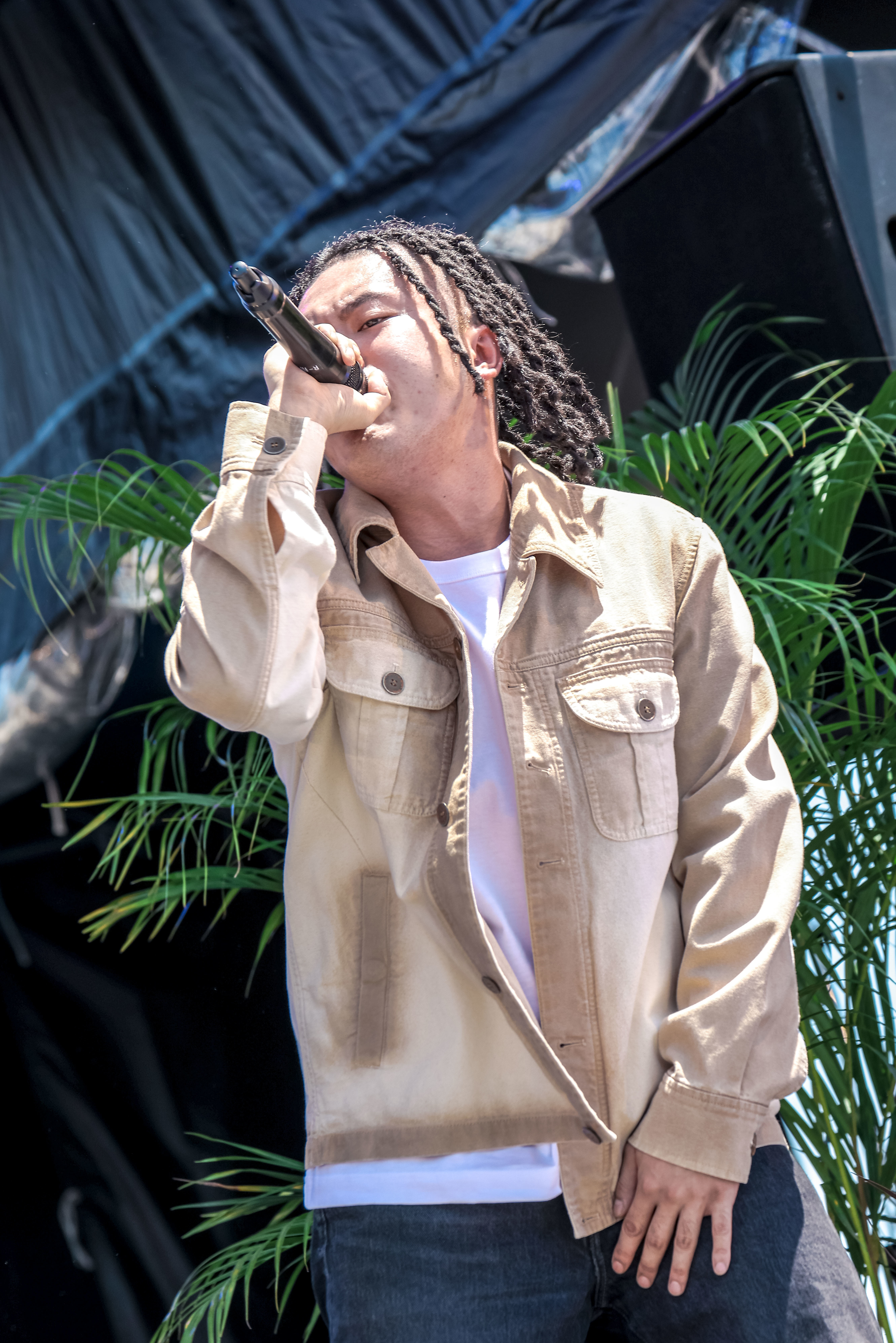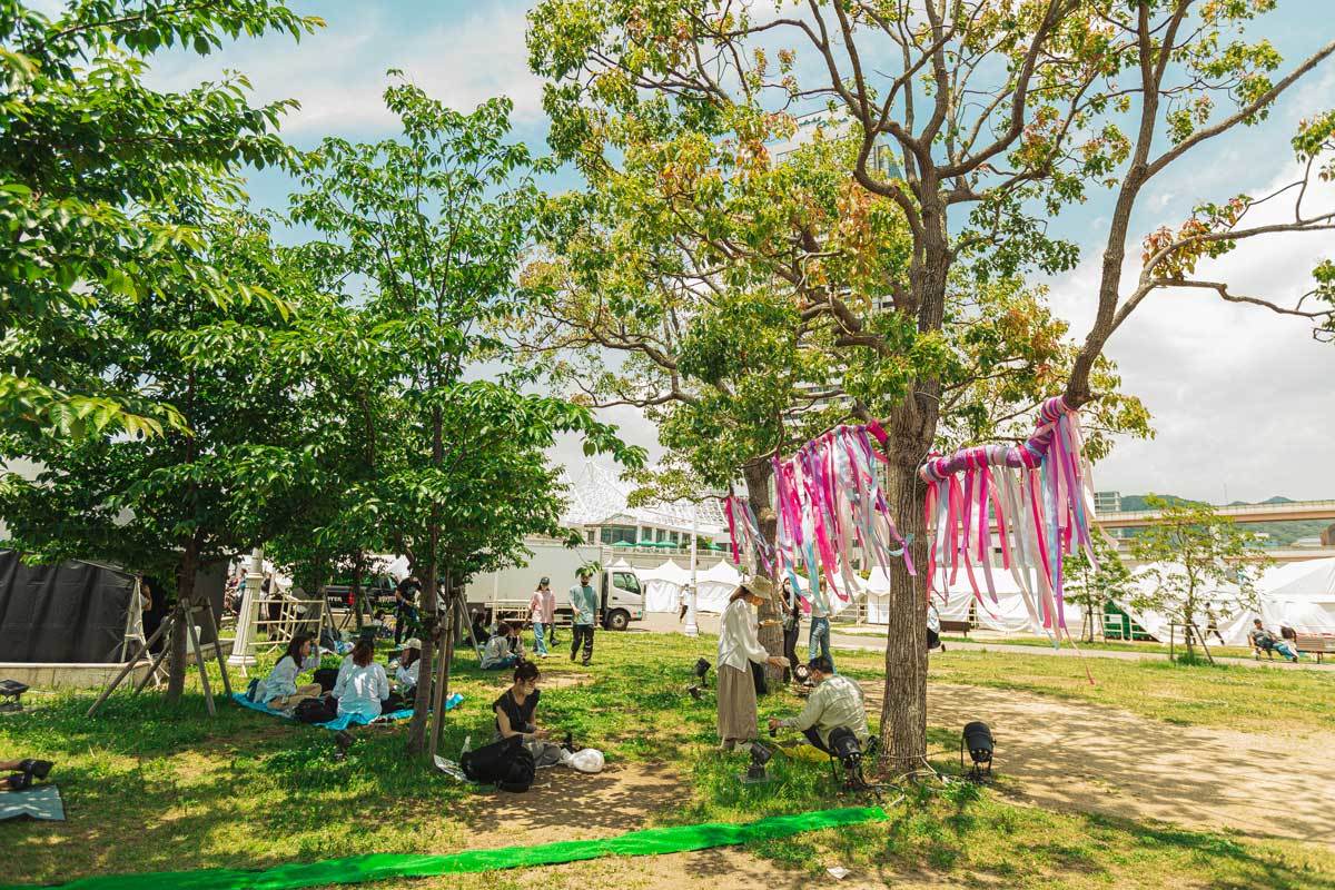 会場内には「マンドリルカレー」や「JESUS PIZZA」「中華とお酒 Marman」といった神戸のお店を中心に、関西のヒップホップカルチャーを語る上では欠かせない重要なお店「タソガレコーヒー」なんかが出店していたりとフードのラインナップにもイベントのコンセプトやこだわりを感じました。会場内には木陰や芝生エリアもあり逃げ場があったので、フードを楽しんだり休憩しやすくなっていたのもポイントですね。個人的に入退場が自由にできたのがよかったなと思っていて、会場の外にはアパレルや古着を販売するお店も並んでいたのでファッションも楽しめました。このマーケットのエリアはチケットがなくてもフリーで楽しめるようになっていたので、通りすがりの人も立ち寄ったりして盛り上がっていたように思います。