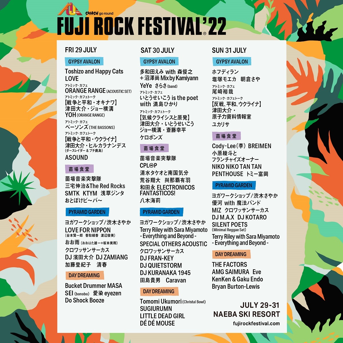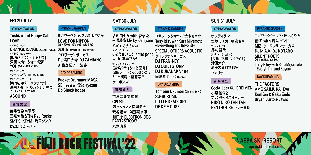 7月29・30・31日に新潟県湯沢町苗場スキー場で開催される『FUJI ROCK FESTIVAL’22』(以下、フジロック)の3ステージ(Gypsy Avalon、PYRAMID GARDEN、DAY DREAMING)に出演する新たなアーティストがオフィシャルサイトにて発表された。