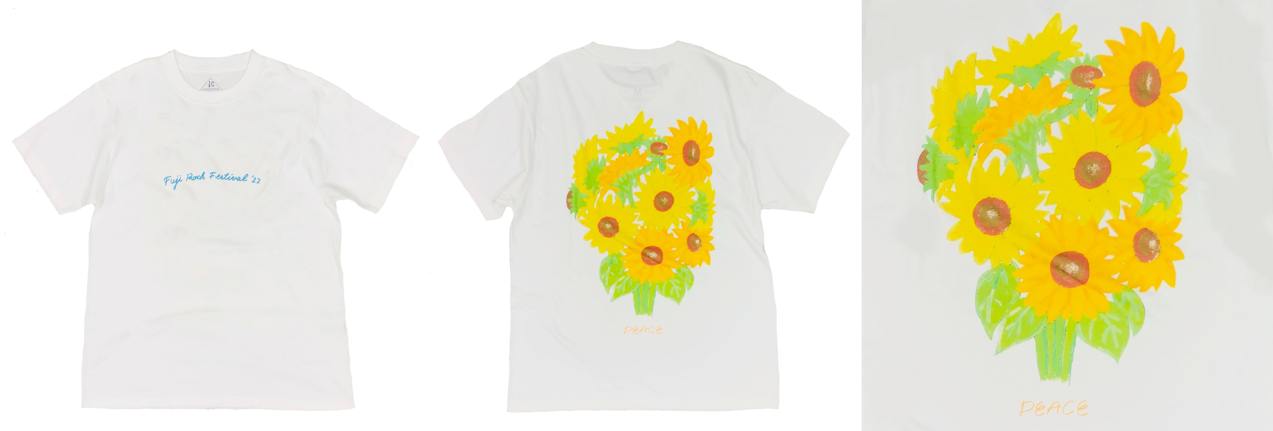 手ぬぐいに続き、「ウクライナ人道支援FUJI ROCK FESTIVAL Tシャツ」の発売が決定。表には「FUJI ROCK FESTIVAL’22」のブルーの文字、バックプリントには咲き誇るひまわりの花が描かれている。サイズはS/M/L/XLの4タイプ、価格は税込み2,500円。6月24日(金)よりオフィシャル・オンラインショップGreenOnRedにて販売開始となる。