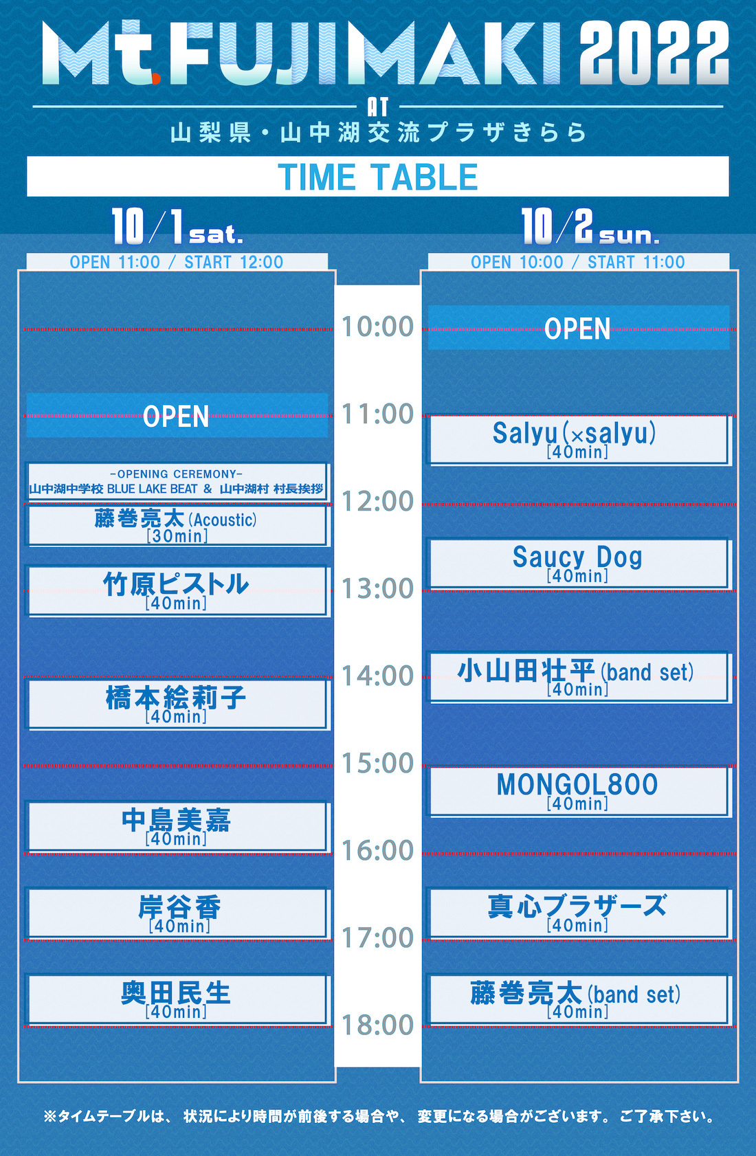 藤巻亮太がオーガナイザーを務め、自身の地元である山梨県の山中湖交流プラザ きららで2022年10月1日(土)・2日(日)に開催する野外音楽フェス『Mt.FUJIMAKI 2022』のタイムテーブルを発表した。