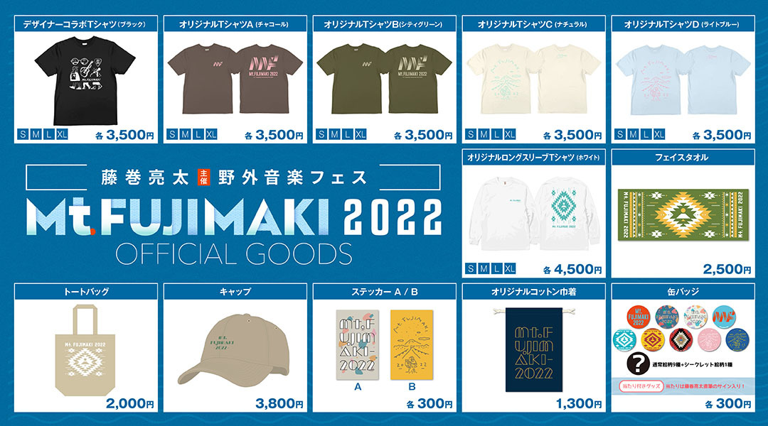 さらに、『Mt.FUJIMAKI 2022』オフィシャルグッズの通販サイトがオープン。 グラフィックデザイナーの小野友也が手掛けたオリジナルTシャツやタオルといったフェスにぴったりのラインナップに加えて、イラストレーターのchii yasuiとのコラボTシャツも販売。6月25日(土)12時より受付を開始、9月11日(日)23:59までに申し込みをした人には、公演日前に届けられるとのこと。