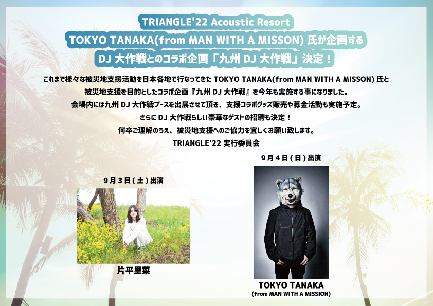 九州DJ大作戦とは、これまで様々な被災地支援活動を日本各地で行なってきたTOKYO TANAKA(from MAN WITH A MISSON)と被災地支援を目的としたコラボ企画。会場内では九州DJ大作戦ブースにて支援コラボグッズ販売や募金活動も実施予定。さらにDJ大作戦らしいゲストの出演も発表となり、片平里菜とTOKYO TANAKA(from MAN WITH A MISSION)の2組が決定した。