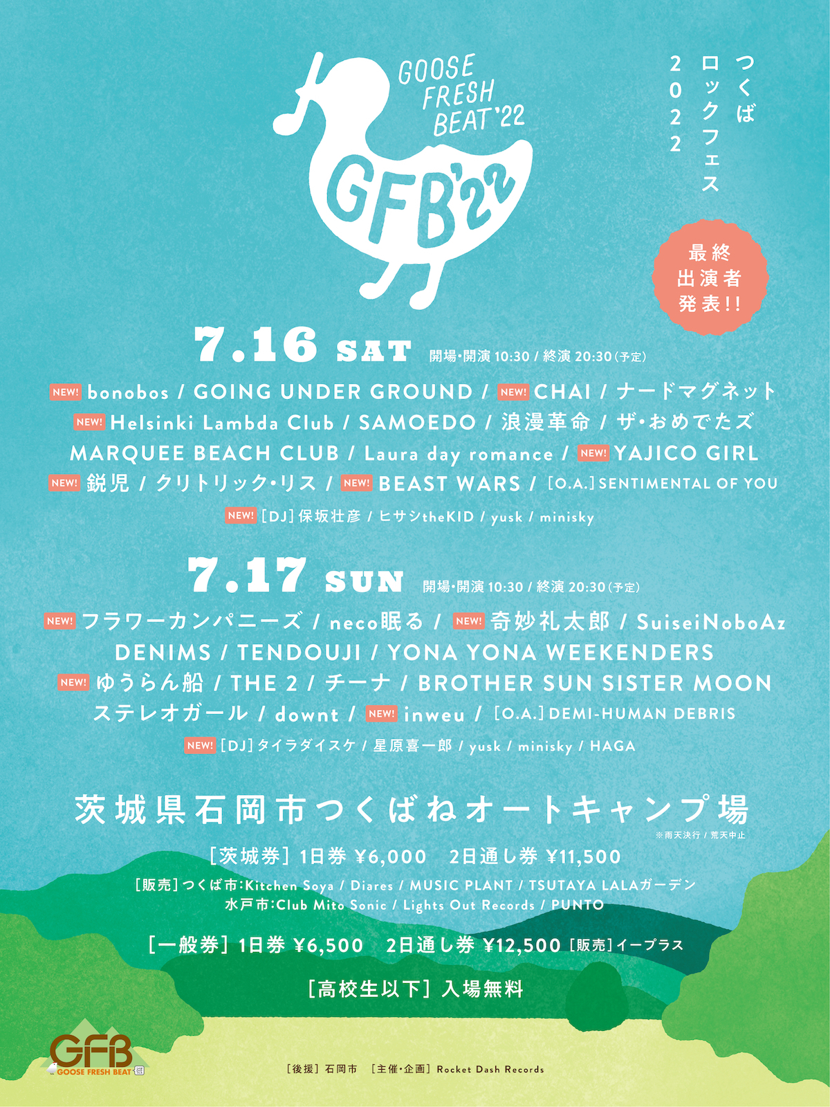 追加出演者は、フラワーカンパニーズ、bonobos、奇妙礼太郎、CHAI、Helsinki Lambda Club、ゆうらん船、YAJICO GIRL、鋭児、inweu、BEAST WARS。また、DJに保坂壮彦、ヒサシ the KID、タイラダイスケ、星原喜一郎、yusk、minisky、HAGAが出演する。