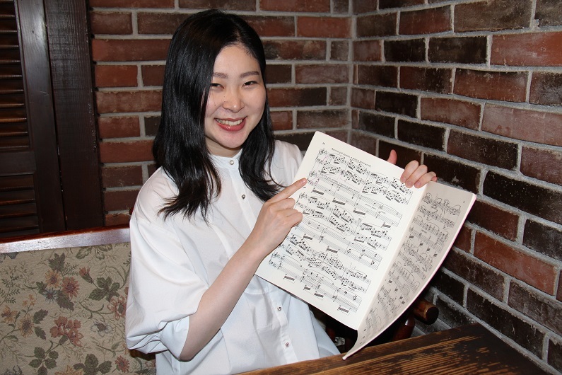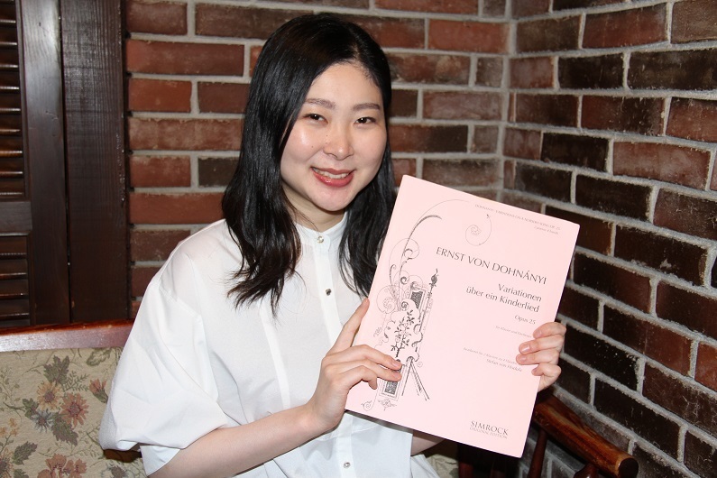 卒業試験の課題の一つ、ドホナーニの「ピアノと管弦楽のための童謡主題による変奏曲」のピアノ譜を持って。 (C)H.isojima