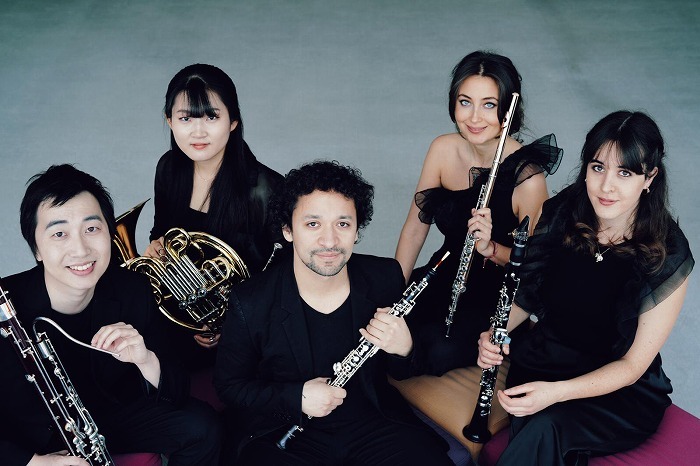 左から 古谷拳一(ファゴット・日本)、ヘリ・ユー(ホルン・韓国)、フェルナンド・マルティネス(オーボエ・ホンジュラス)、アリヤ・ヴォドヴォゾワ(フルート・ロシア)、リアーナ・リスマン(クラリネット・ドイツ)