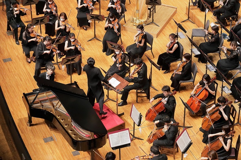 この日(2022年6月24日)、会場のザ・シンフォニーホールは補助席も含めて満杯。コロナ禍にあってホール使用に制限が有り、座席を市松模様に間引いていた時期も長く、こんなに人が入ったザ・シンフォニーホールを見るのは随分久し振りだ。「これはひとえにピアニストの牛田智大の人気によるところが大きいのでは⁈」「いやいや、カーチュン・ウォンの指揮を楽しみにしていたファンも多かったはず!」 など、開演前のホワイエではいろんな意見が飛び交っていたが、終演後、聴衆は口を揃えて、「今日のセンチュリーは凄かった!」と熱く語る姿が多く見られた。(掲載しているオーケストラ写真はすべて、この日の公演のモノを使用。カメラマン山本成雄氏による撮影。)