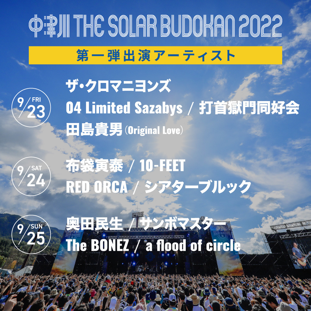 2022年9月23日(金・祝) 24日(土) 25日(日)に岐阜・中津川公園内特設ステージにて開催される、“太陽光でロックする”フェス『中津川THE SOLAR BUDOKAN 2022』の第1弾出演アーティストが発表された。