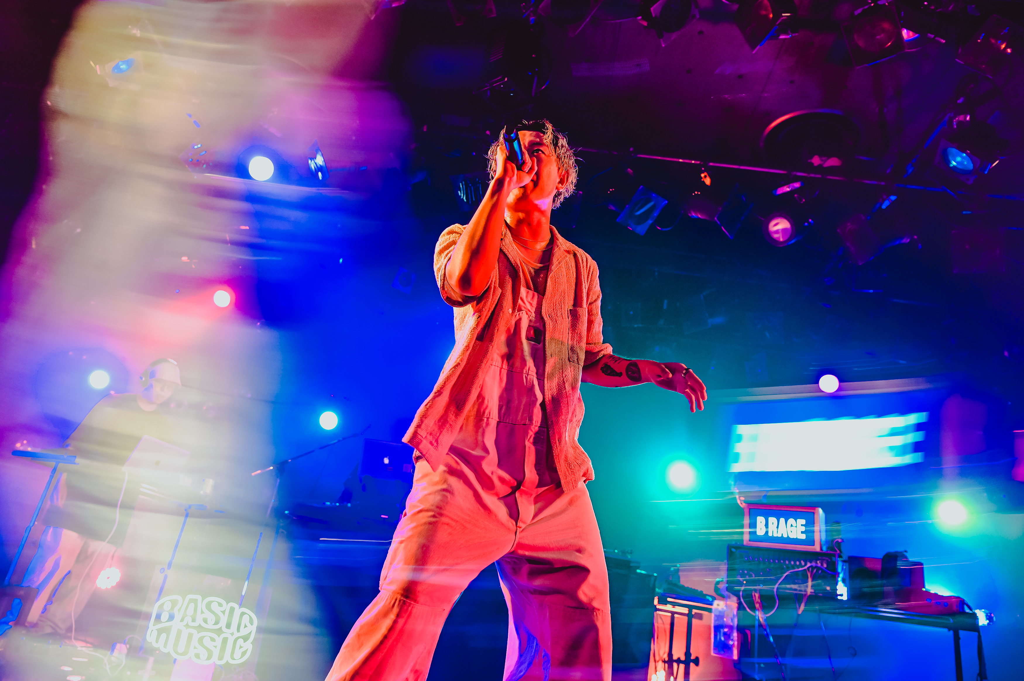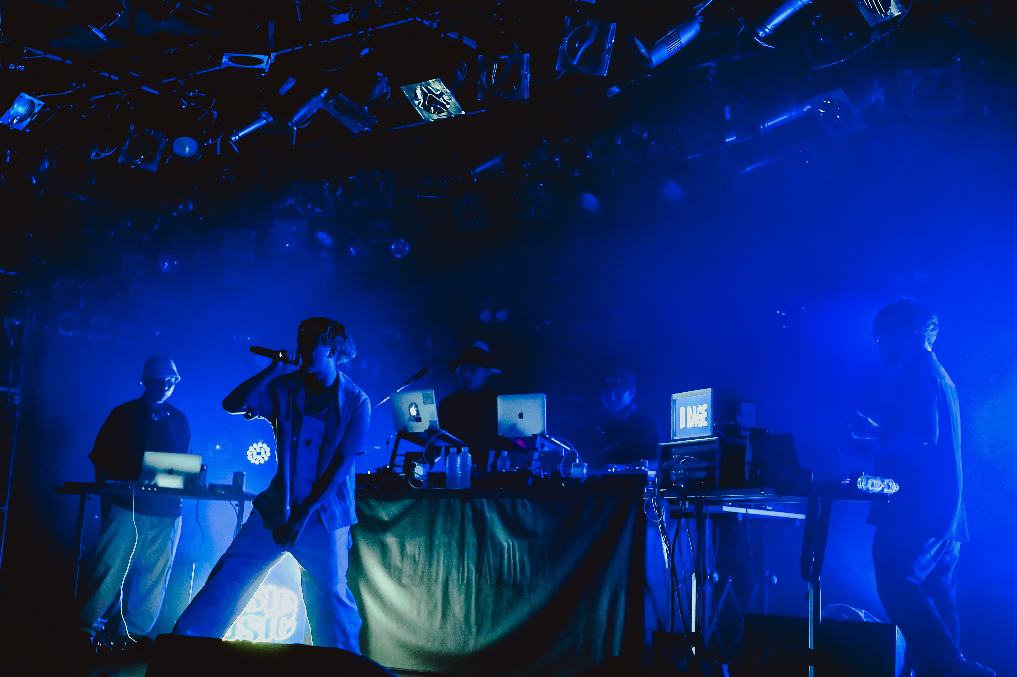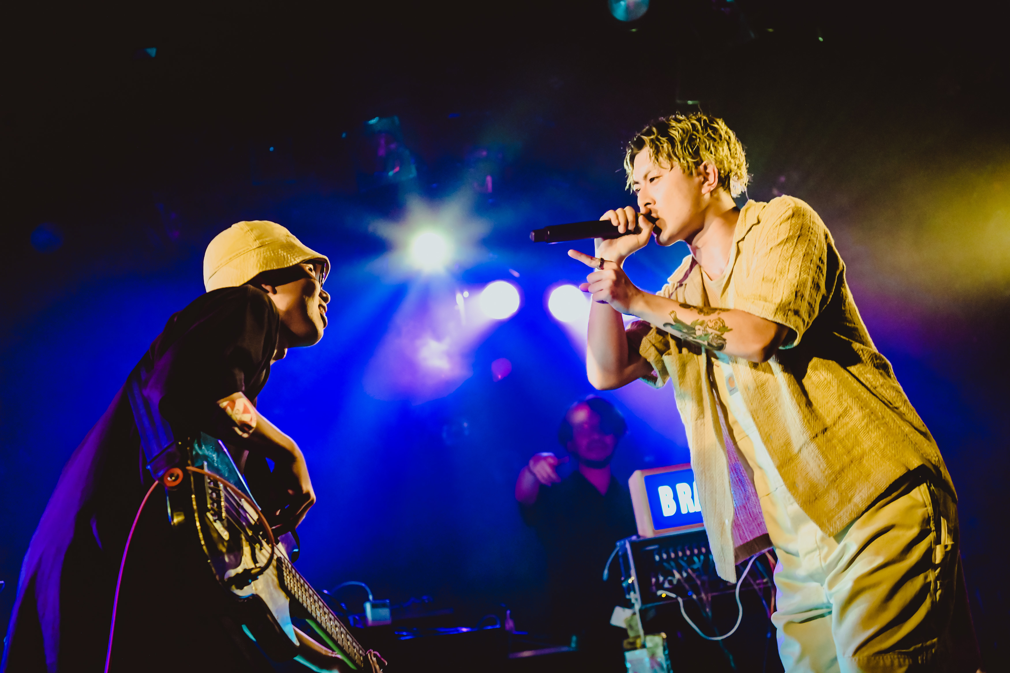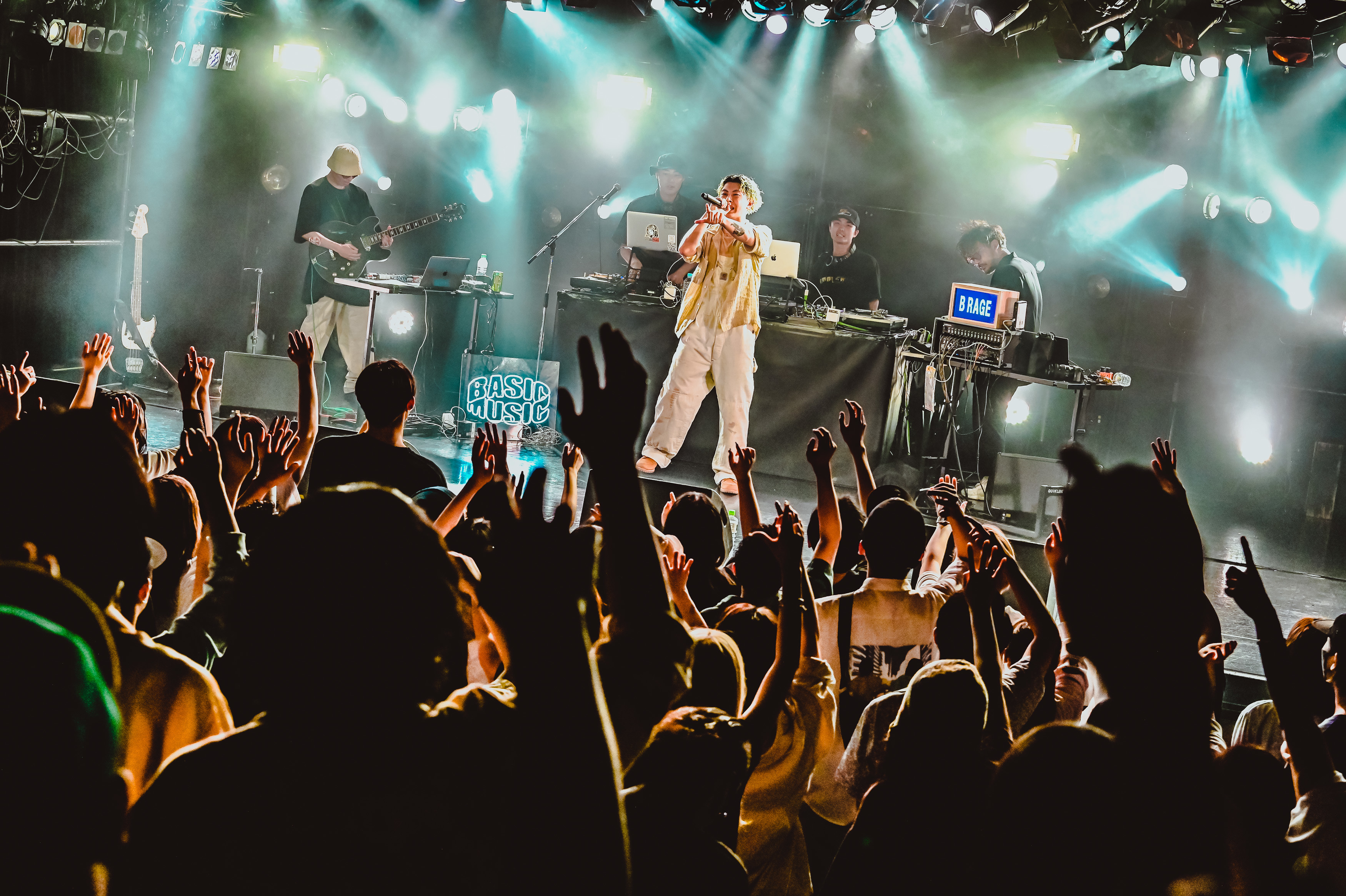 クアトロのステージには、Broth Works内のレーベル「BASIC MUSIC」のロゴがネオンで光り、DJセットとベース、ギター、シンセが設置されていた。オーディエンスは和やかな雰囲気でお酒を飲んだり談笑したり、思い思いに開演までの時を過ごす。