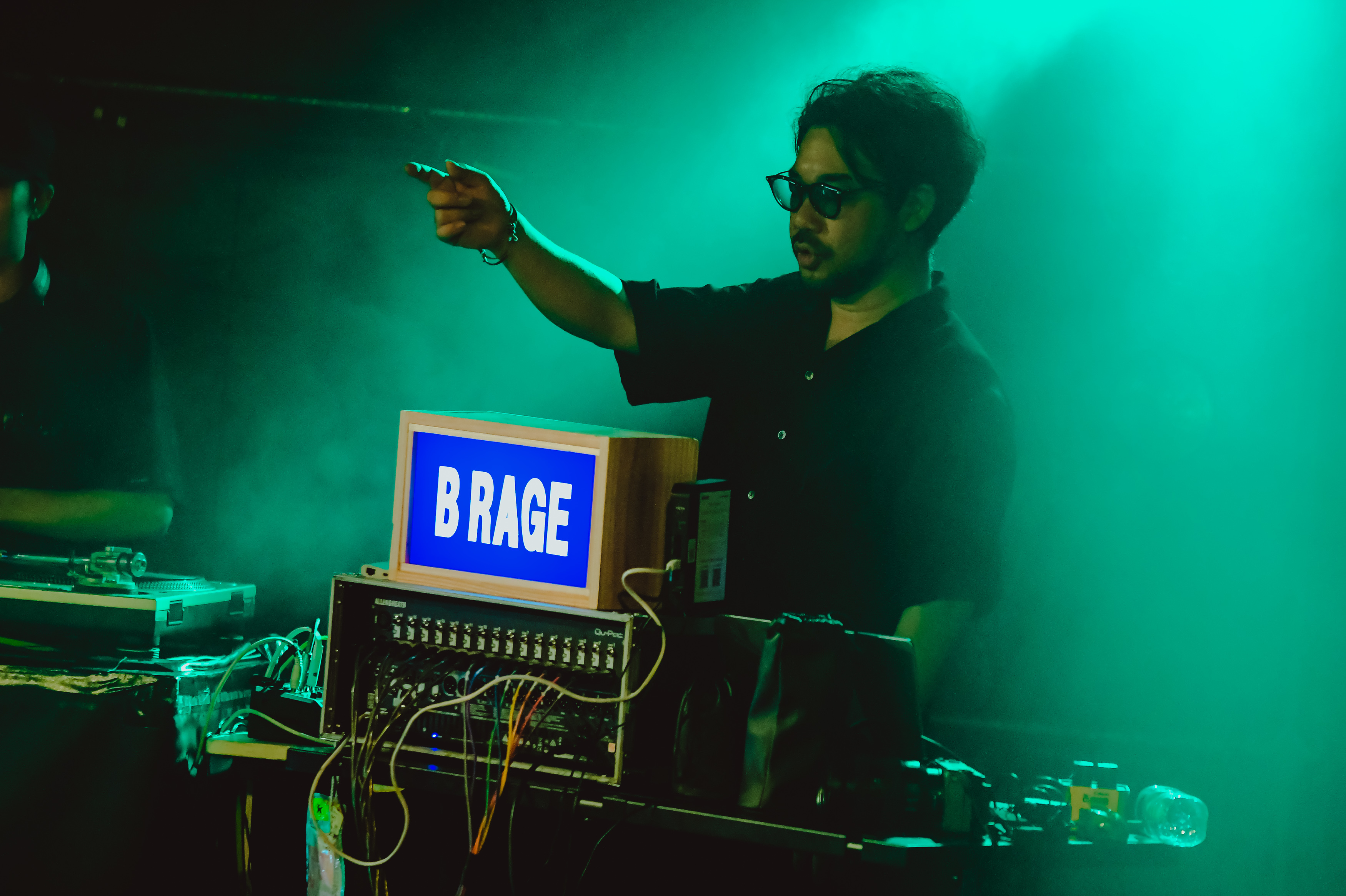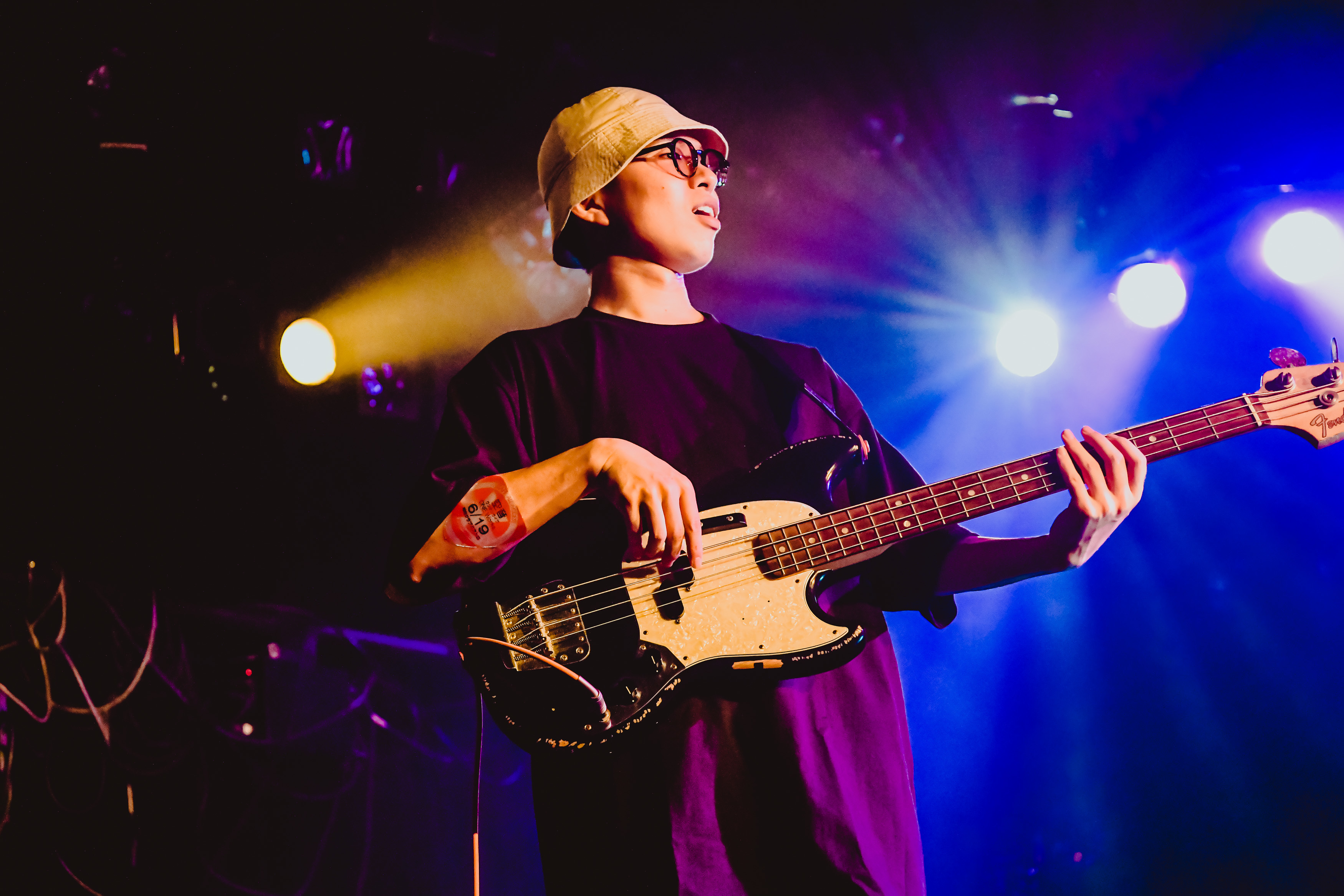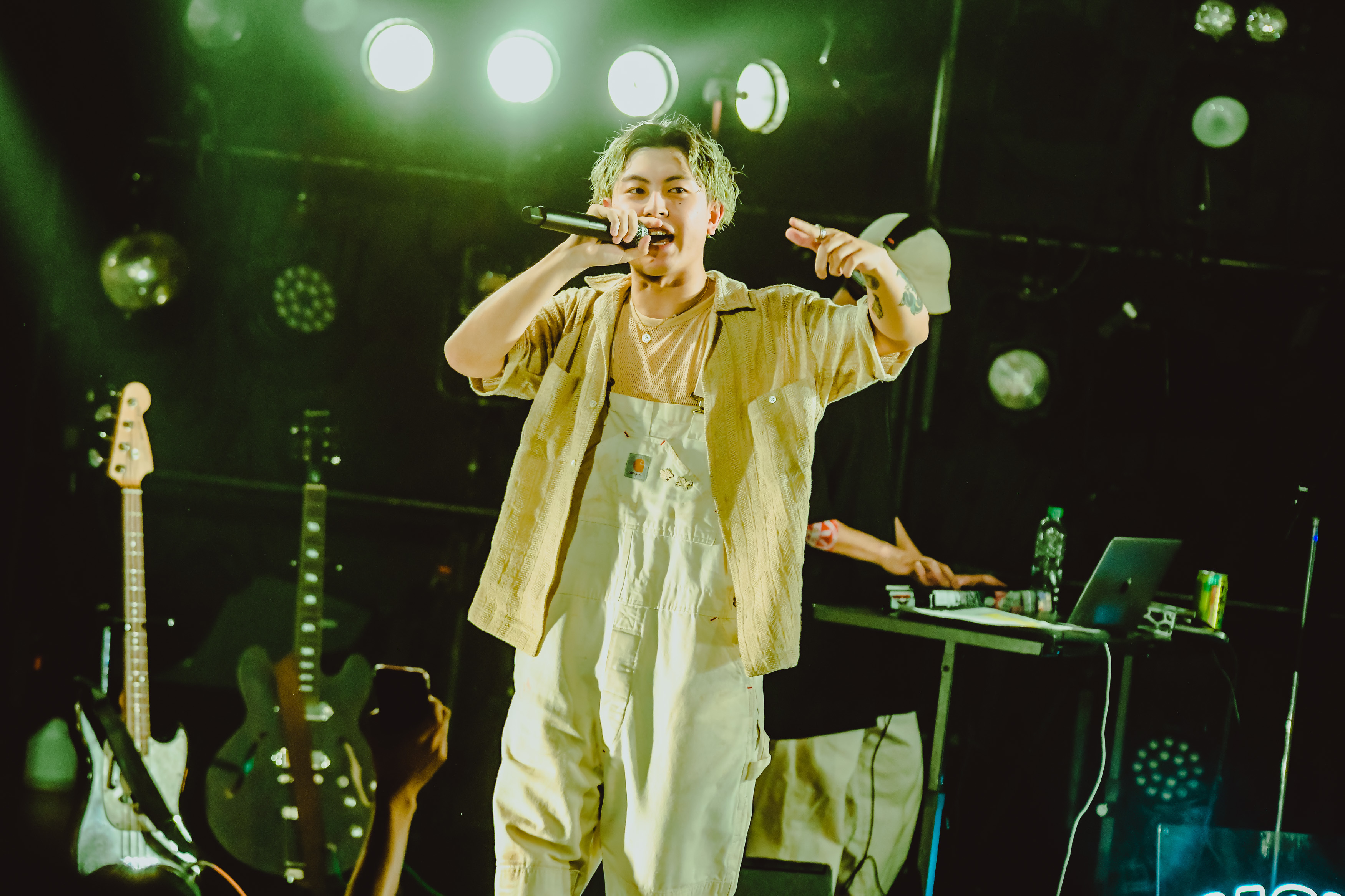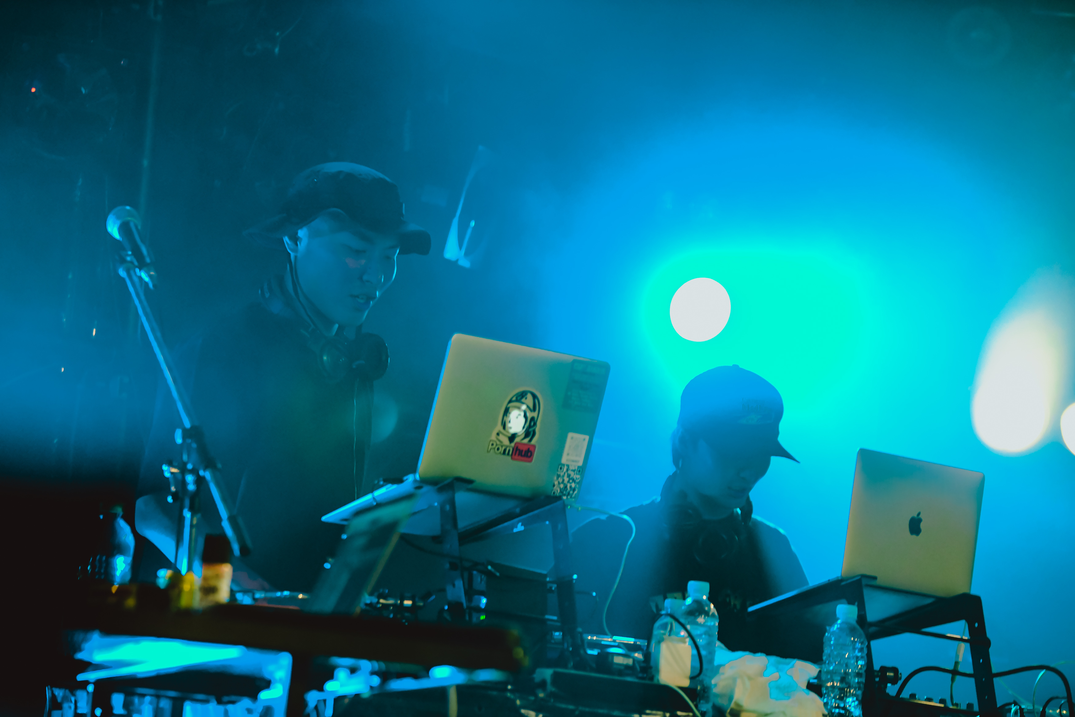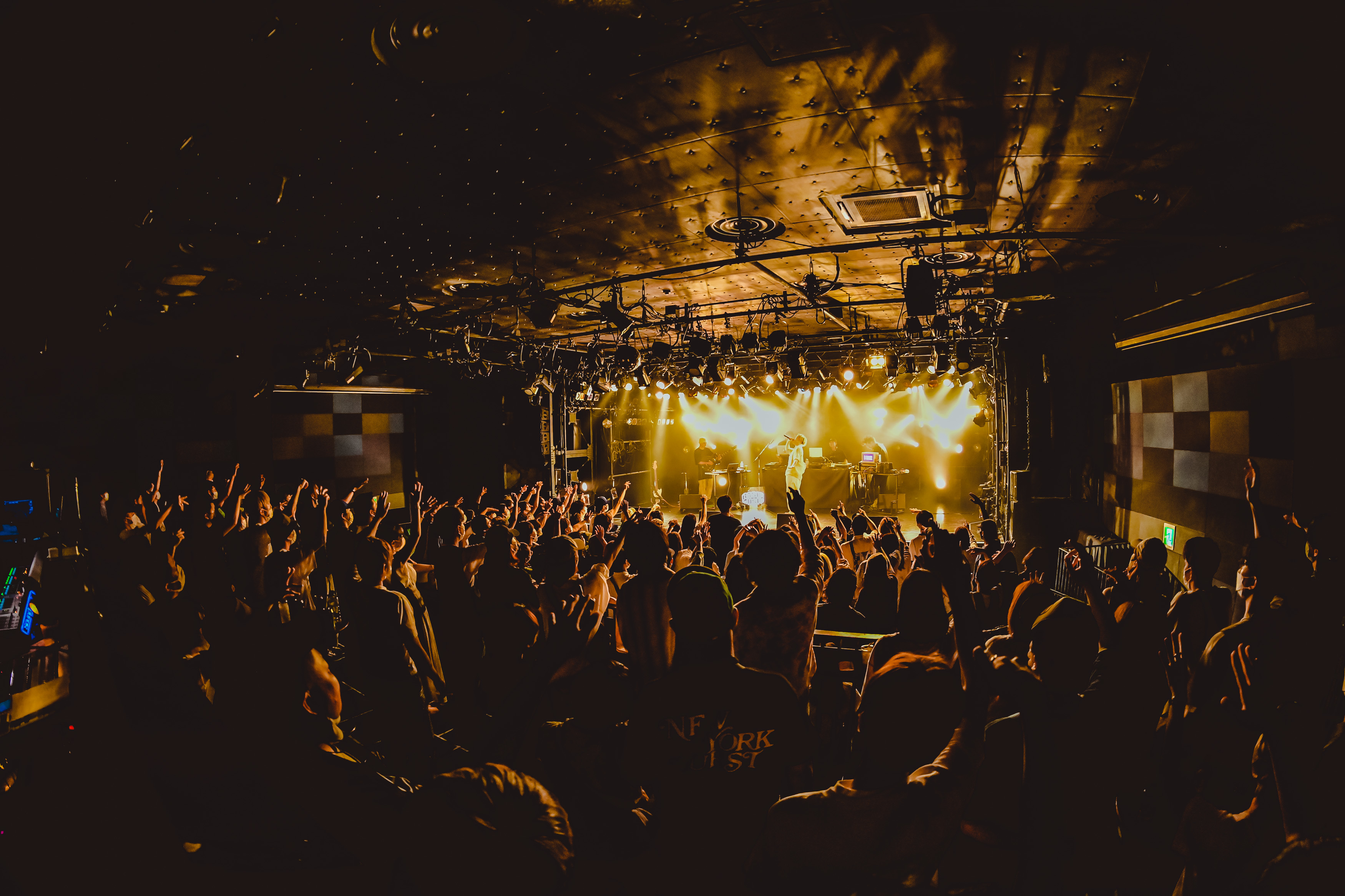 クアトロのステージには、Broth Works内のレーベル「BASIC MUSIC」のロゴがネオンで光り、DJセットとベース、ギター、シンセが設置されていた。オーディエンスは和やかな雰囲気でお酒を飲んだり談笑したり、思い思いに開演までの時を過ごす。